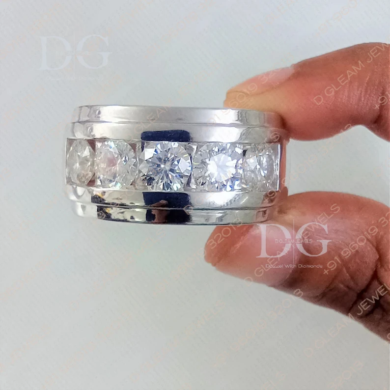 3.94 CTW Cut VVS1 Moissanite 14K White Gold Plated Five Stone Band Wedding Band Ring Eternity Wide Band for Men for Parties
