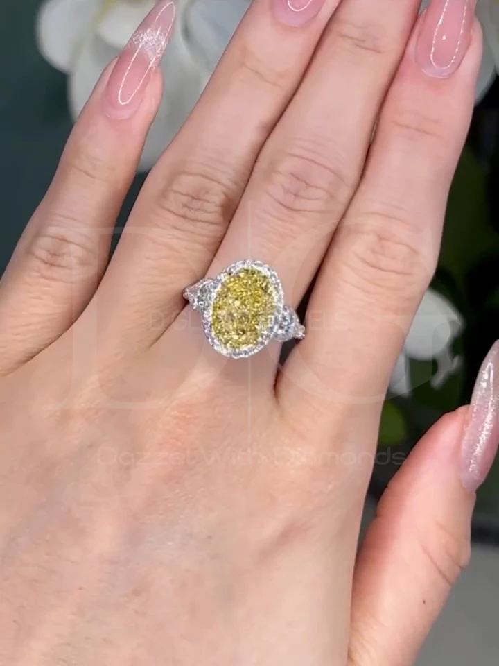 Oval Fancy Yellow 7.40tcw Lab Grown Diamond Halo Three Stone Ring | IGI Certified VVS-VS Clarity Three Stone Engagement Ring