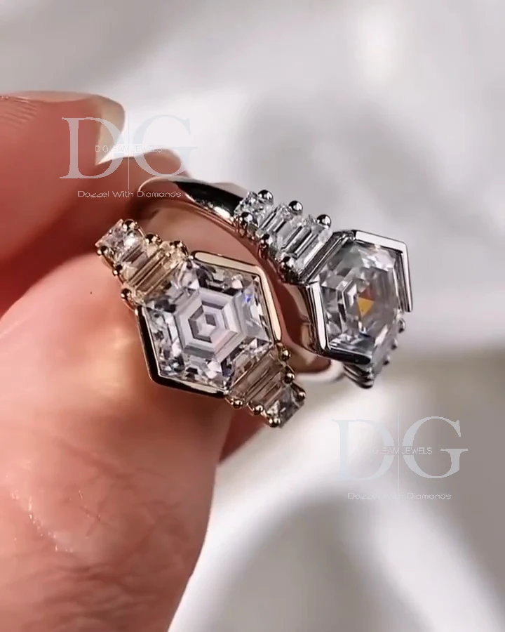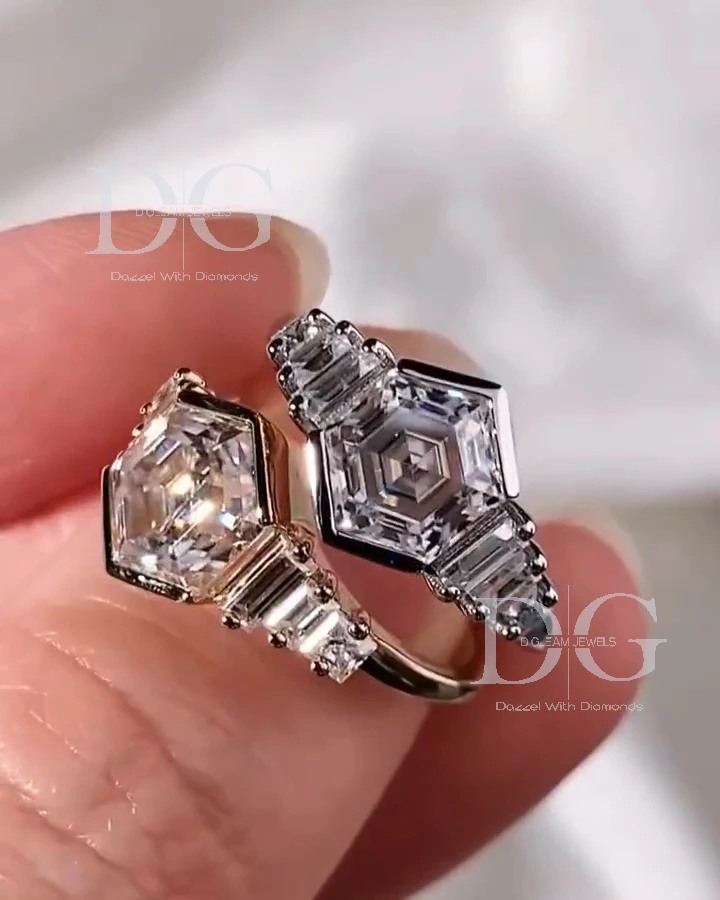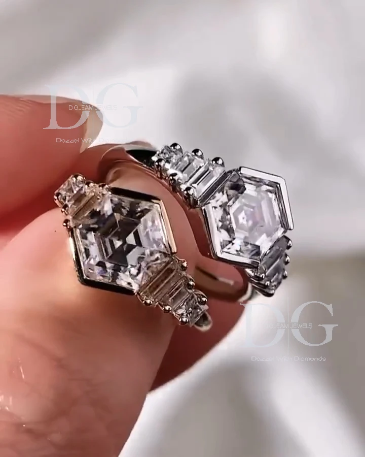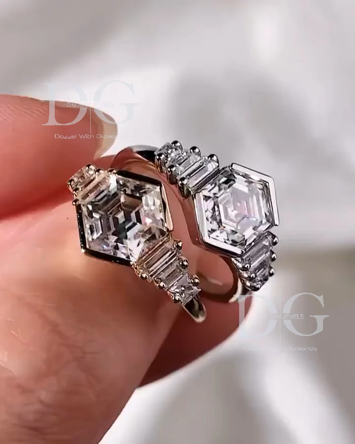 4.00 Carat Hexagon Cut Lab Grown Diamond 3 Stone Engagement Wedding Anniversary Gift Party Ring IGI Side Baguette Cut Knife Edge