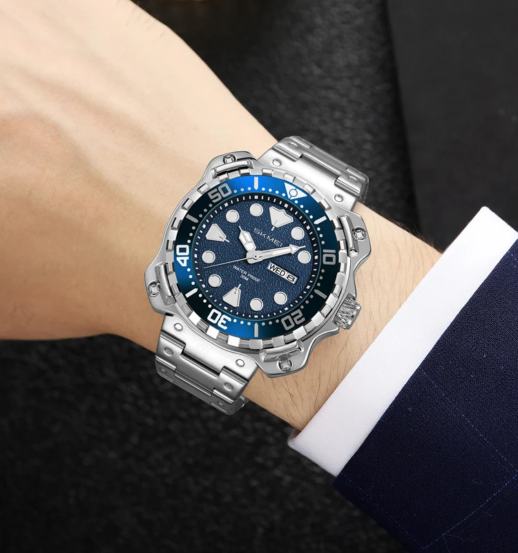 Skmei 9348 Luxury Charm Cartoon Auto Date Luminous Pointer Stainless Steel Strap Water Resistant Business Watch for Men
