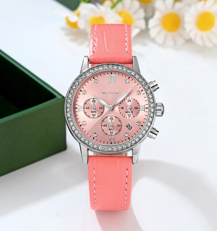 SKMEI Business Stone Circle Case Quartz Watch with Glass Dial 16mm Leather Strap for Women