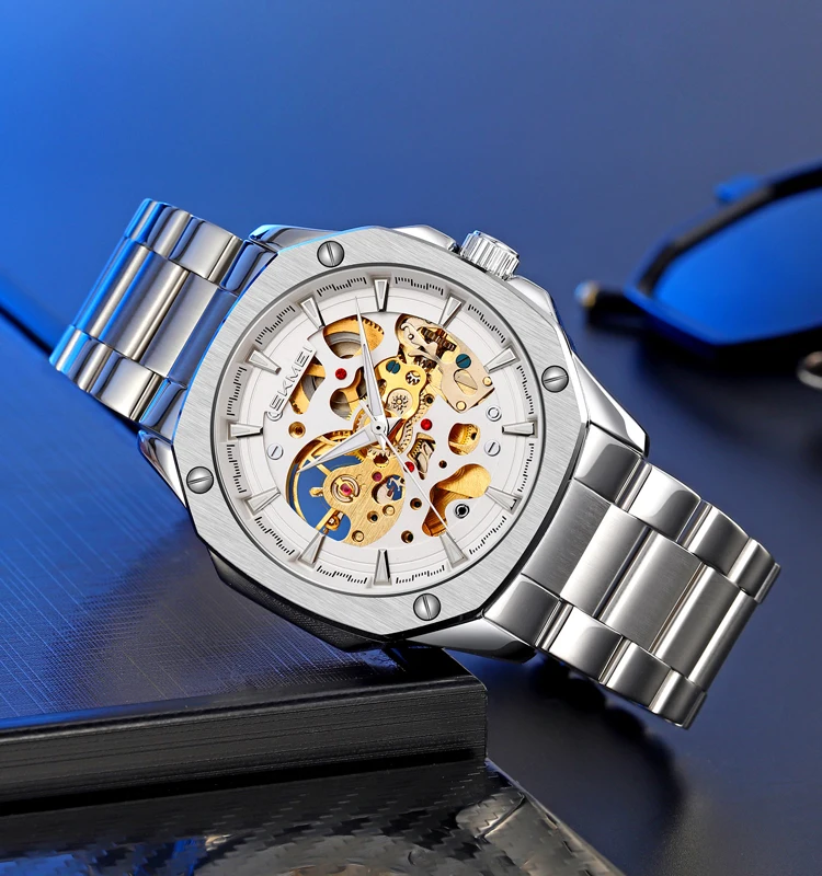 Classic Men's Mechanical Analog Glass Wrist Watch Solid Stainless Steel Strap Automatic Minimalist Design 5mm Thick Luxury Band