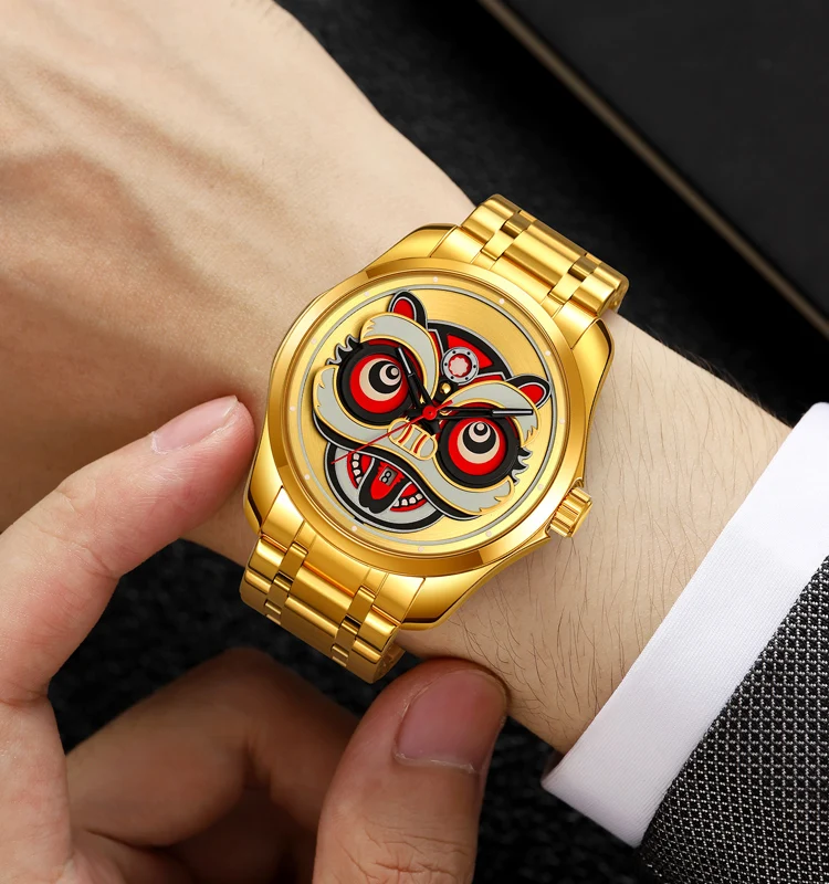 SKMEI 9386 Chinese lion Awakening Pattern, Auspicious Quartz Watch, Luxury Stainless Steel Deep Waterproof