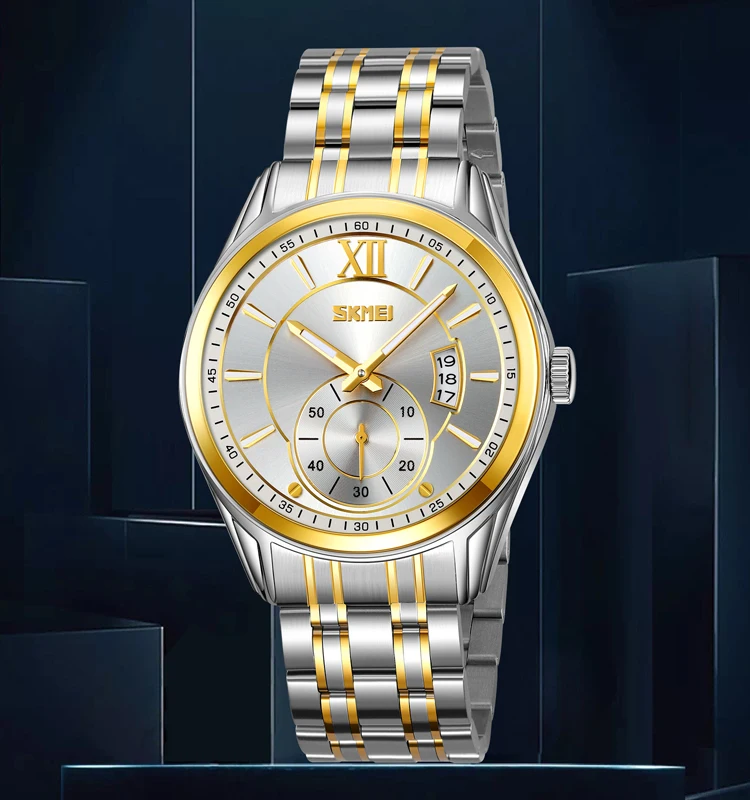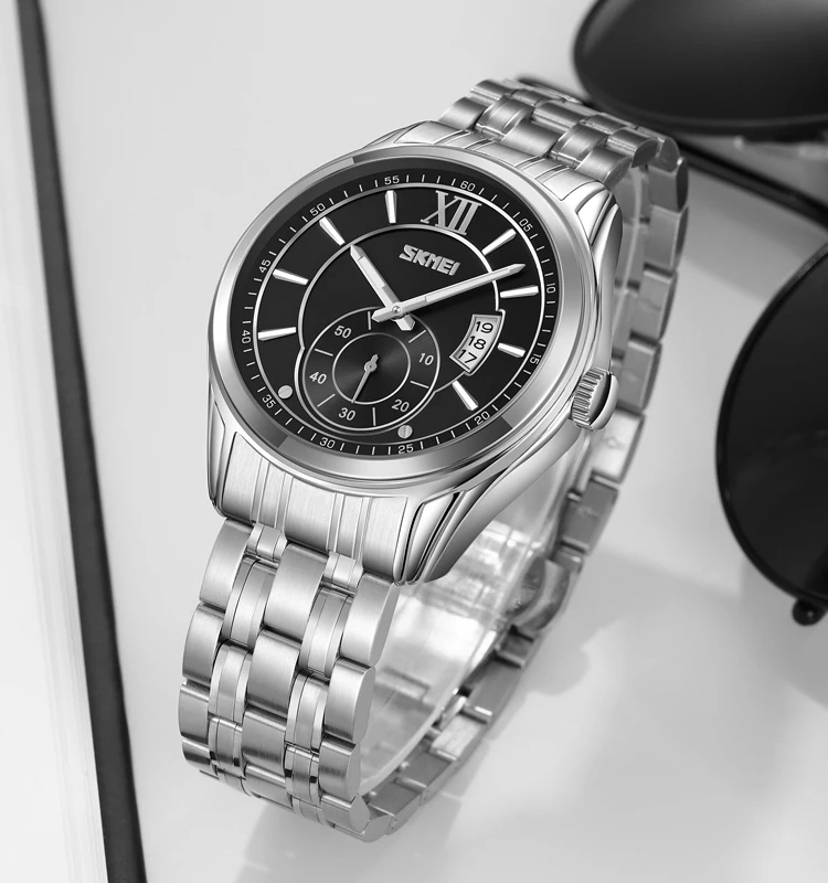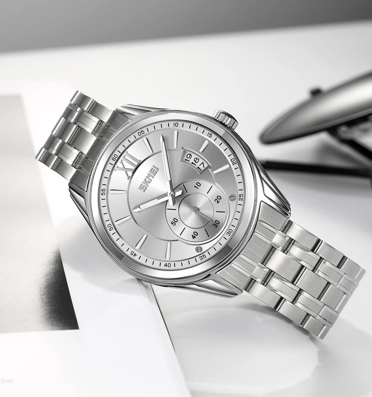 Skmei 9348 Auto Date Luminous Pointer Stainless Steel Strap Business Watch for Men Fashion Waterproof Quartz Antique Retro Sport