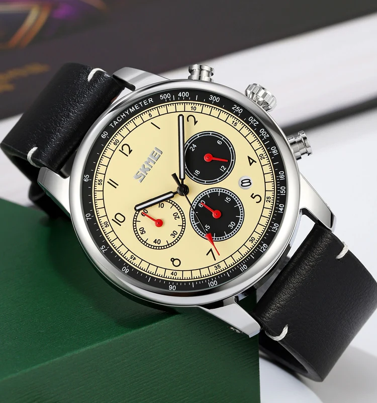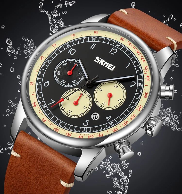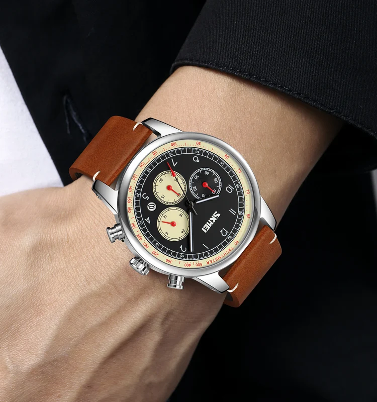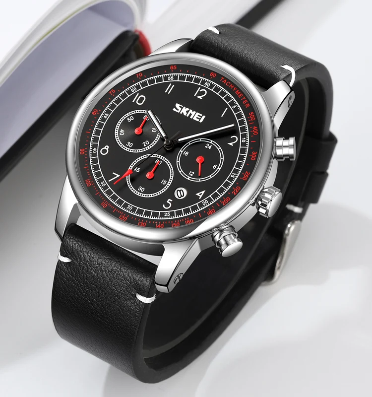 SKMEI 9318 Leather Strap Business Classic Fashion Three Eyes Six Needles Small Dial Waterproof Glass Men's Quartz Watch