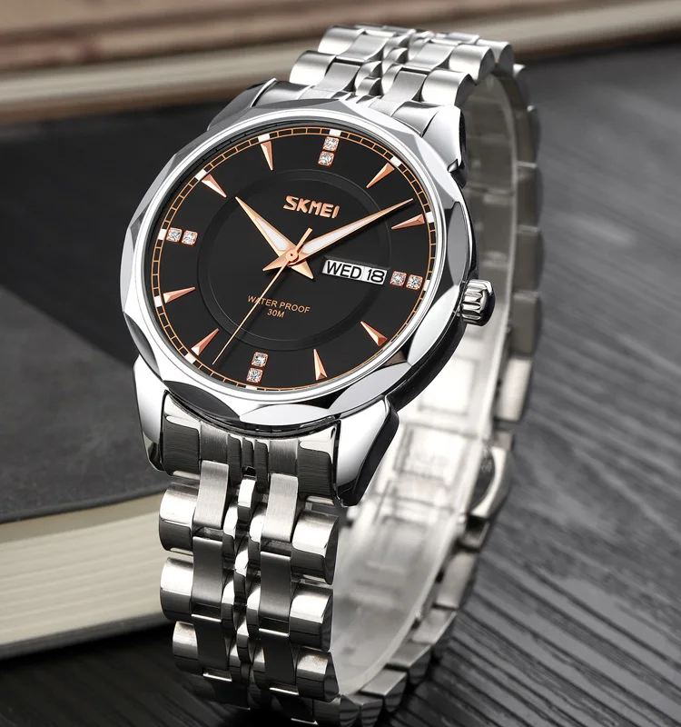 Skmei 9268 40mm Quartz Movement Stainless Steel Band Luxury Business Fashion Glass Dial Pointer Hands 3BAR Water Resistant New