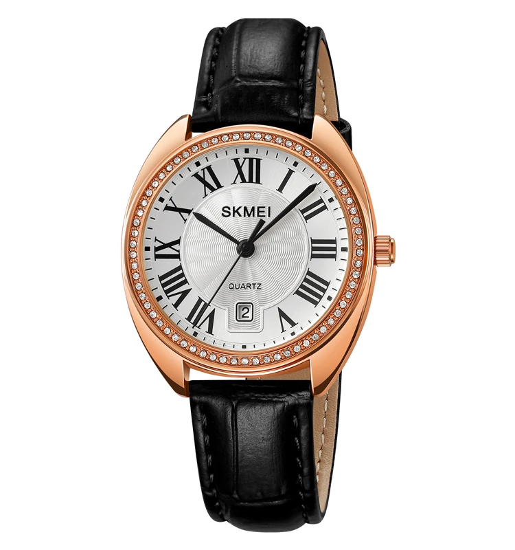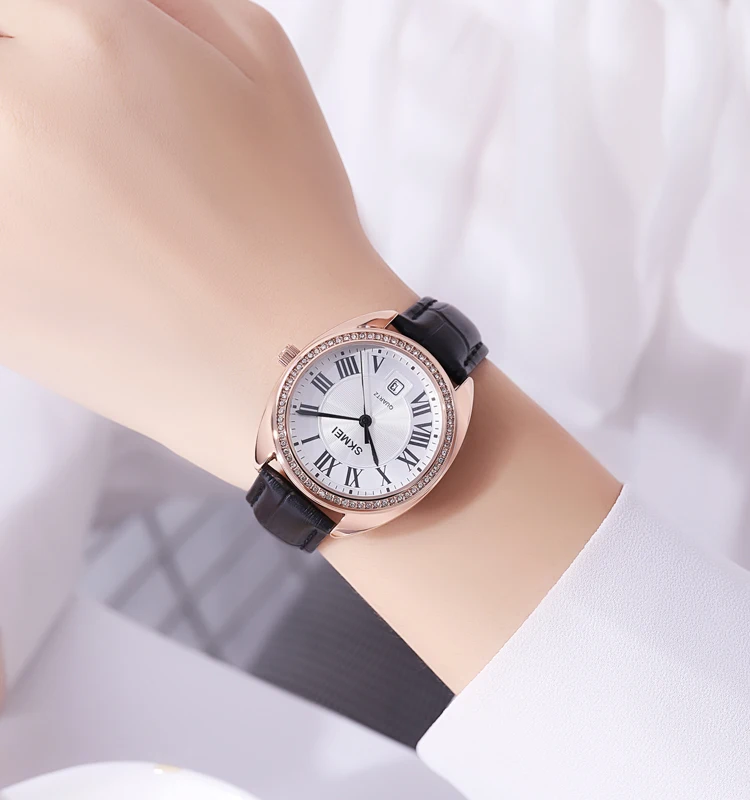 China Factory SKMEI 2183 Diamond Luxury Genuine Leather Strap Watch Lady Quartz Date Trending Watch Gift Box