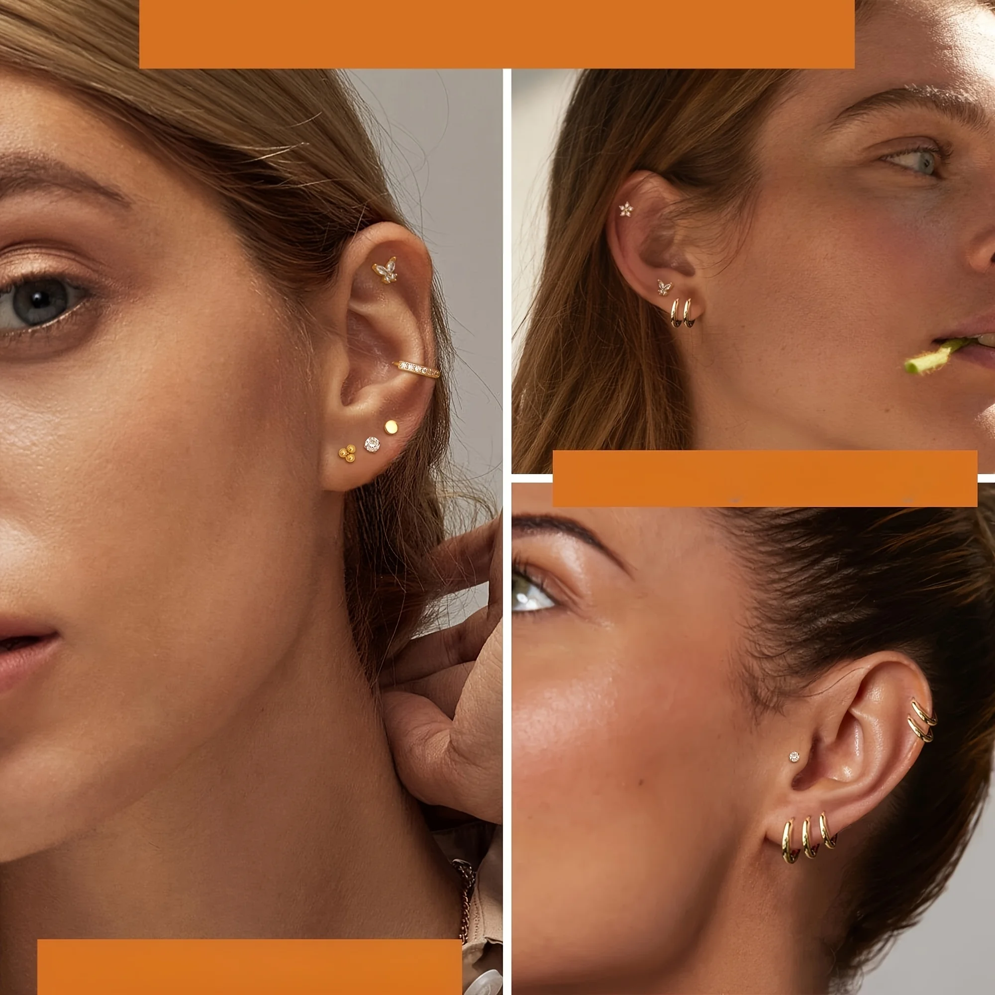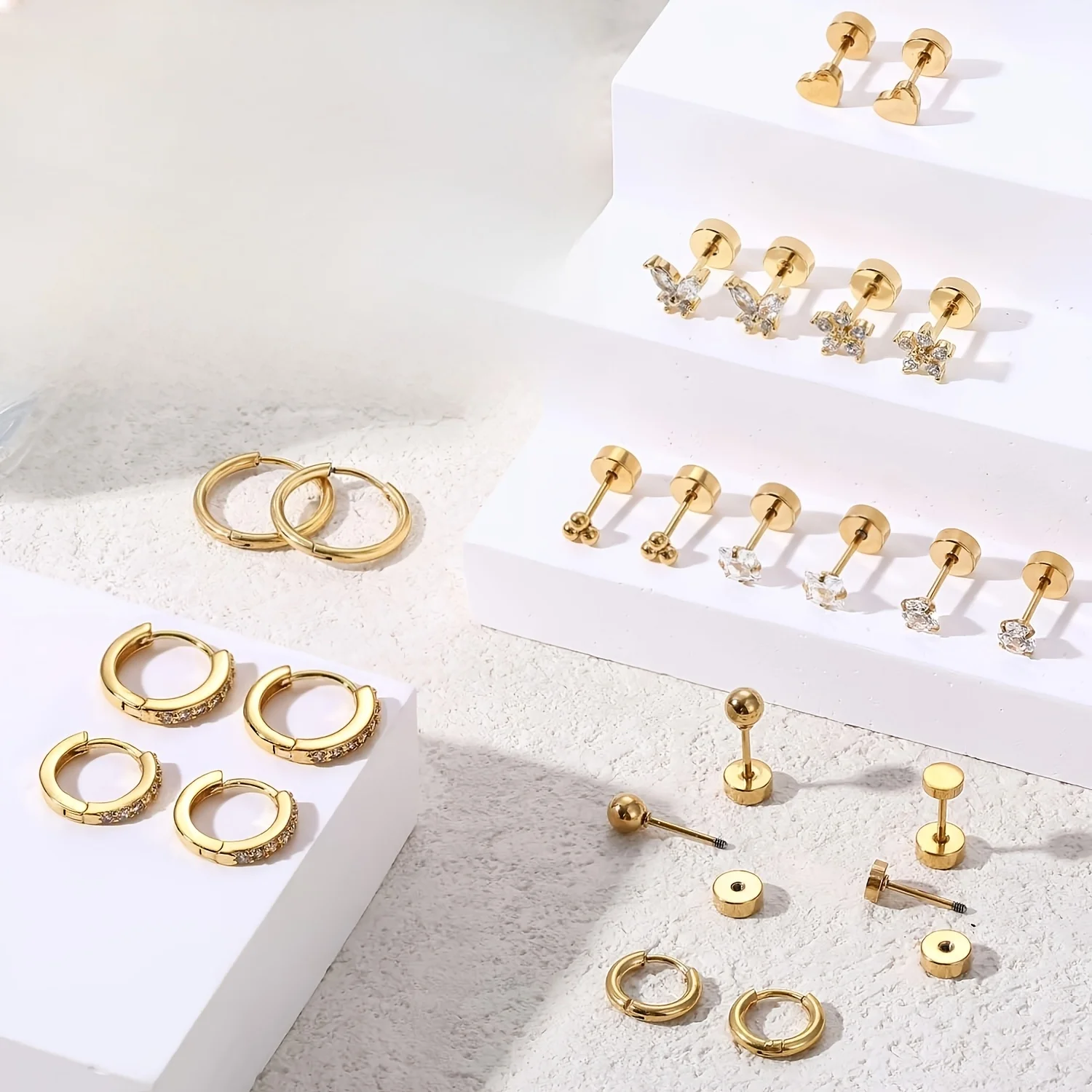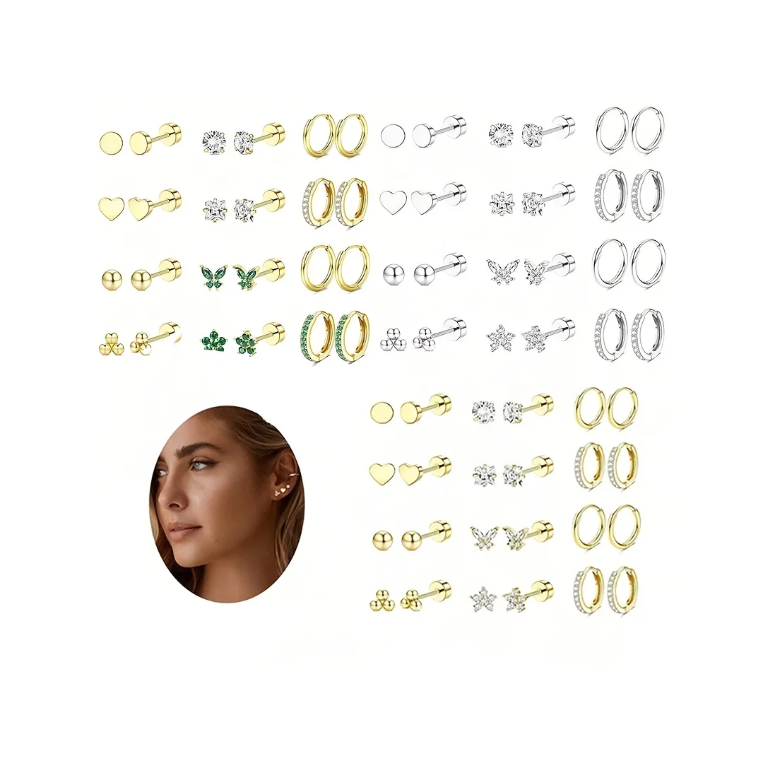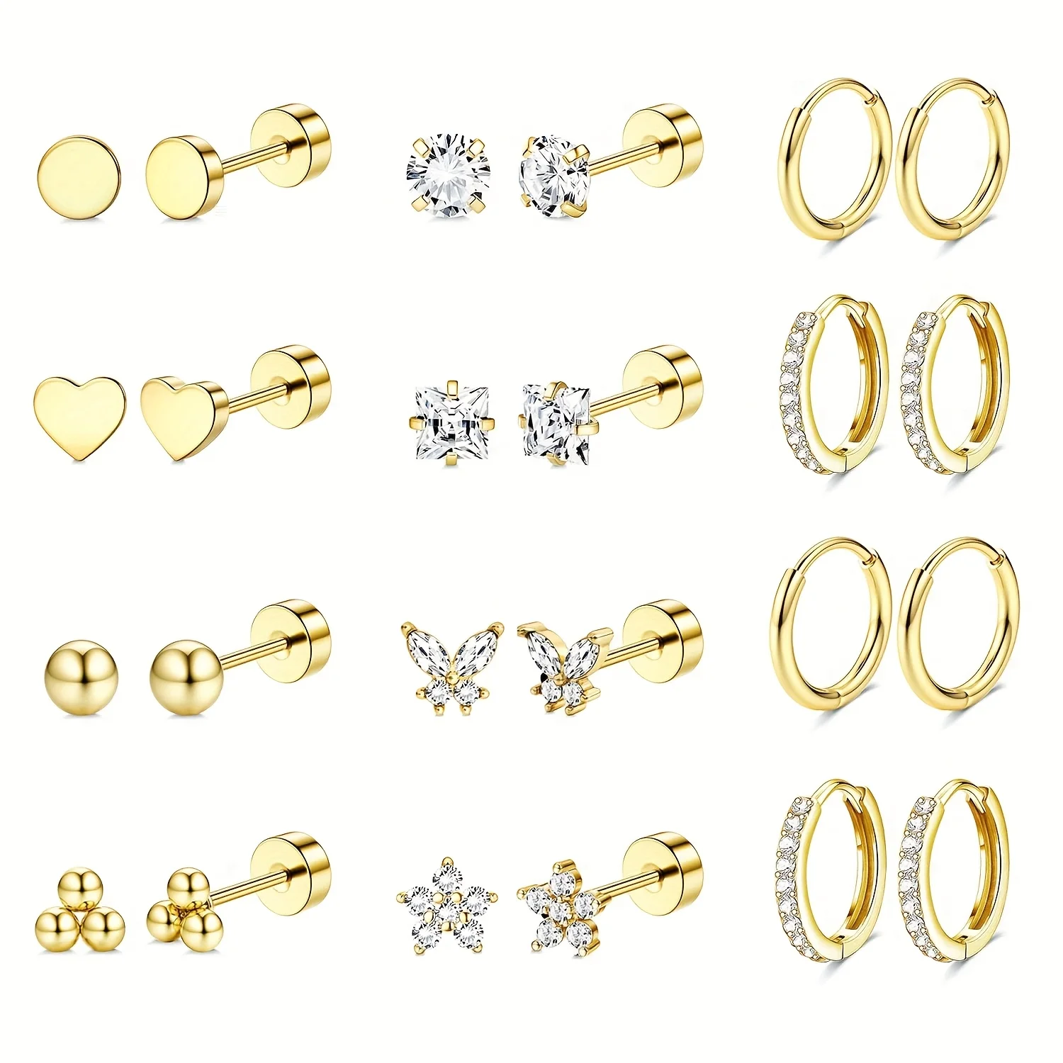 24pcs Trendy Hypoallergenic Stainless Steel Flat Back Cartilage Zircon Huggie Hoop Earrings 14K Gold