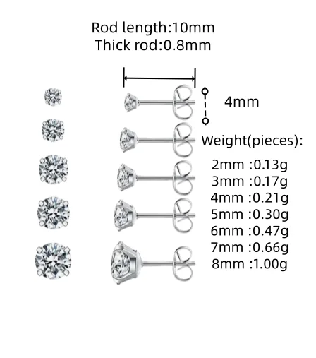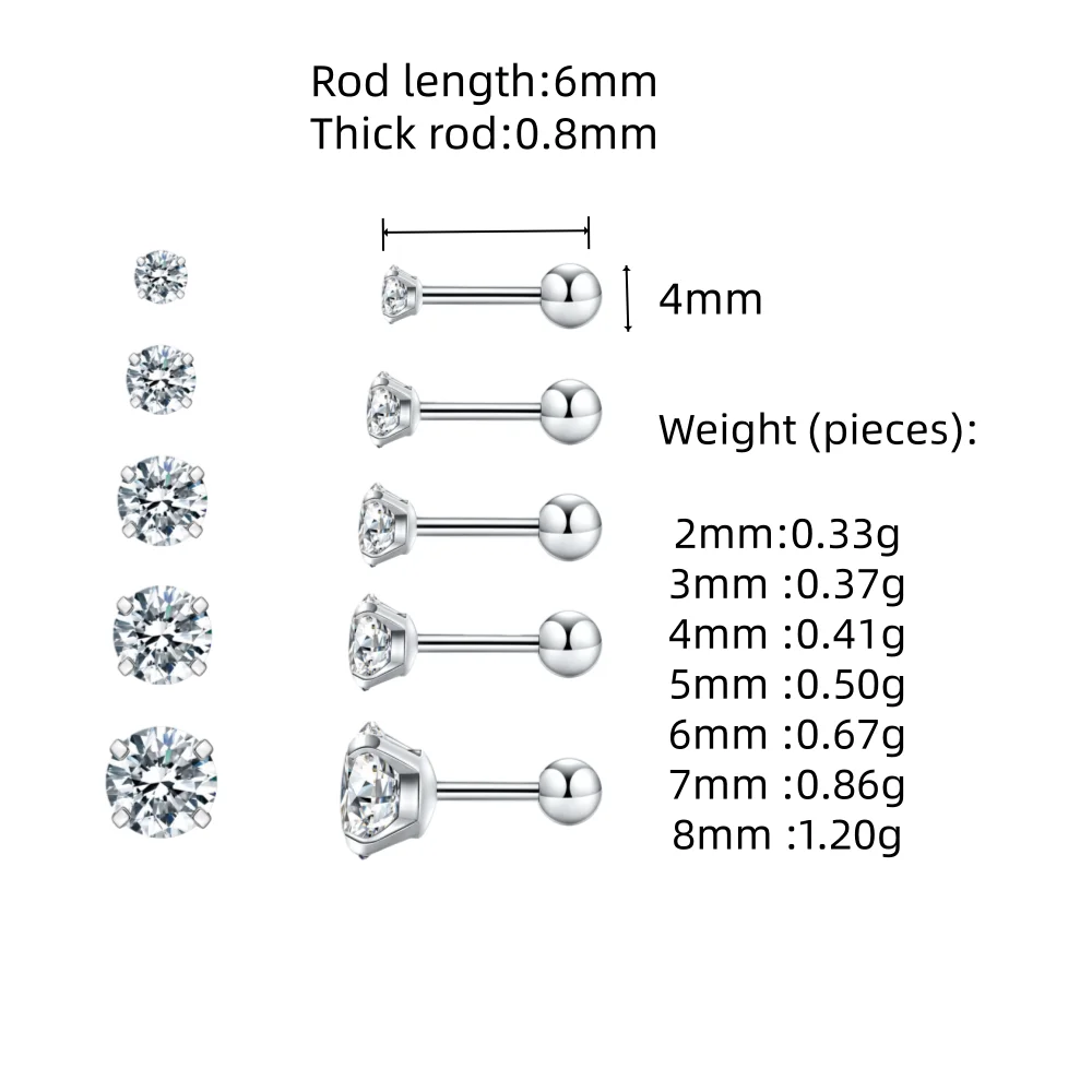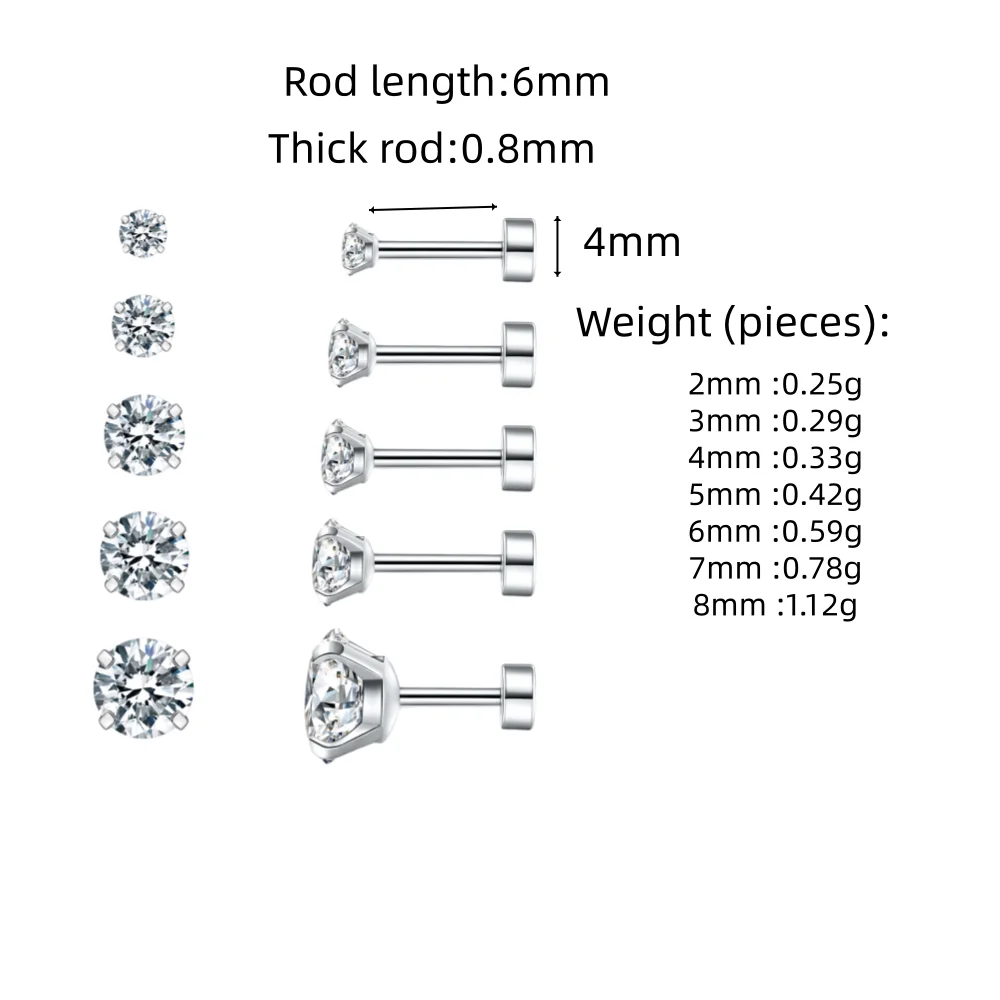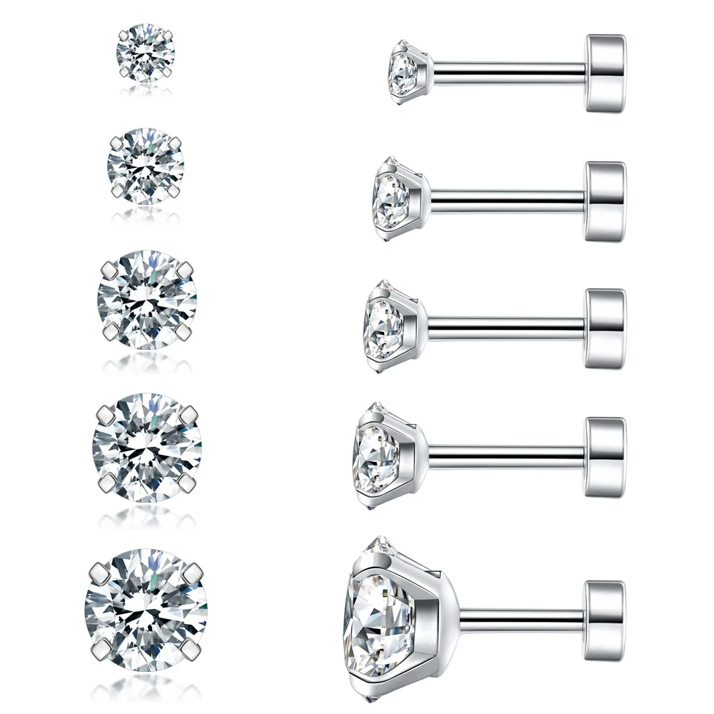 Hypoallergenic Cubic Zirconia Earrings Surgical Steel Flat Back Studs for Cartilage, Screw Back Fashion Jewelry