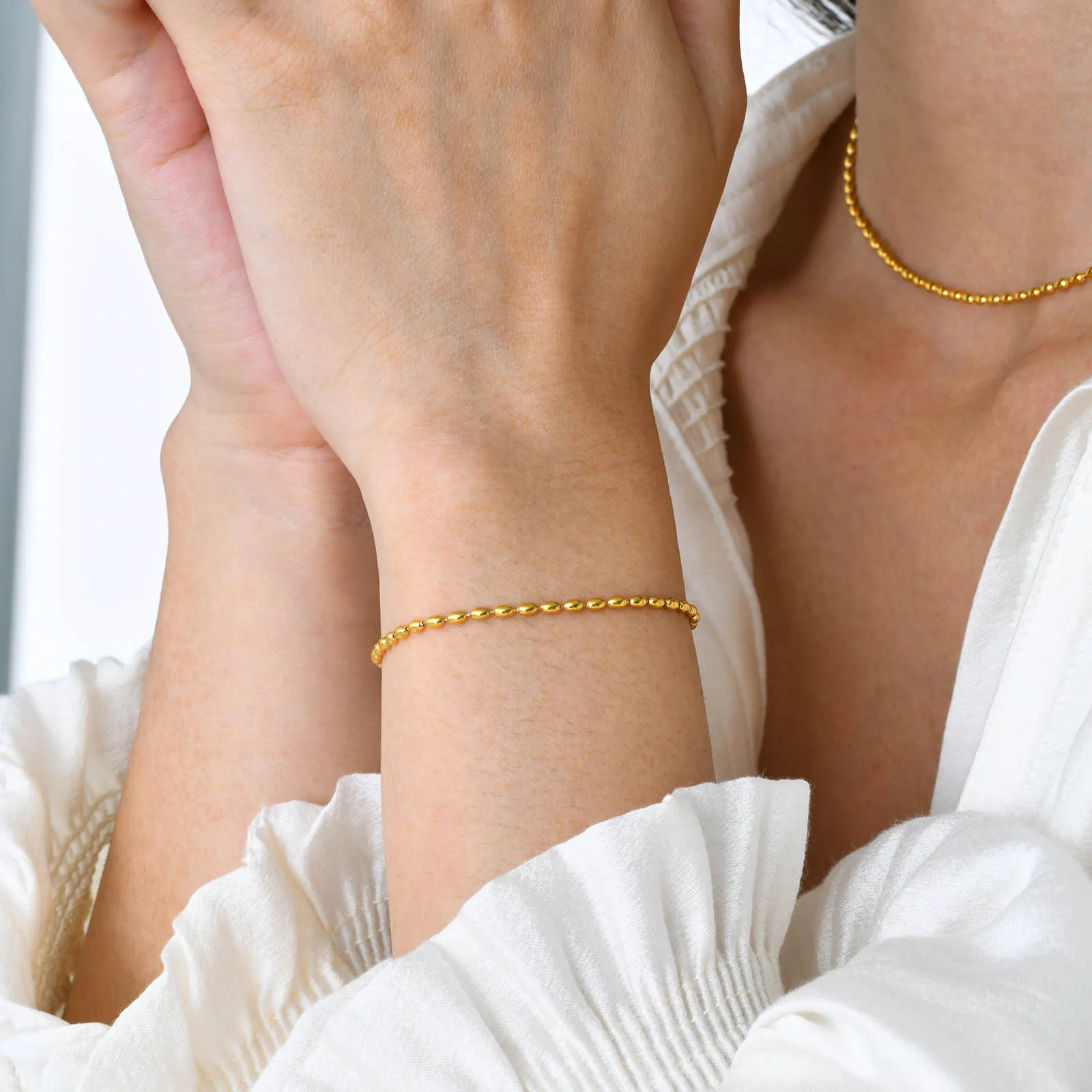 Women's 18K Gold Plated Trendy Minimalist Rugby Beaded Adjustable Stainless Steel Bracelet for Anniversary Gift
