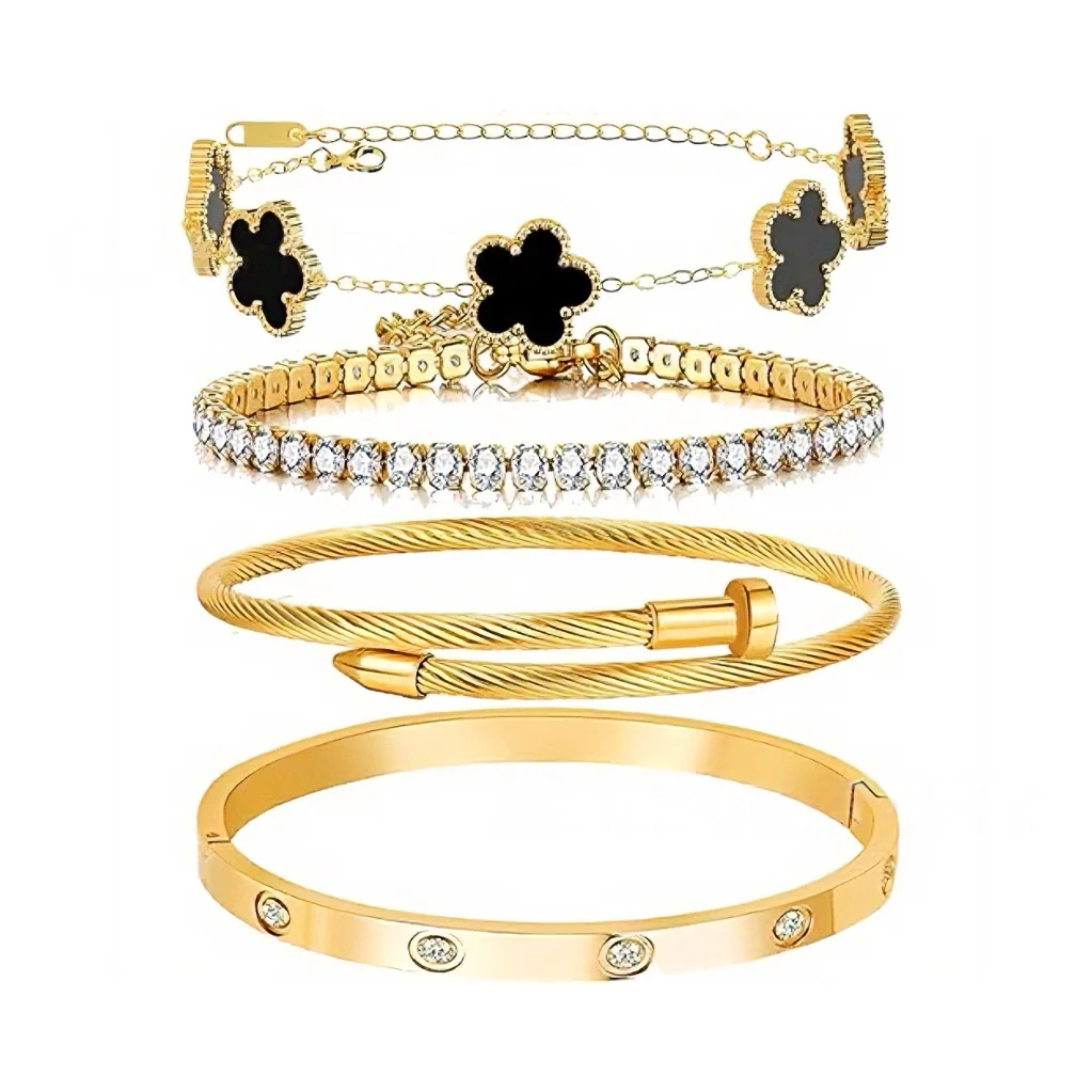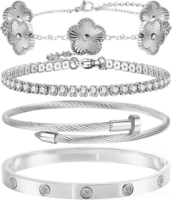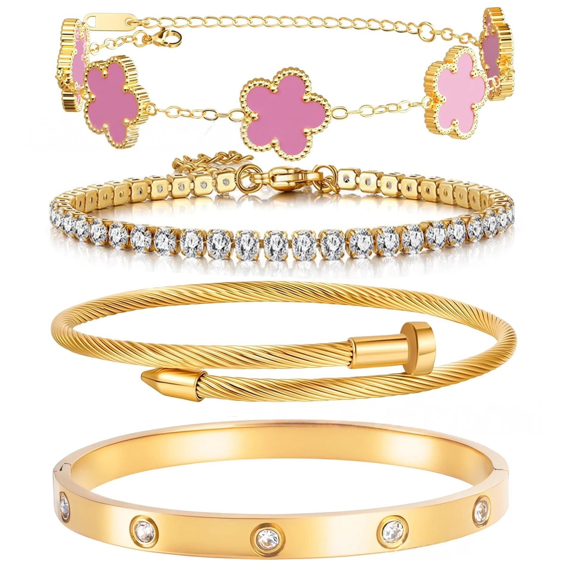 Fashion Zircon Love Five Clover Tennis 316L Stainless Steel 18K Gold Plated Classic Women's Party Bangle Bracelets Four Piece