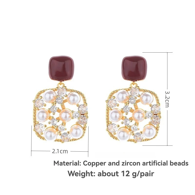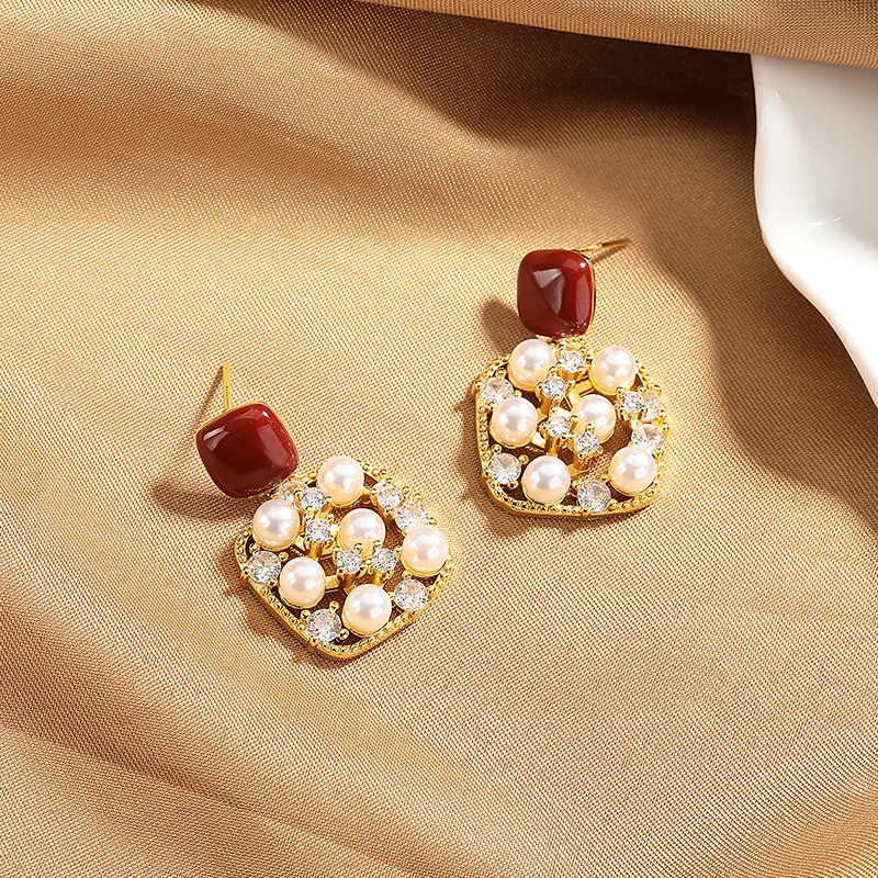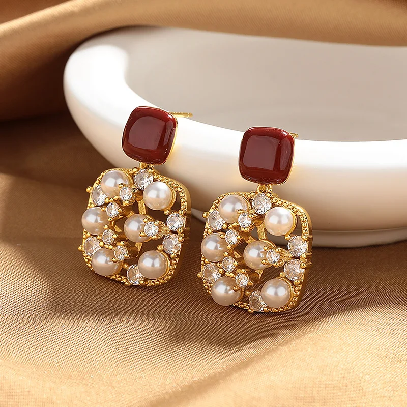 High-end Trendy Sparkling Zircon Pearl Earrings for Women Elegant Ancola Red Enamel Studs Versatile
