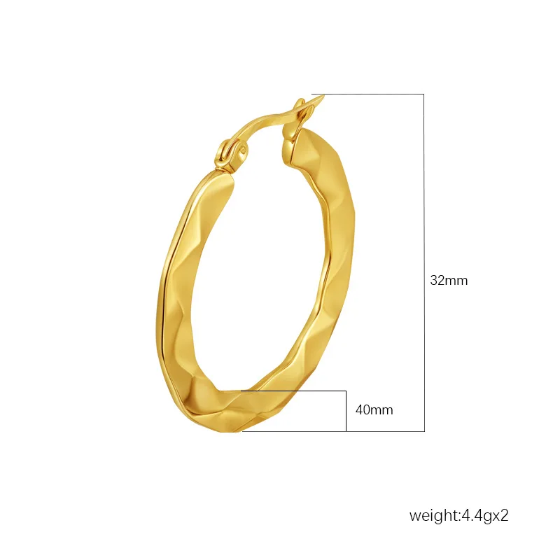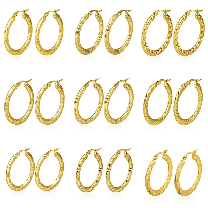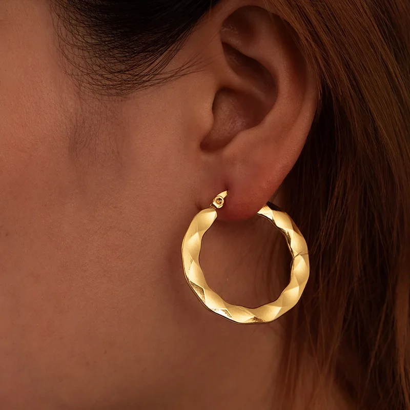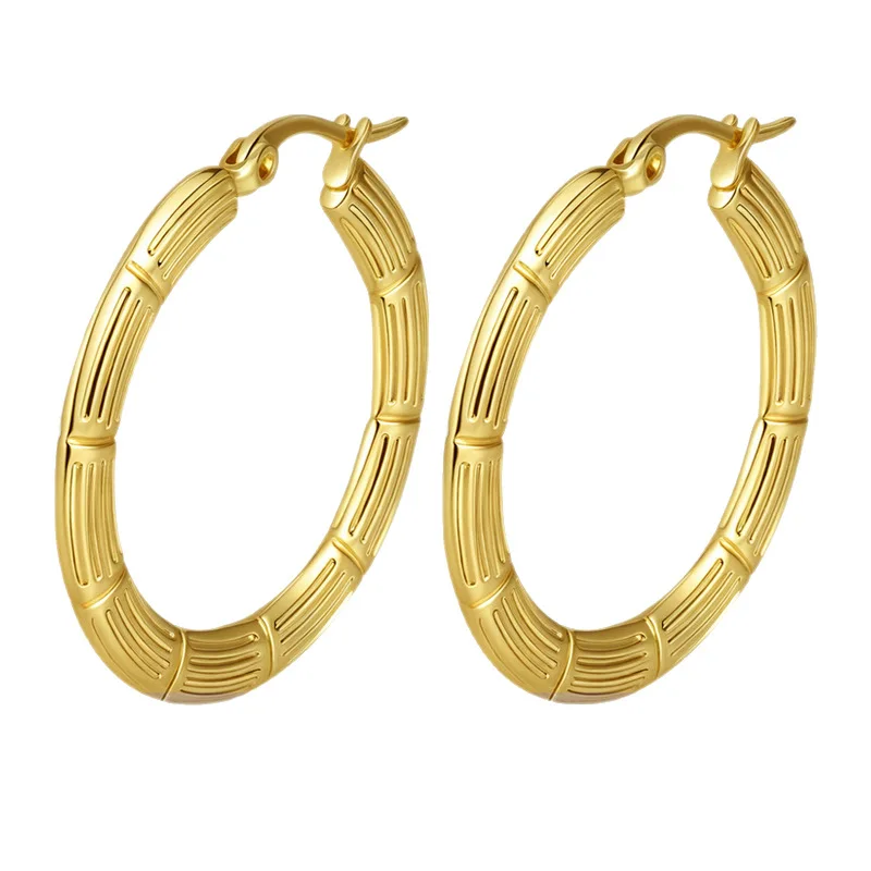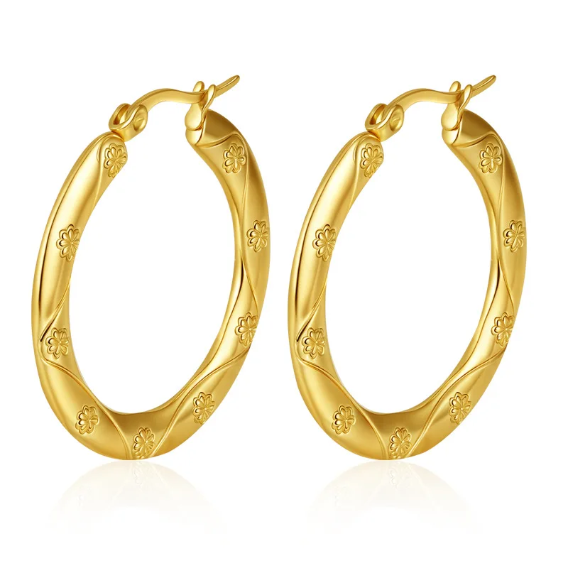 Stainless Steel Geometric Trendy Hand Engraved Round Hoop Earrings with Gold-color Plating (1.18 Inch Diameter)