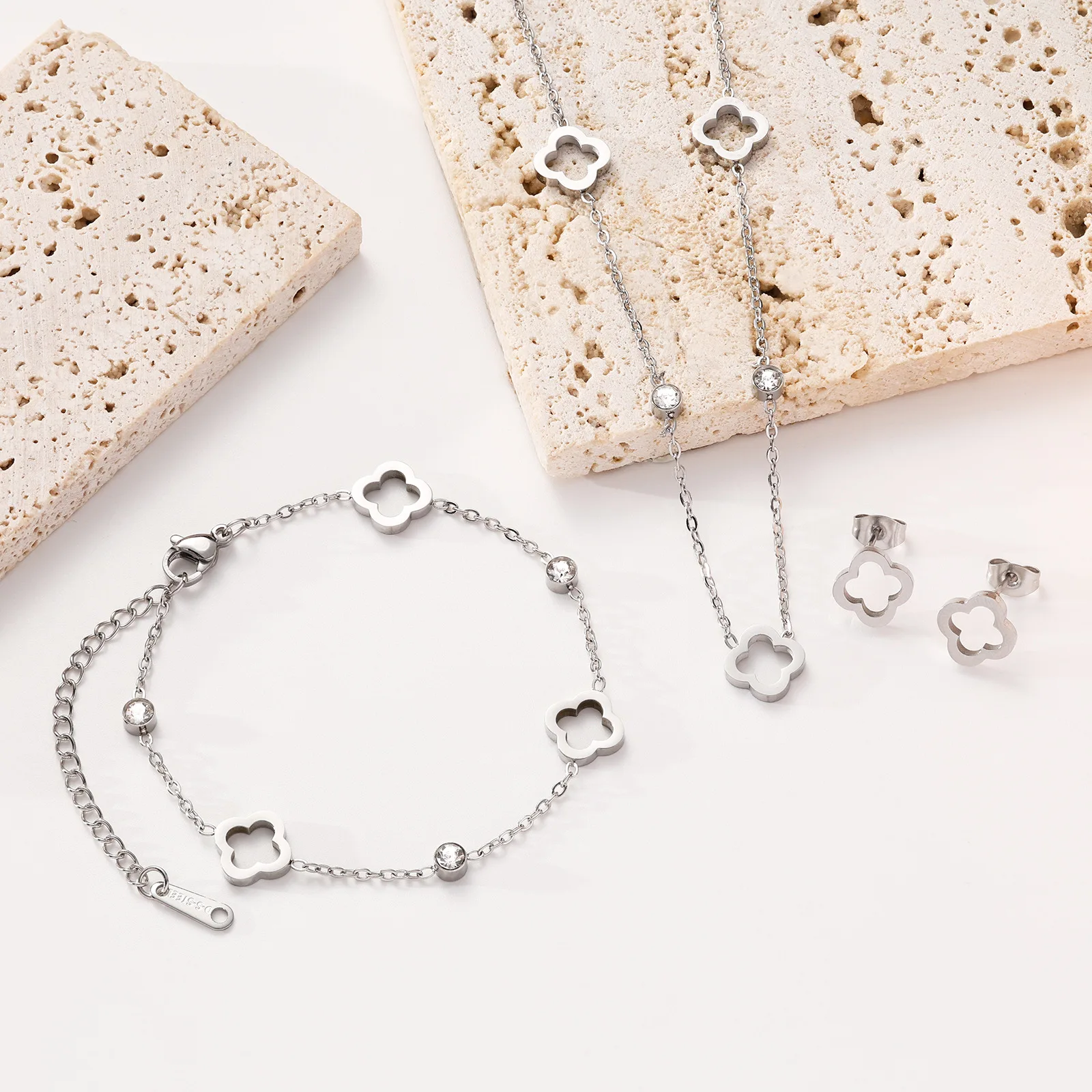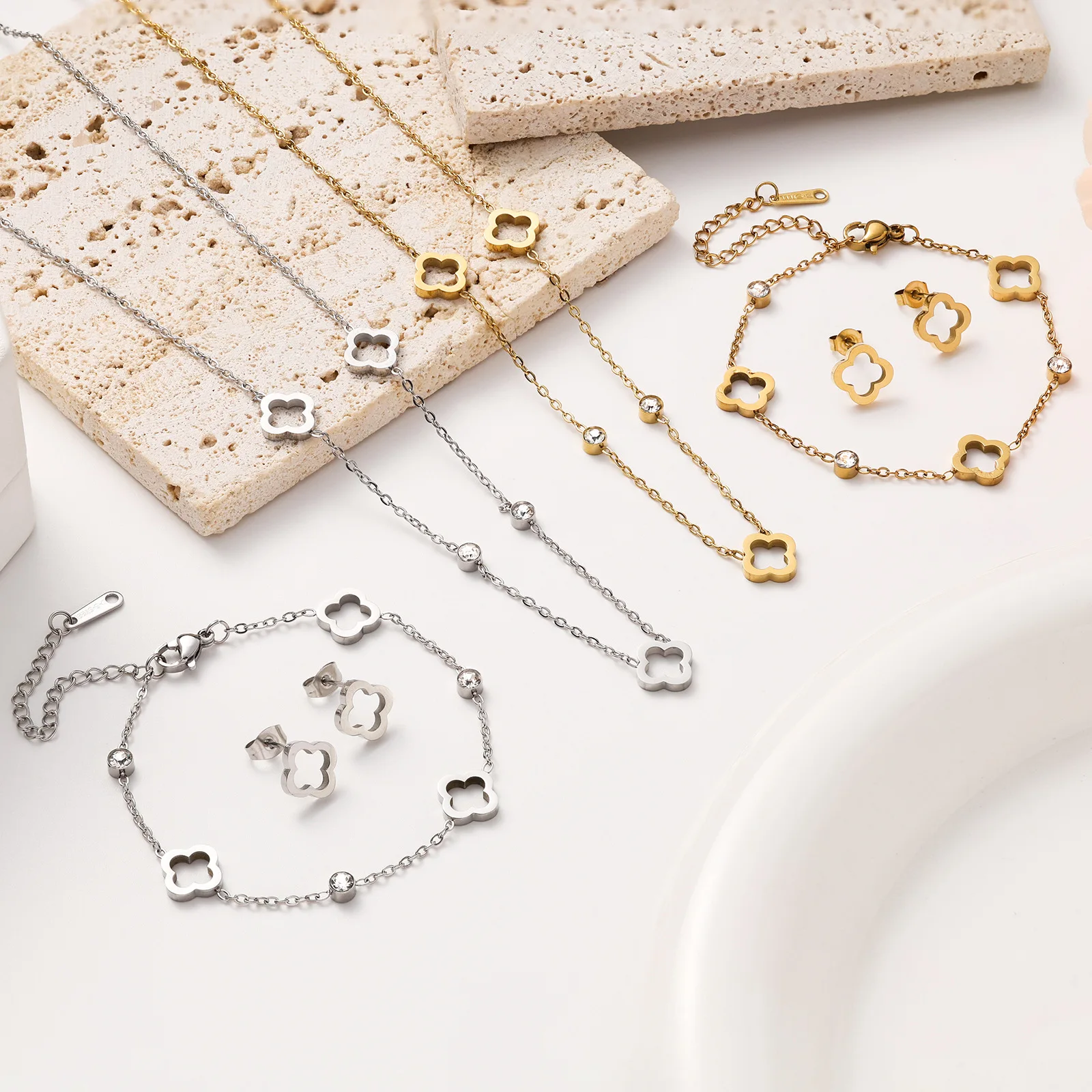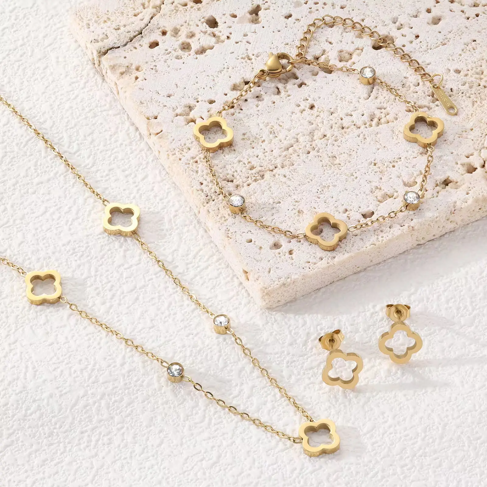 Lucky Clover Trendy Jewelry Set Titanium Steel 18k Gold Plated Hollow Necklace Bracelet Ear Studs Tarnish Free for Woman