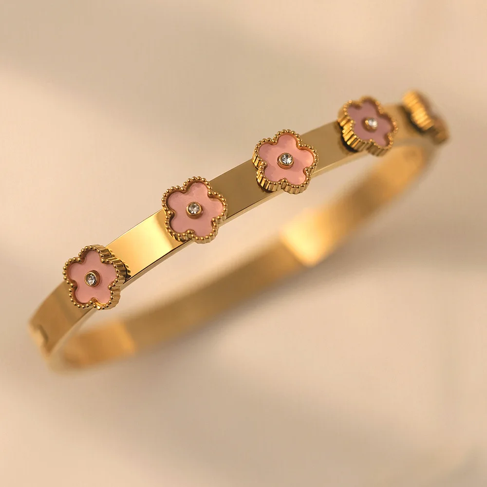New Style Trendy Five Leaf Clover 18K Gold Plated Stainless Steel Bangle Bracelet