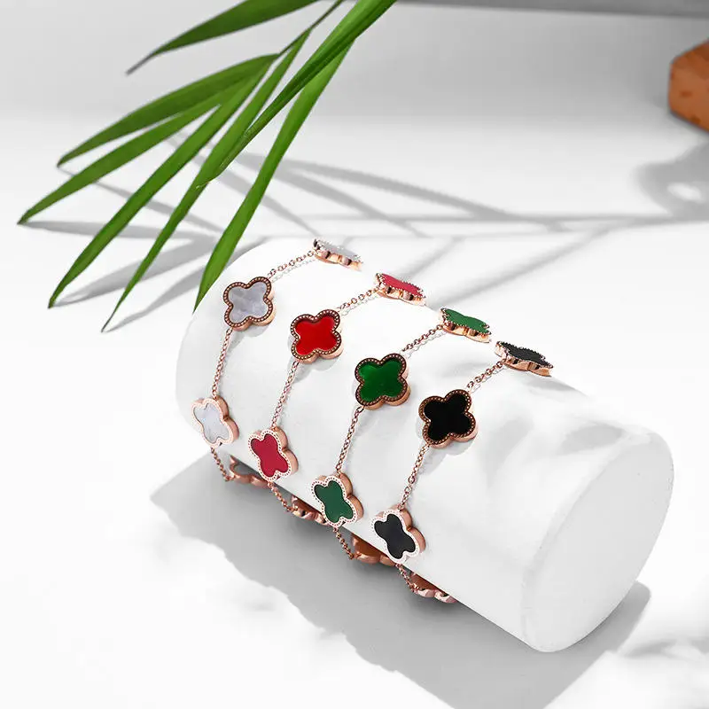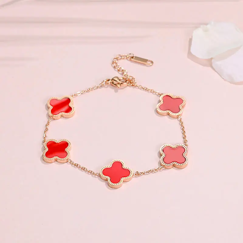 Stainless Steel Trendy Four Leaf Clover Pendant Chain & Link Bracelet Gold Plated Flower Design for Women Girls