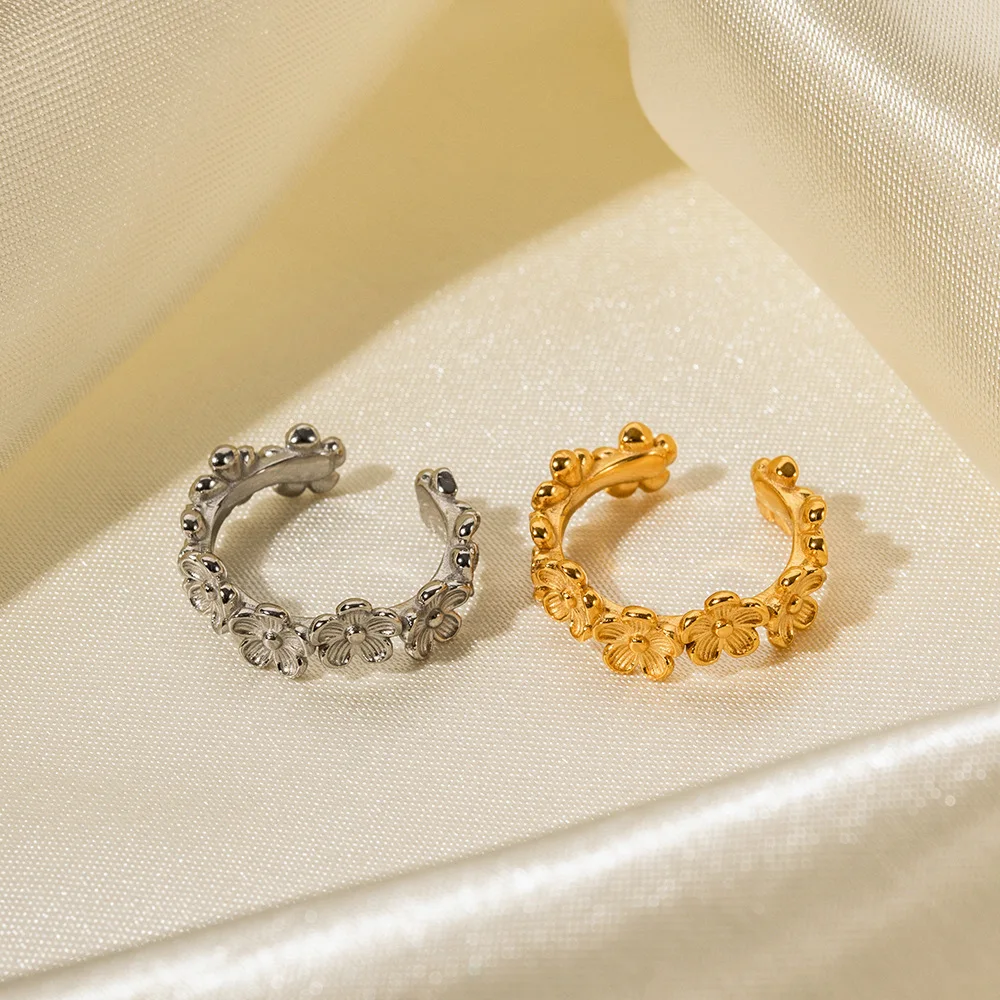 Women's 18k Gold Plated Stainless Steel Ring Non-Fading Waterproof Fashionable Design Open Flower C-Shaped Ring Engagement
