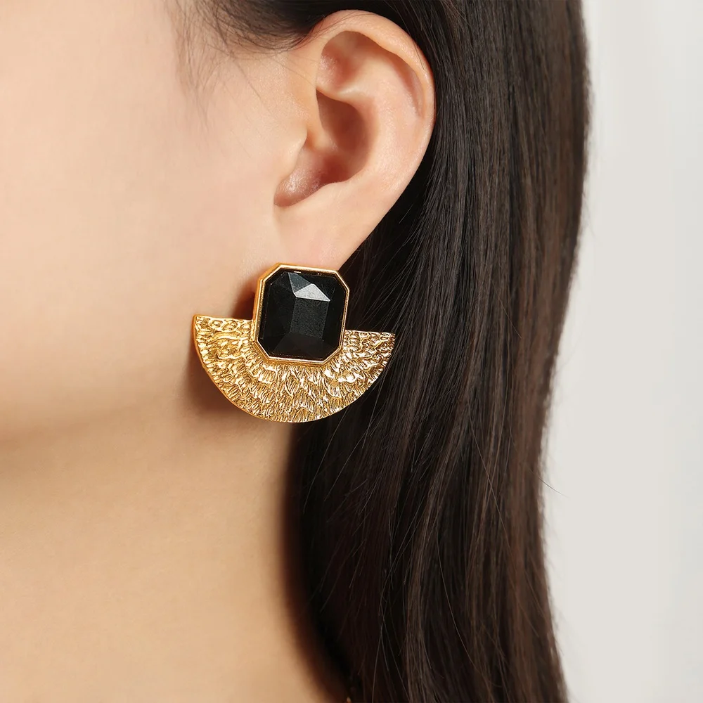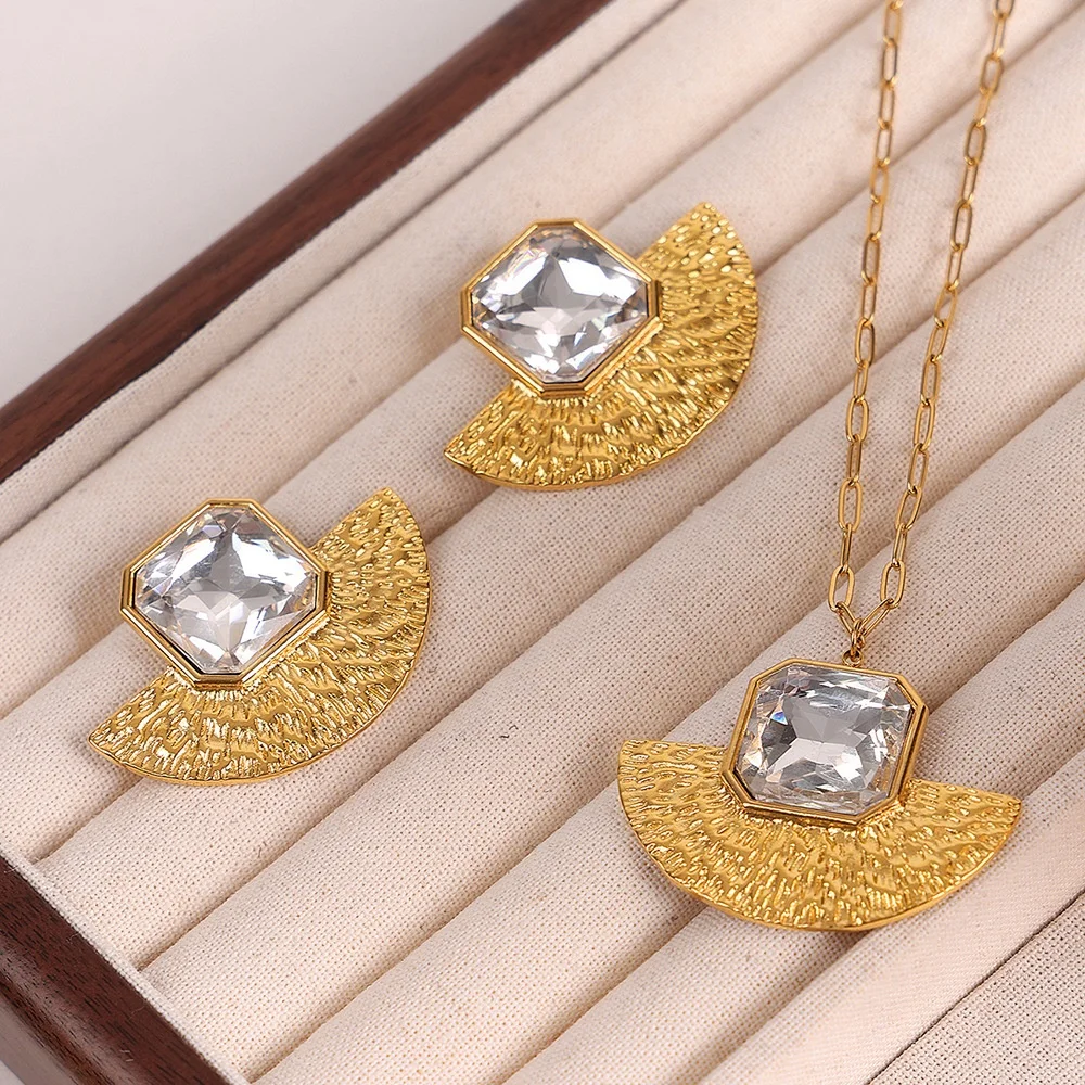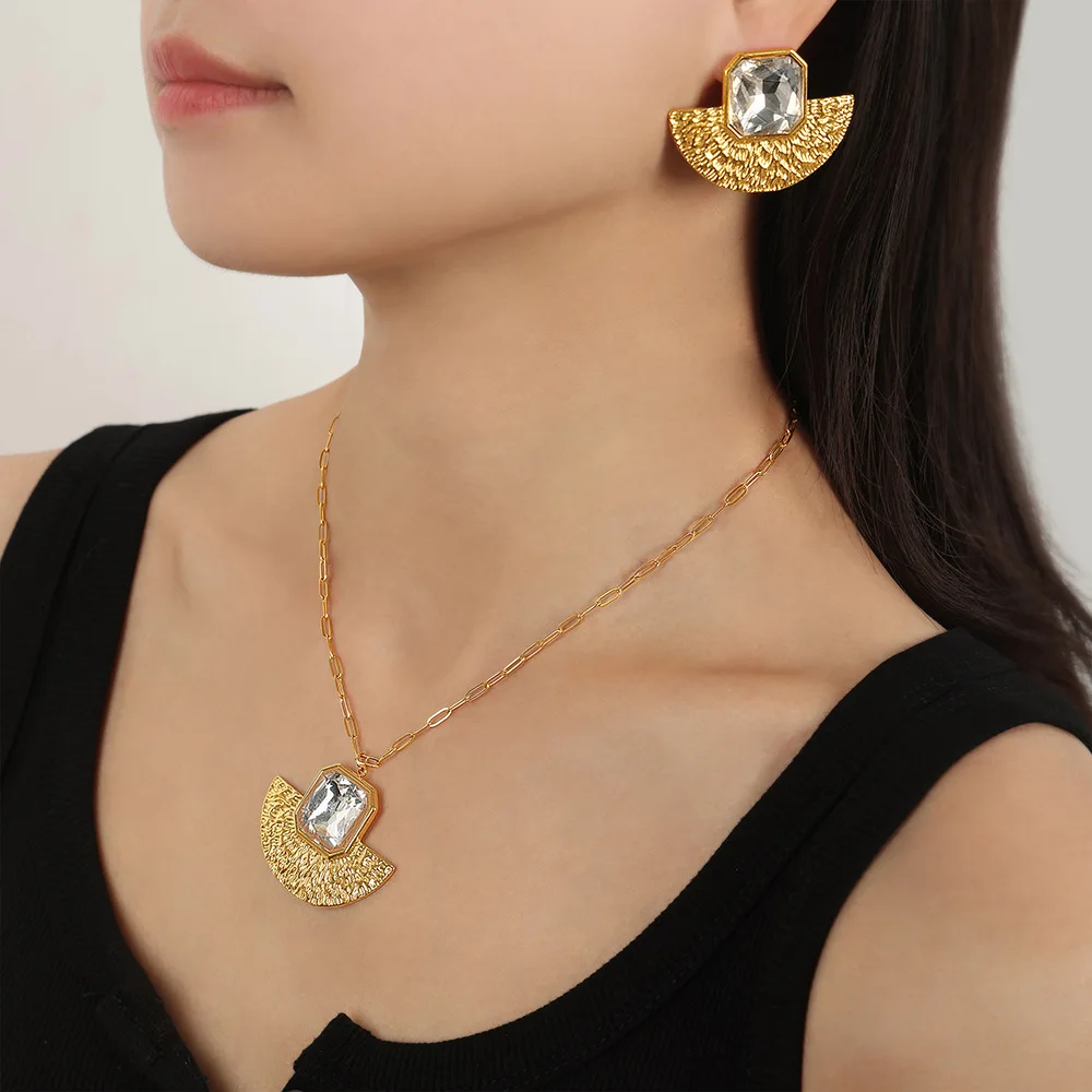 Ilona Retro Niche Stainless Steel Gold Plated Women's Jewelry Set Fan Shaped Zircon Inlaid Glass Earrings and Necklace Set