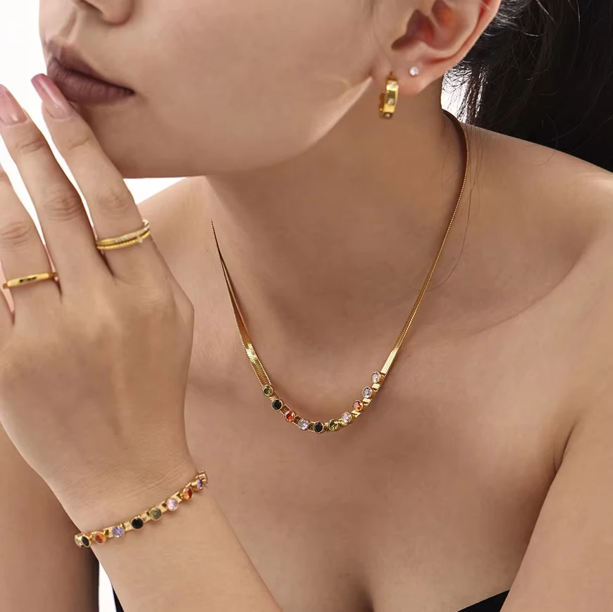 Ilona 18k Gold Plated Jewelry Set Wholesale Colorful Zircon Chain Necklace Bracelet Stainless Steel Jewelry Sets Vintage Women