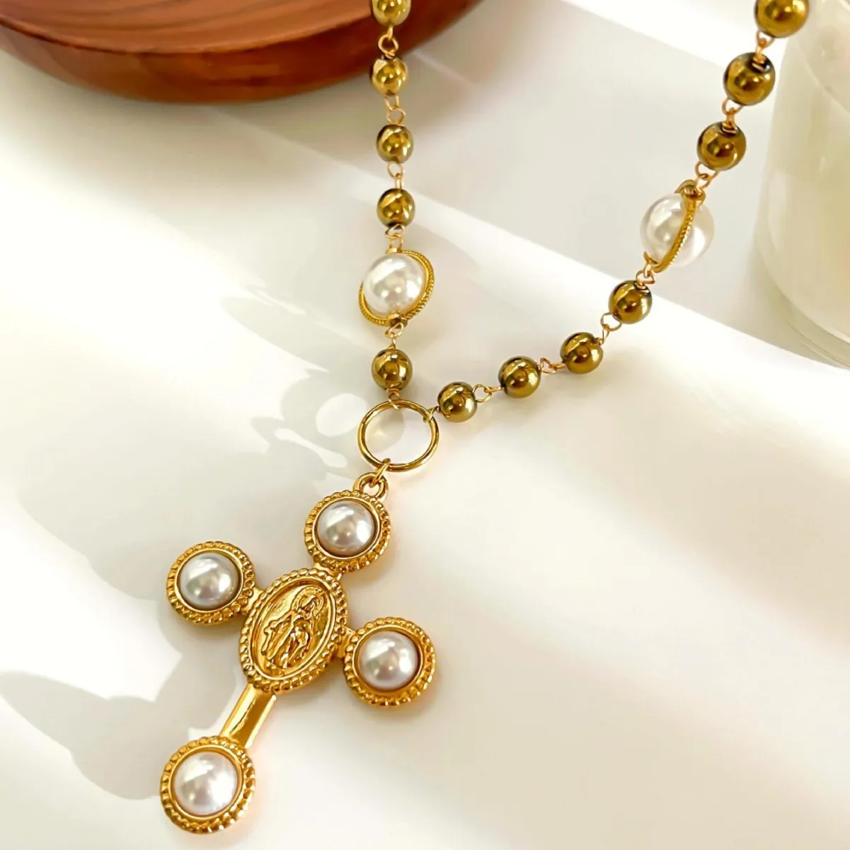 Ilona Fashion Christian Autumn Winter Stainless Steel Gold Plated Cross Pendant Necklace Imitation Pearl Women's Beaded Necklace