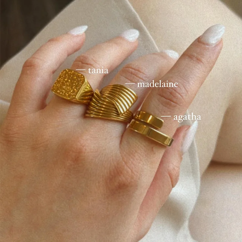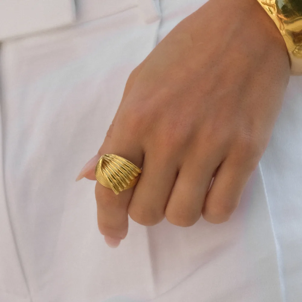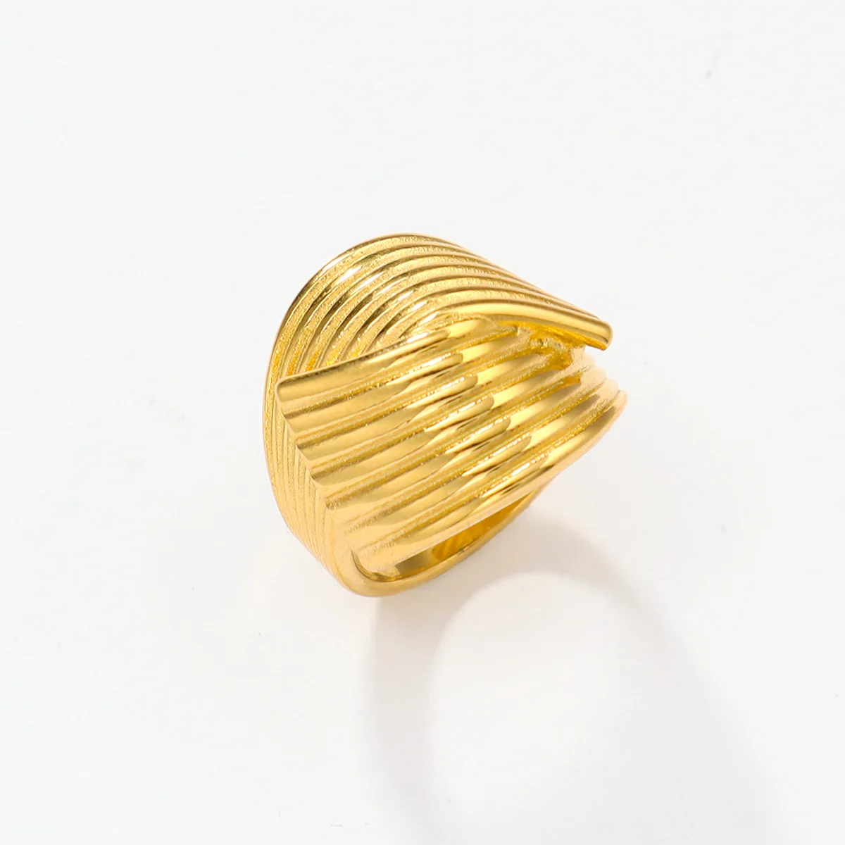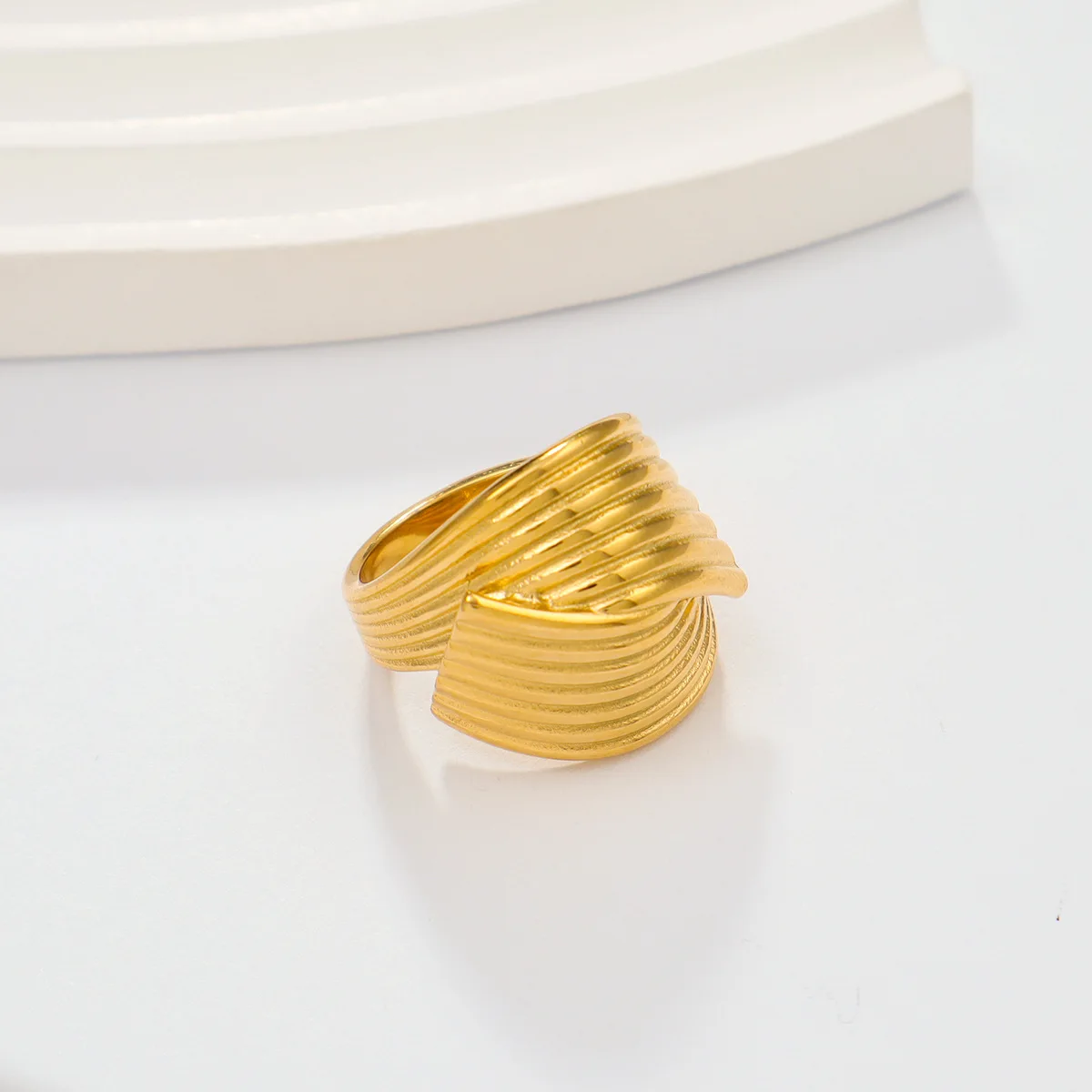 Ilona 18K Gold Plated Stainless Steel Croissant Ring Trendy Statement Ring Twisted Rope Engraved Stripes Chunky Signet Weddings