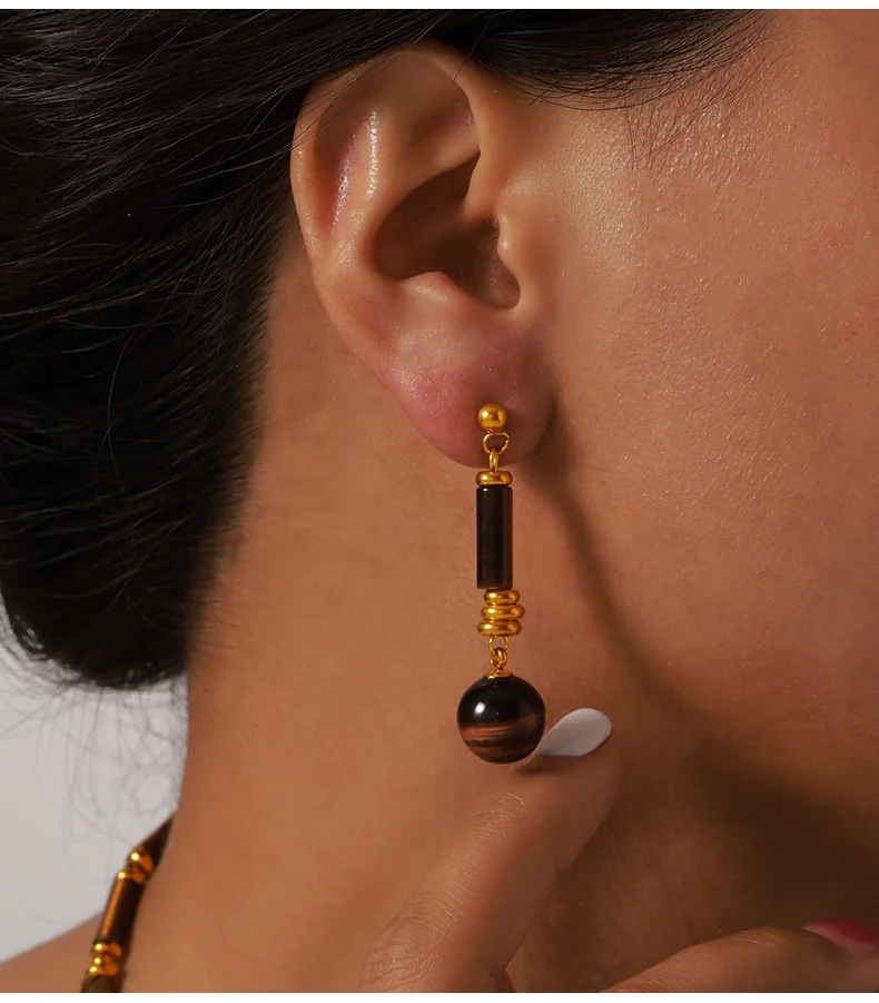 Maillard Style Retro Niche Temperament Elegant Jewelry tiger Eye Stone Bead Design Stainless Steel Necklace and Earrings Set
