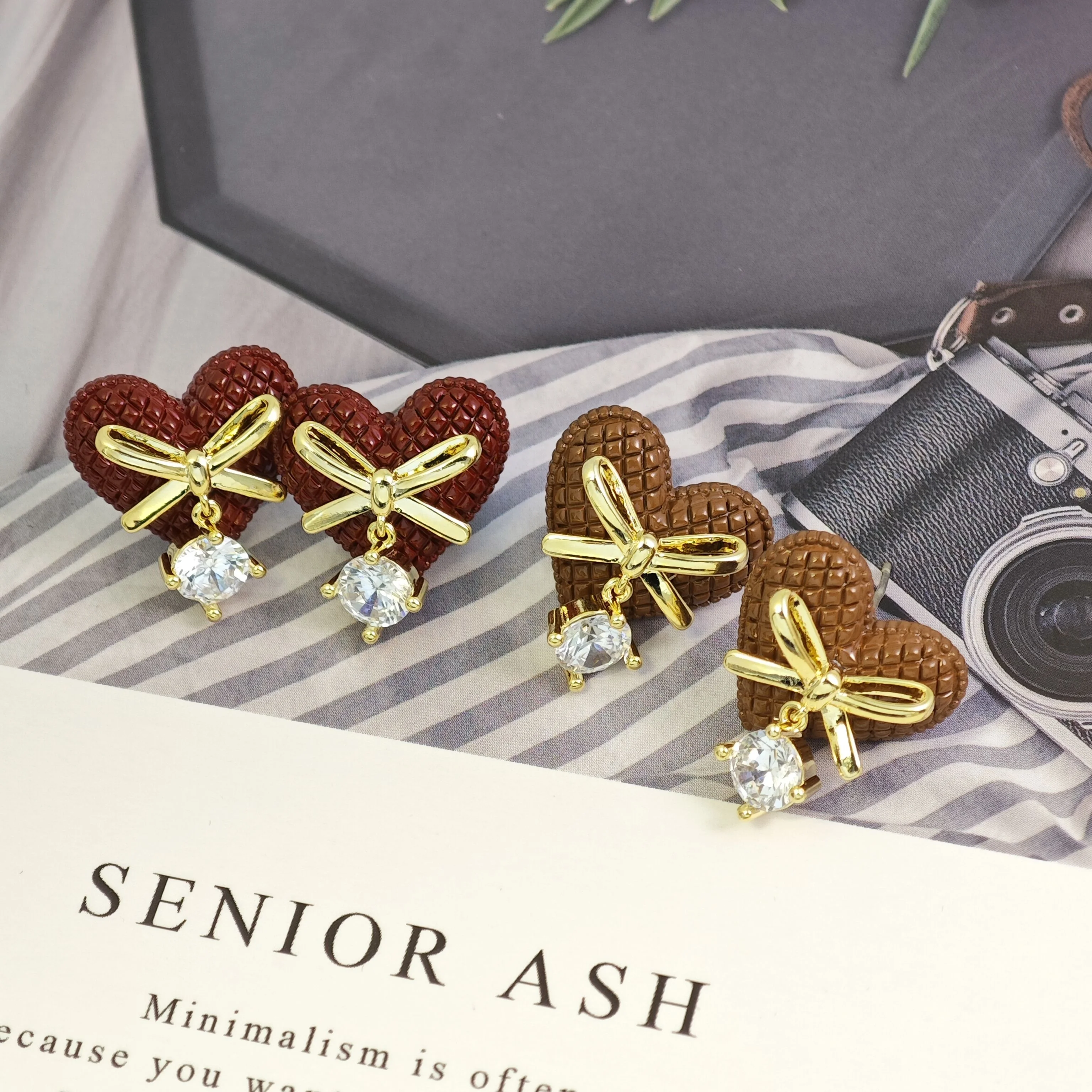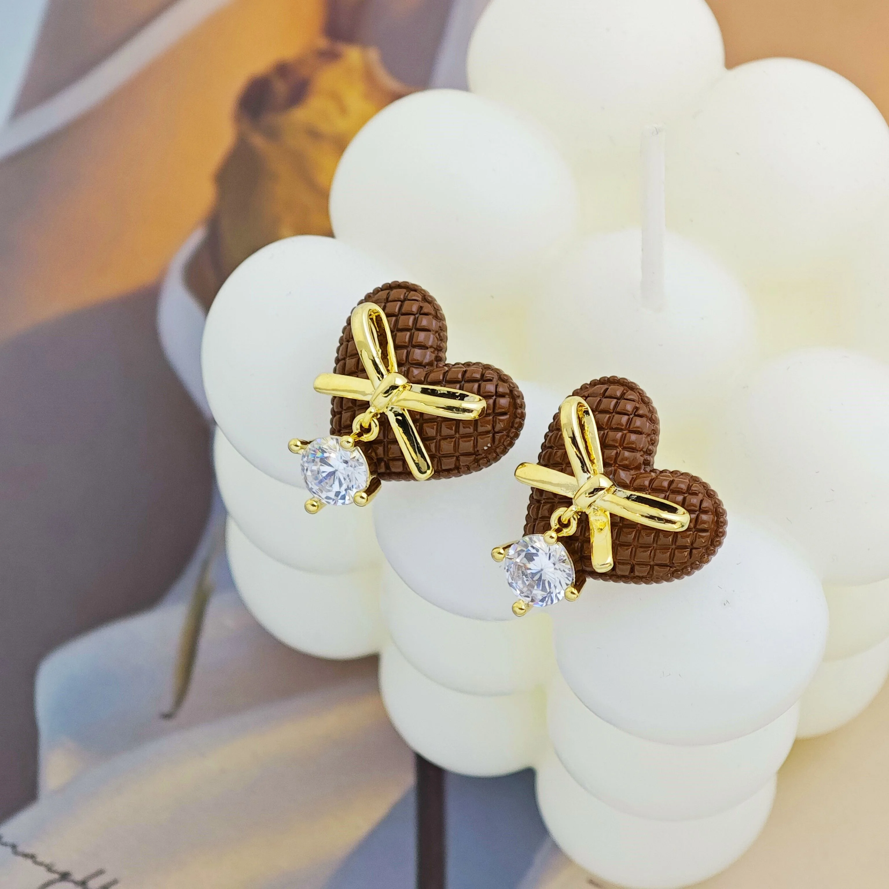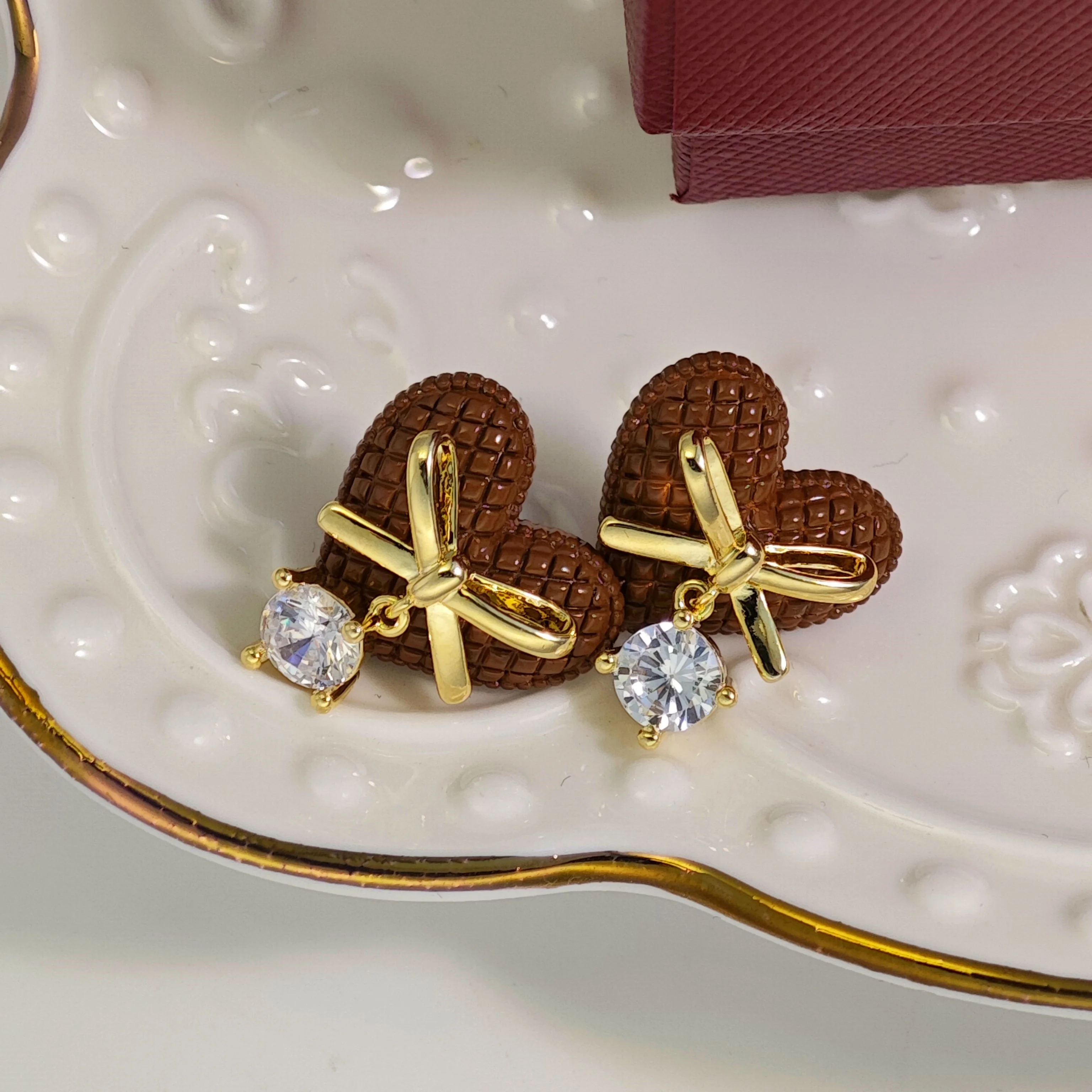 Ilona Vintage Gift Cubicles Gold Plated Zircon Copper Earrings Women Luxury Heart Shape Bowknot Studs Earrings Wholesale