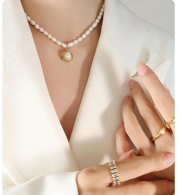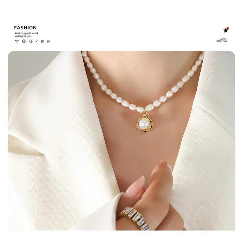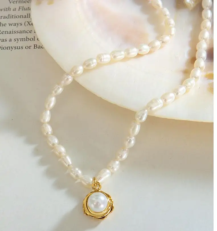 Vintage Gold Plated Freshwater Pearl Necklace Pendant Stainless Steel Chain Bridal Wedding Gift for Girls