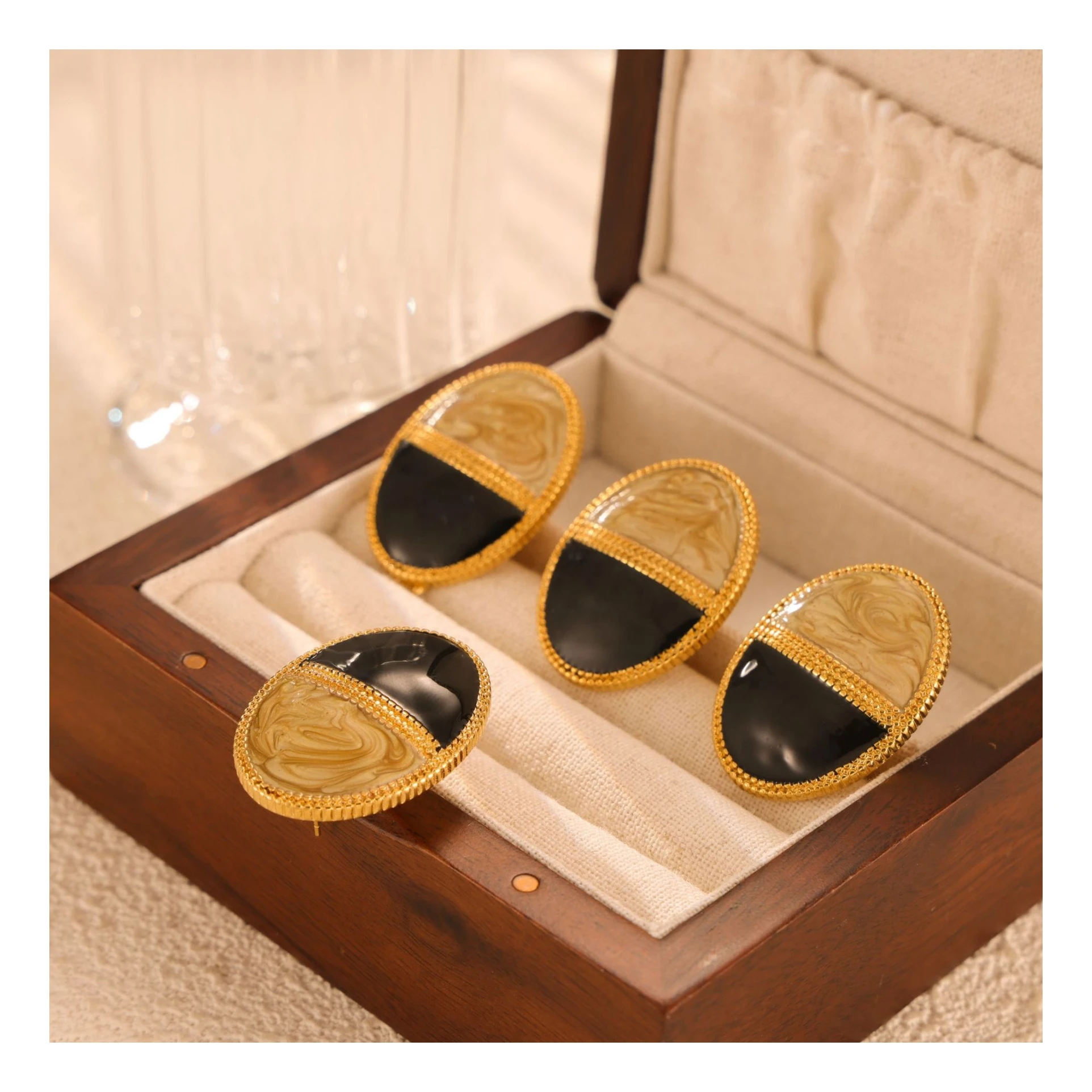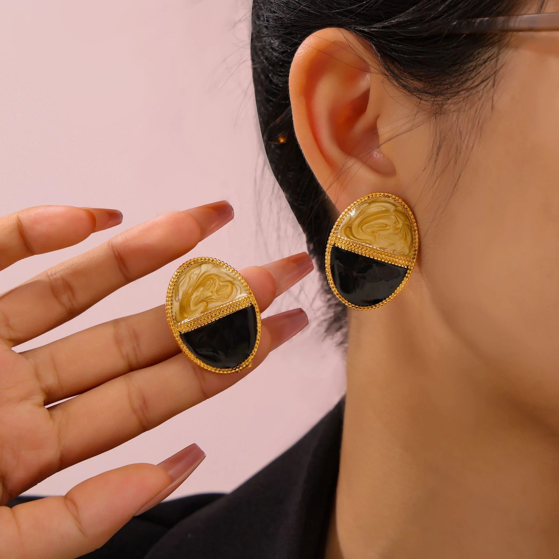 Ilona Vintage Texture Temperament Gold Plated Earring Double-color Design Lace Oval Stud Earrings