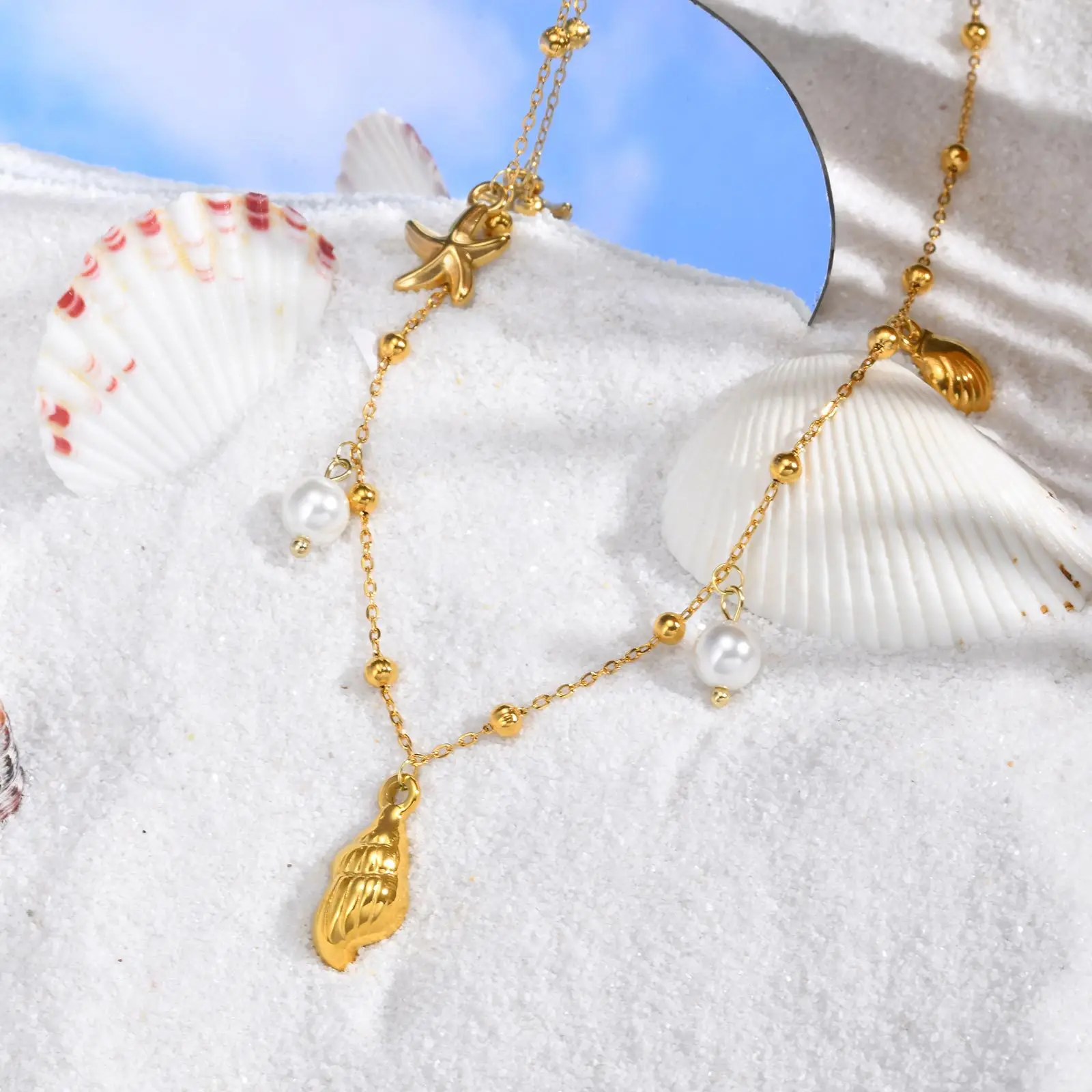 Fashion Beach Ocean Series Pearl Shell Starfish Conch Pendant Necklace Stainless Steel Necklace for Women