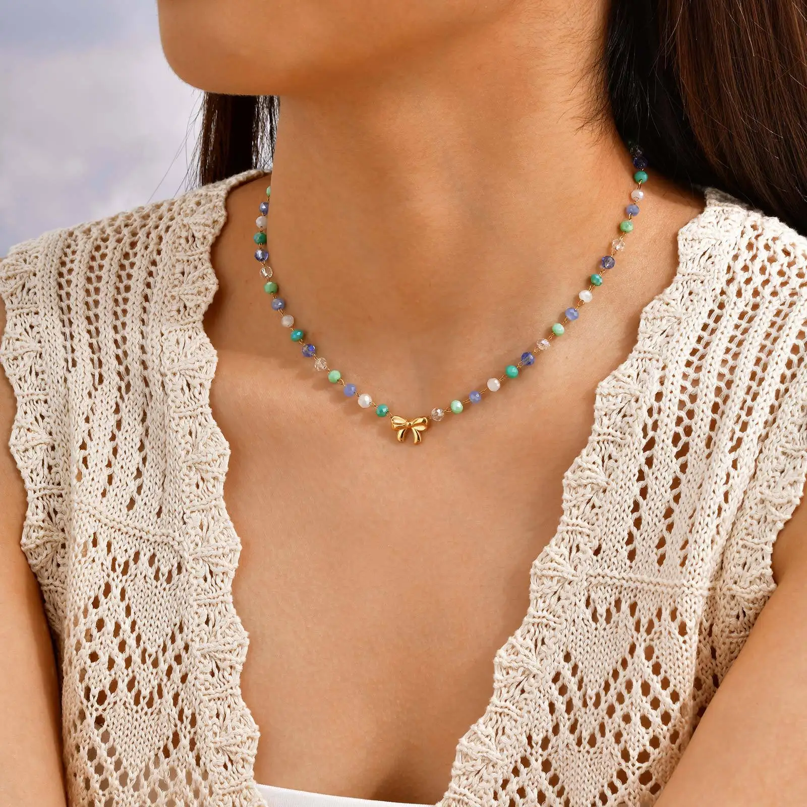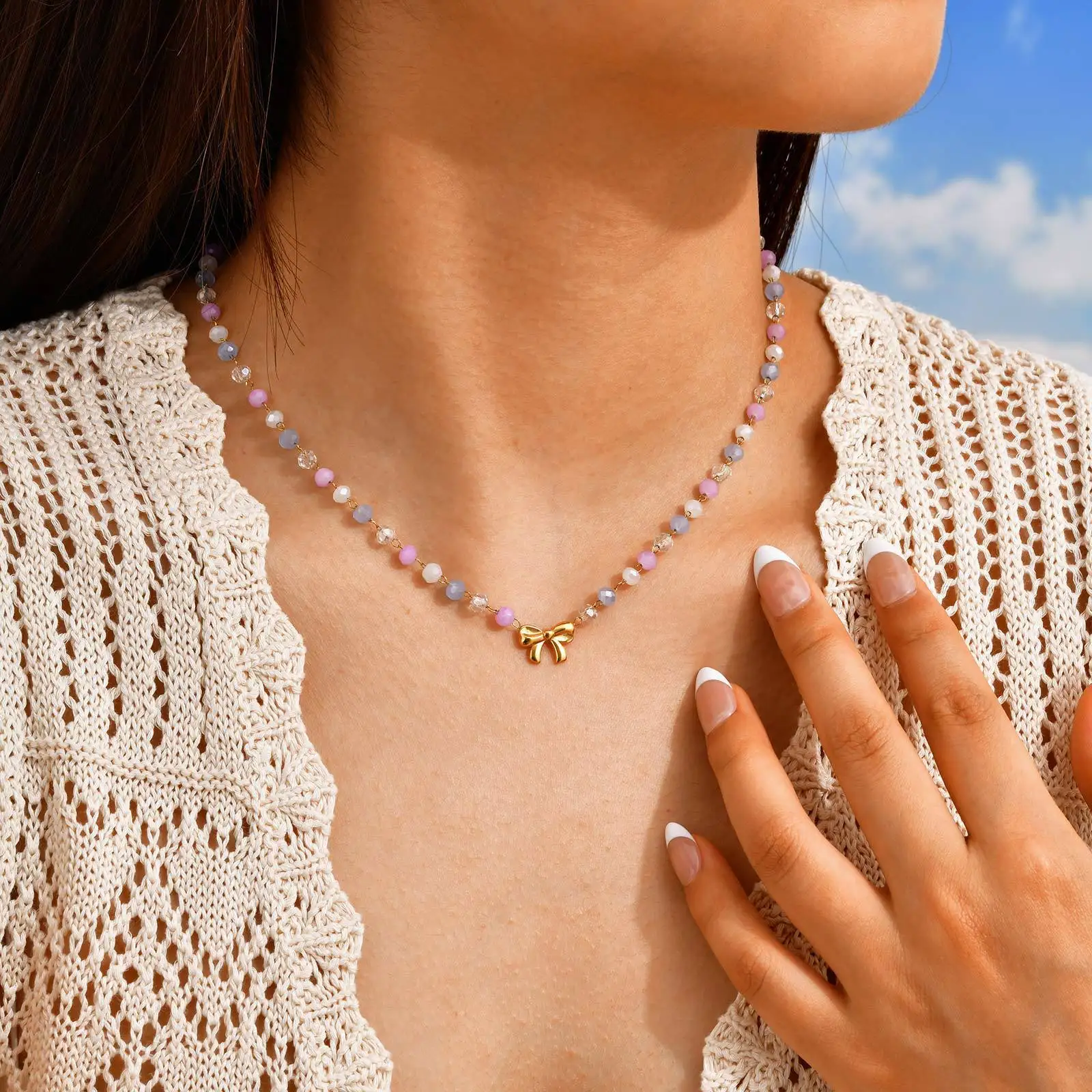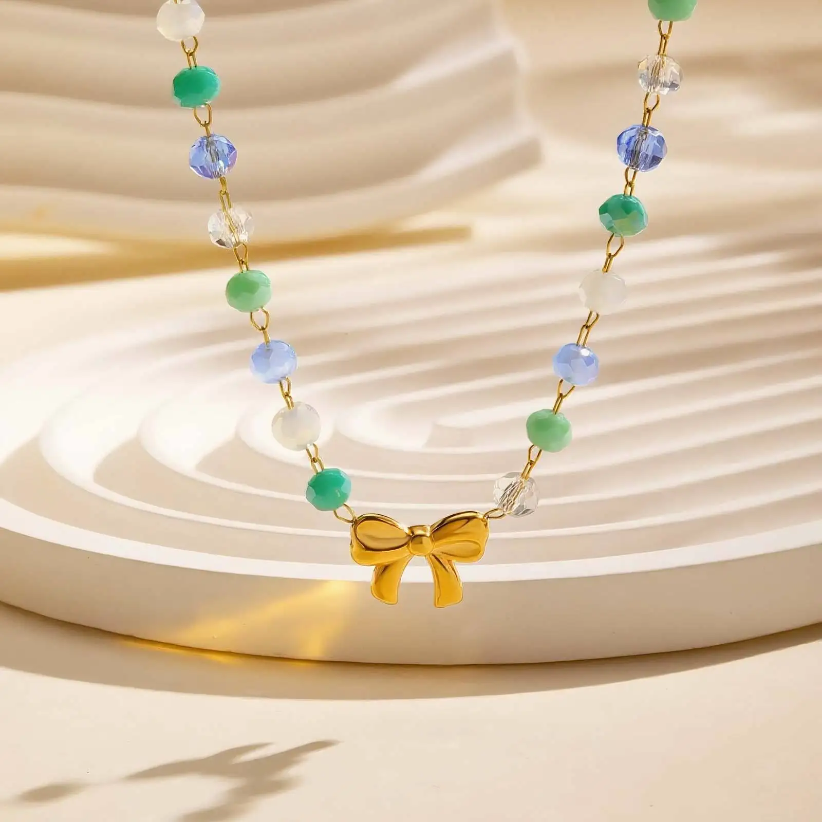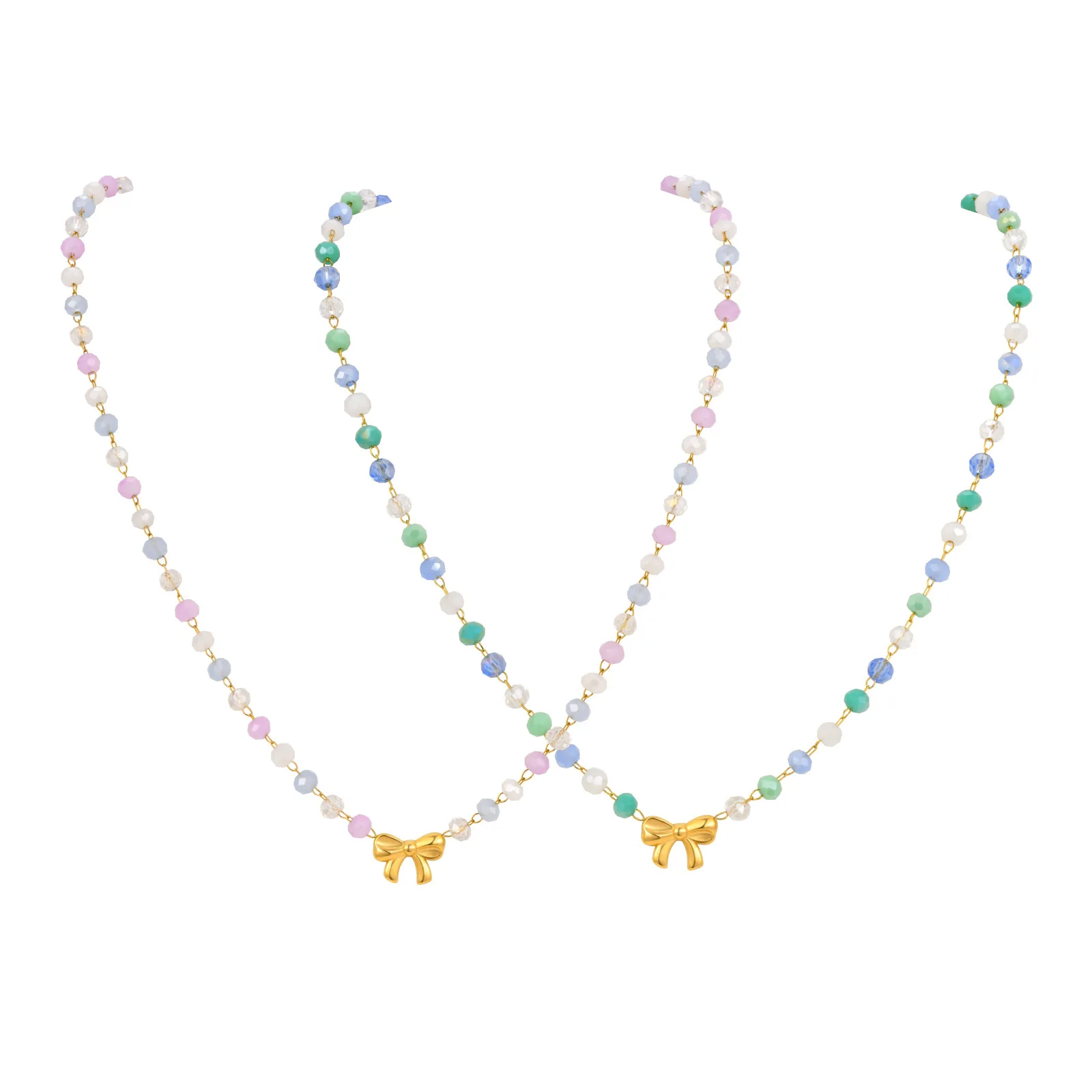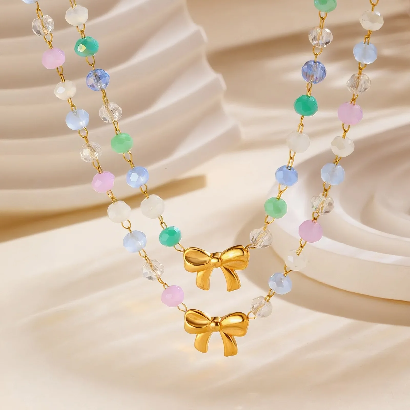 New Sweet Colorful Beads Chain Charm Stainless Steel Necklace 18k Gold Plated Women Girls Bowknot Pendant Necklaces