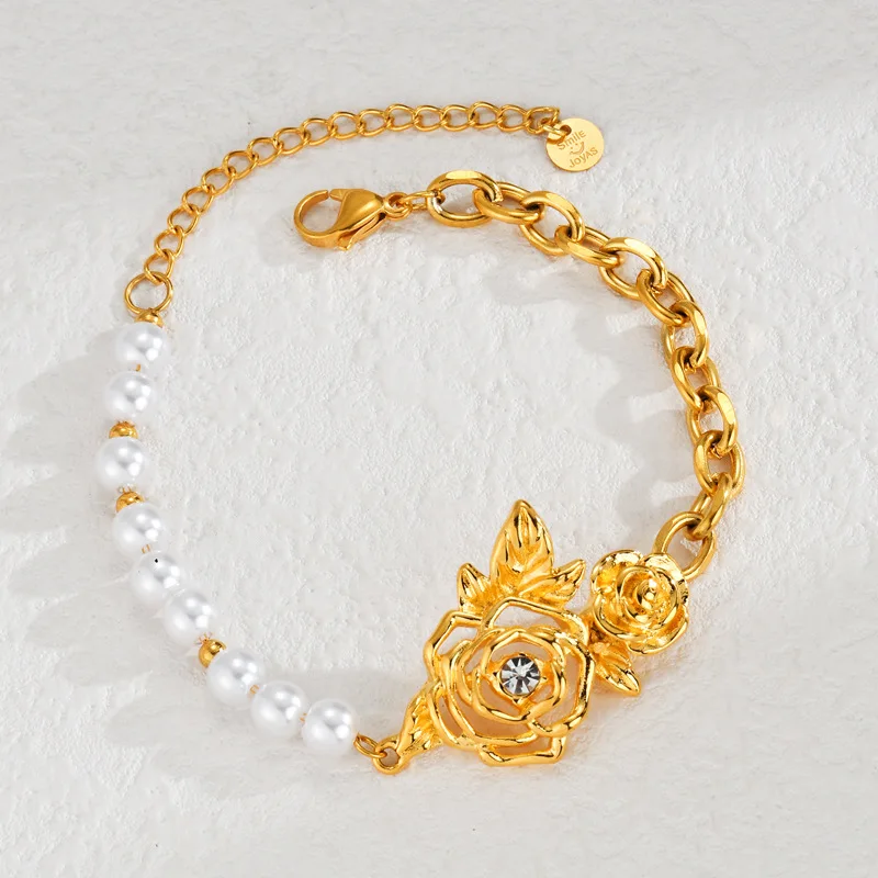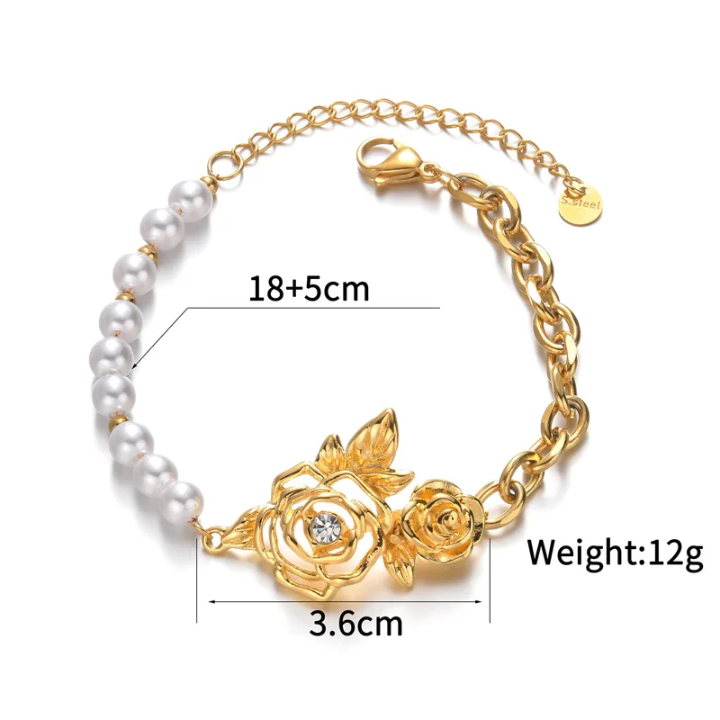 New Design Fashion Women Adjustable Charm Bracelets Flower Shape Imitation Pearl 18K Gold Plated Chain Link Bracelets