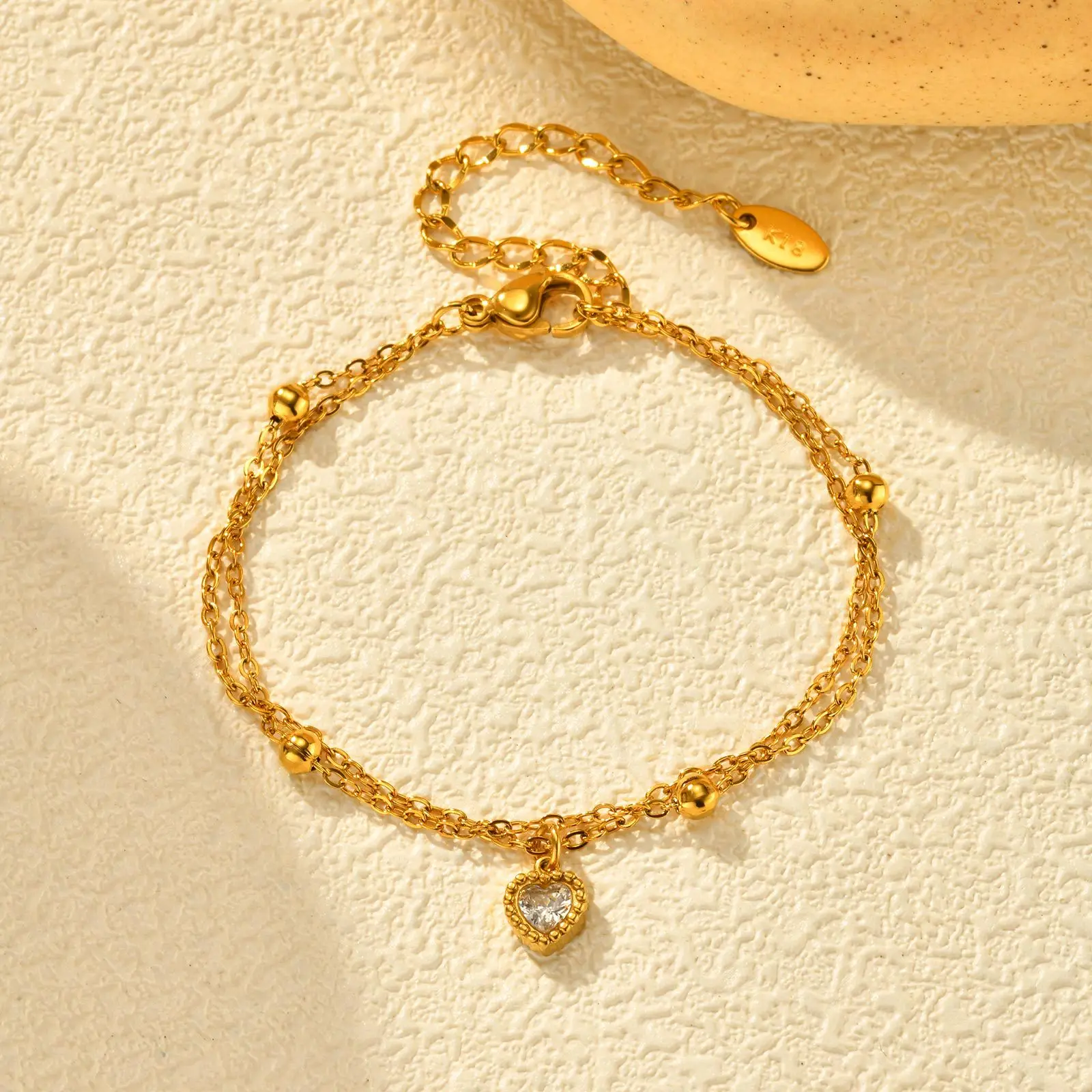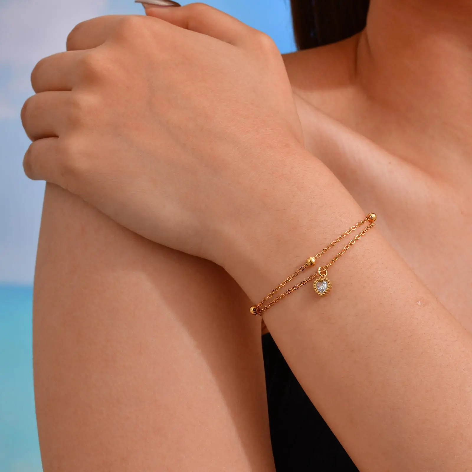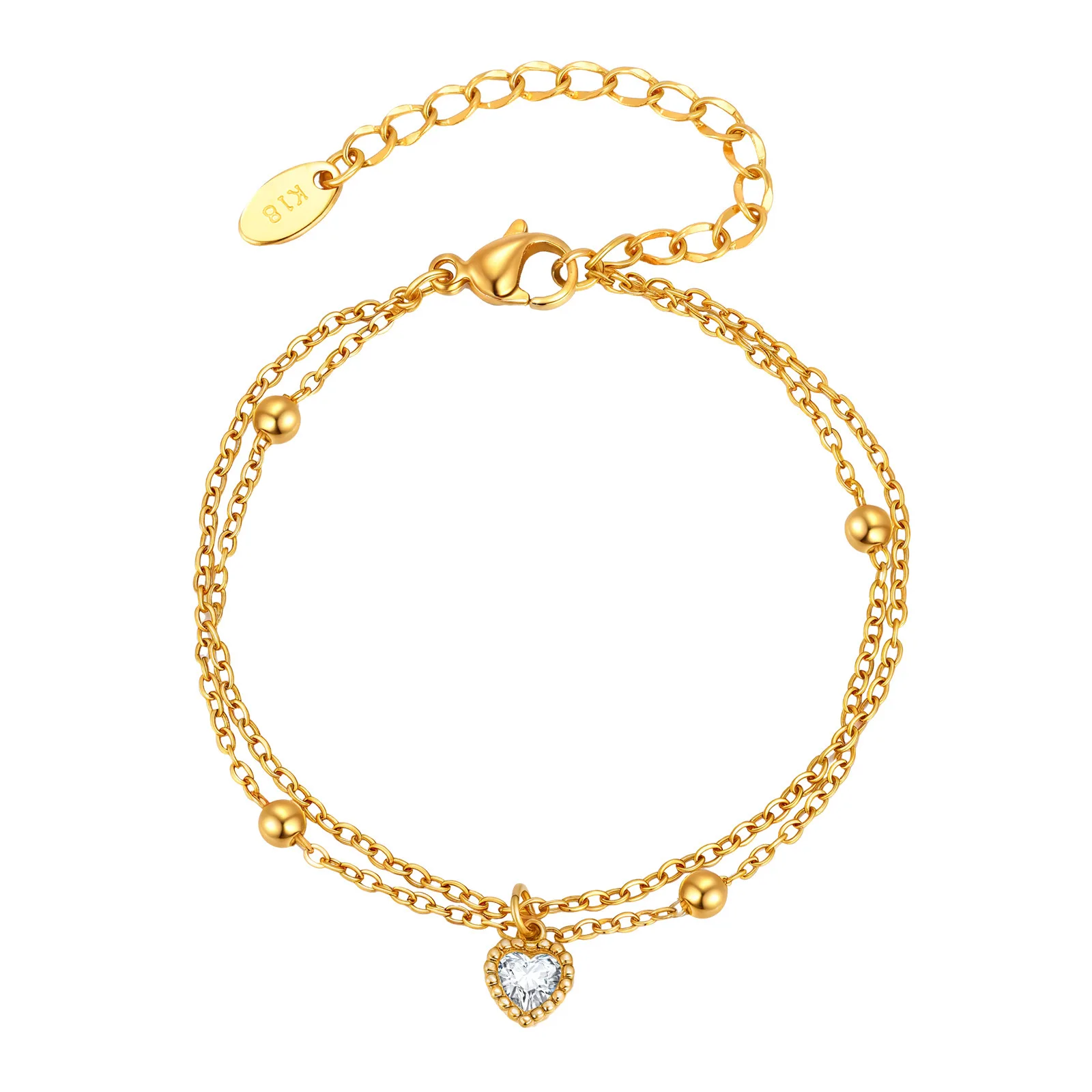 Ins Style 18k Gold Plated Stainless Steel Heart Shaped Zircon Double Bracelet Waterproof Hypoallergenic Charm Bracelet for Women