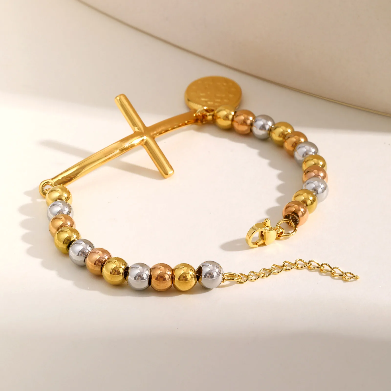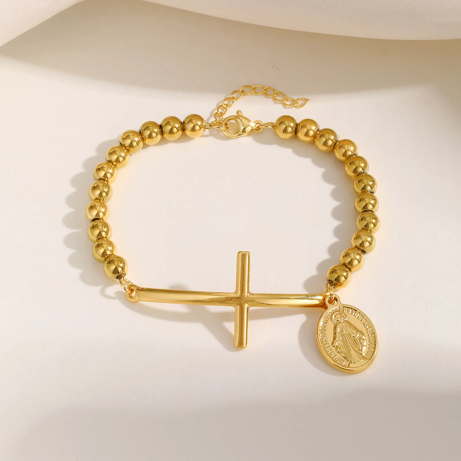 Hot Sale Stainless Steel Prayer Cross Gold Beads Special Bracelets Virgin Mary Cross Round Pendant Bracelets for Women