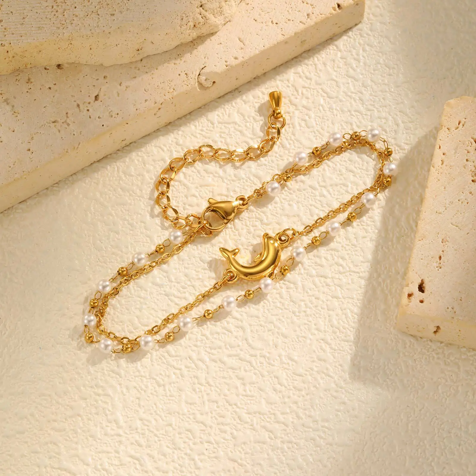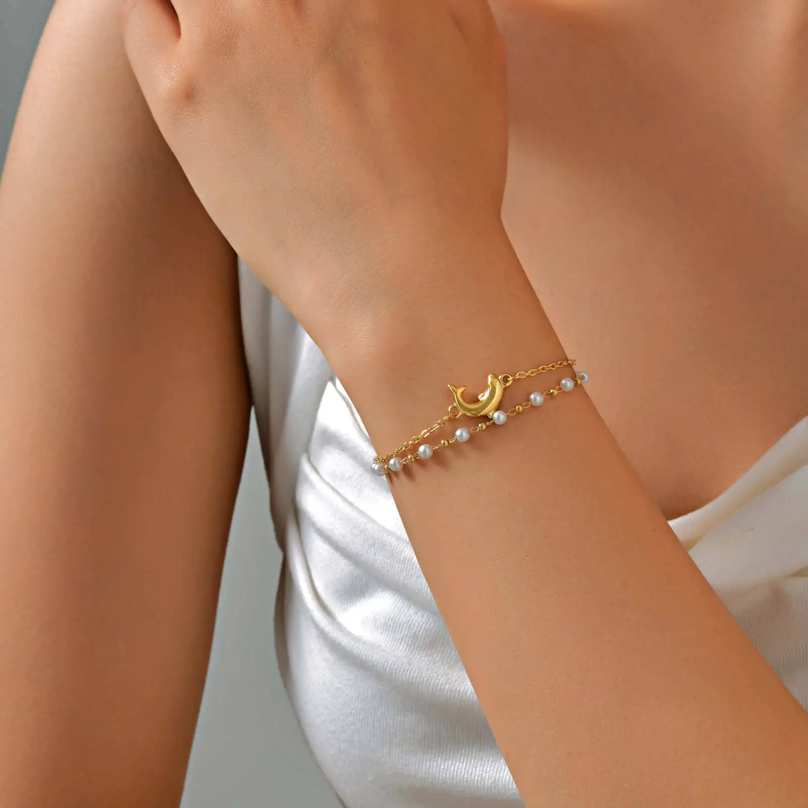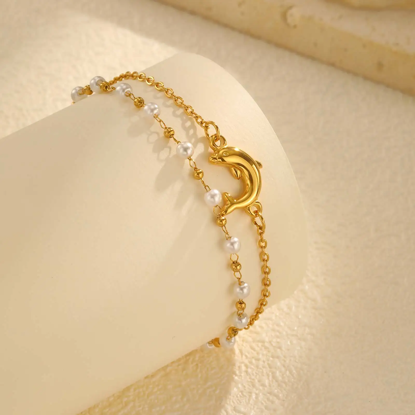 Summer Adjustable Gold Color Women's Ocean Style Stacked Bracelet Dolphin Pendant Double Layer Pearl Jewelry Bracelet
