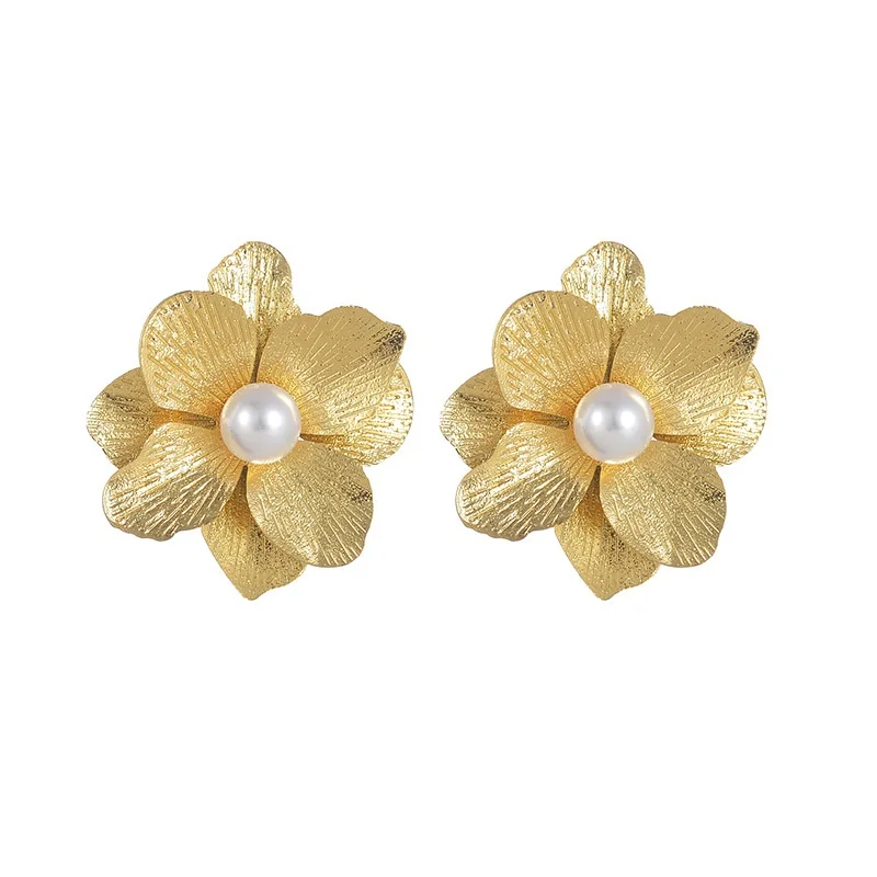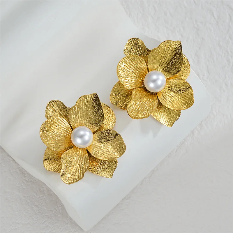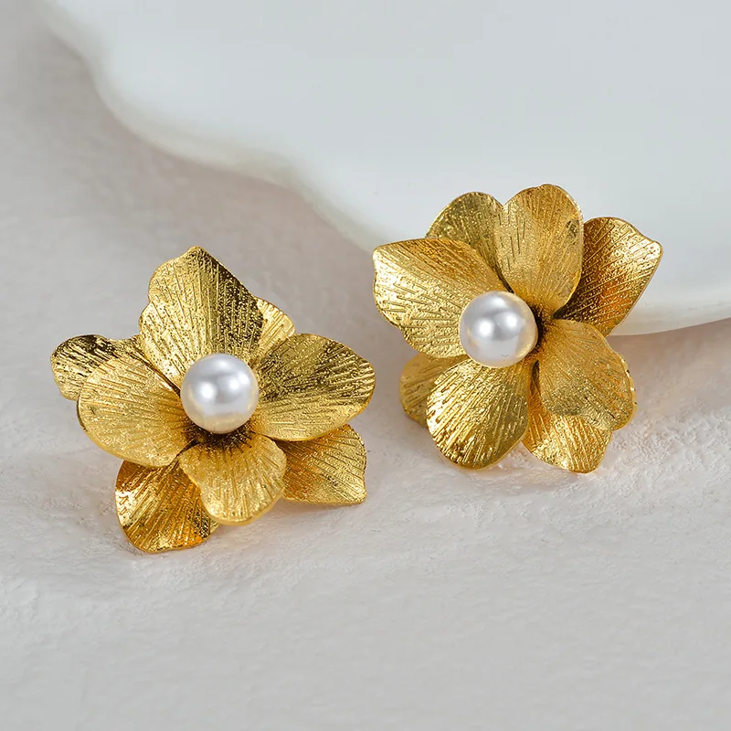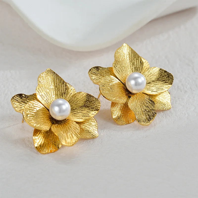 Fashionable Elegant Women's Pearl Stud Earrings Anti Allergic Stainless Steel Imitation Pearl Flower Shape Earrings