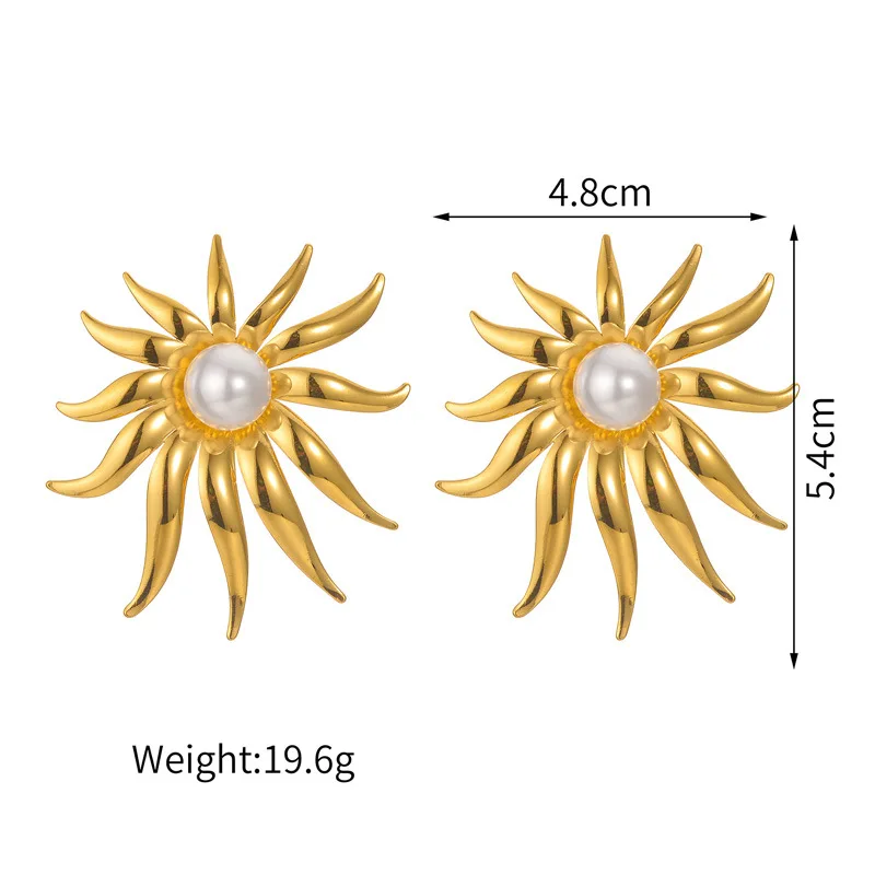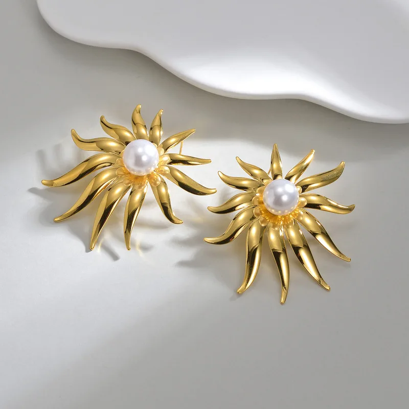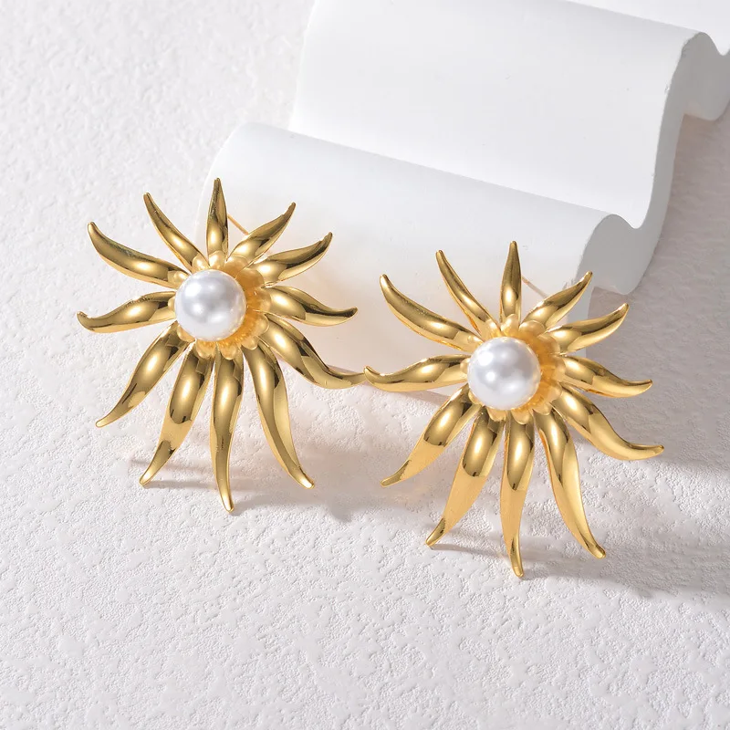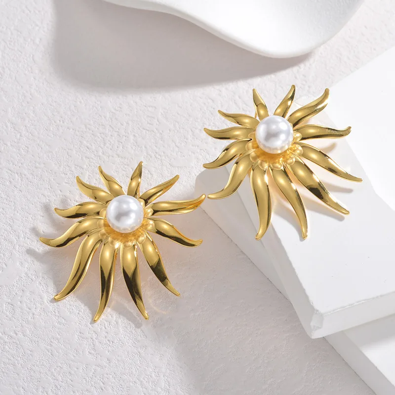 Hot Selling Vintage Style Sun Flower Pearl Earrings Stainless Steel 18K Gold Plated Earrings Jewelry Women
