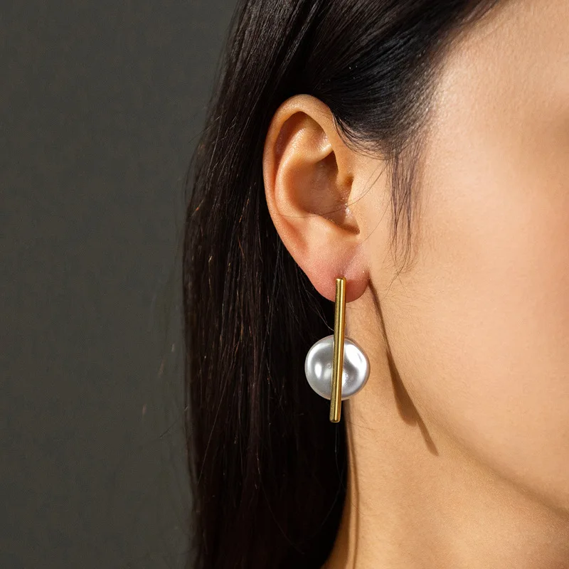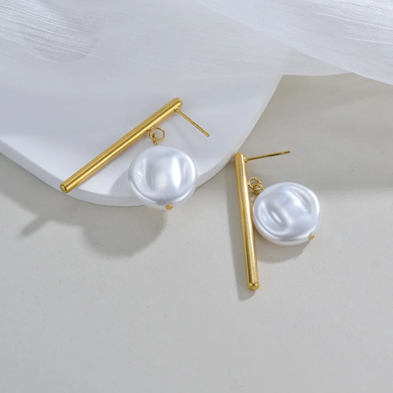 Minimalist Design Women Vintage Style Jewelry 18K Gold Plated Stainless Steel Stud Earrings Round Inlaid Pearl Vertical Earrings