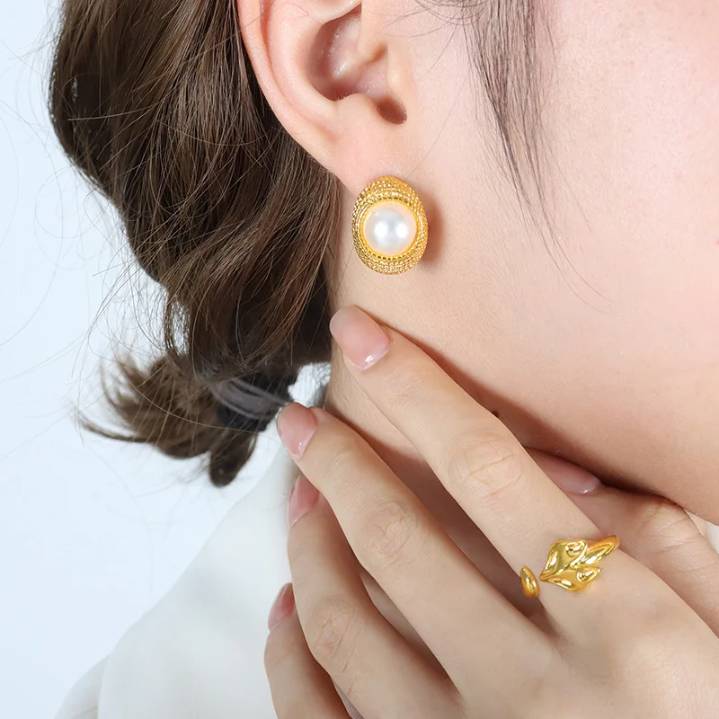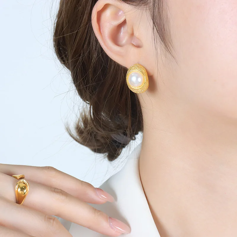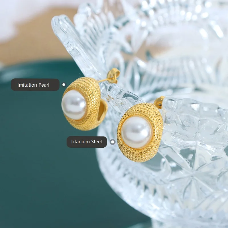 New Trendy 18k Gold Plated Titanium Steel Imitation Pearl C Shape Hoop Earrings Fashion Hoop Earings Jewlery for Women