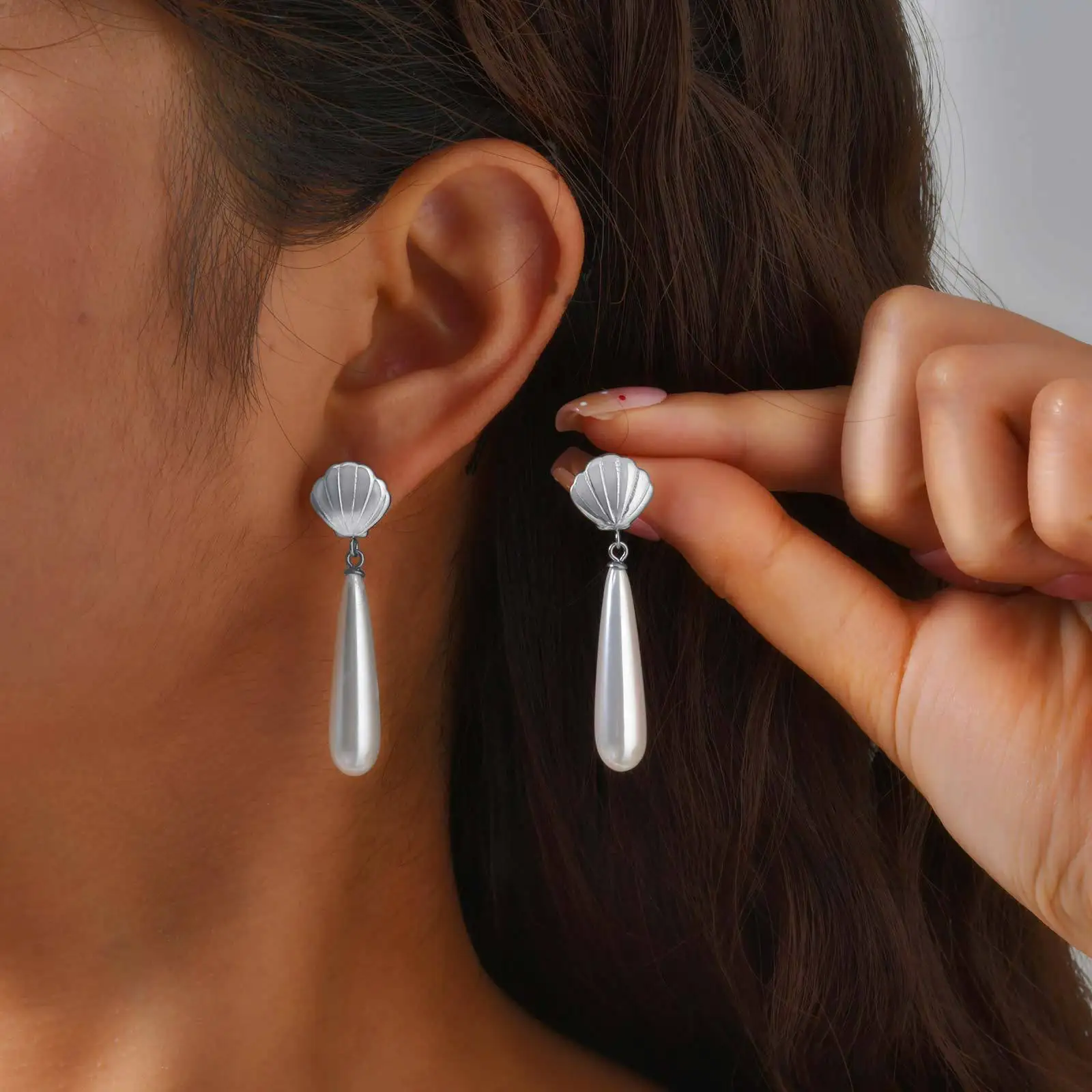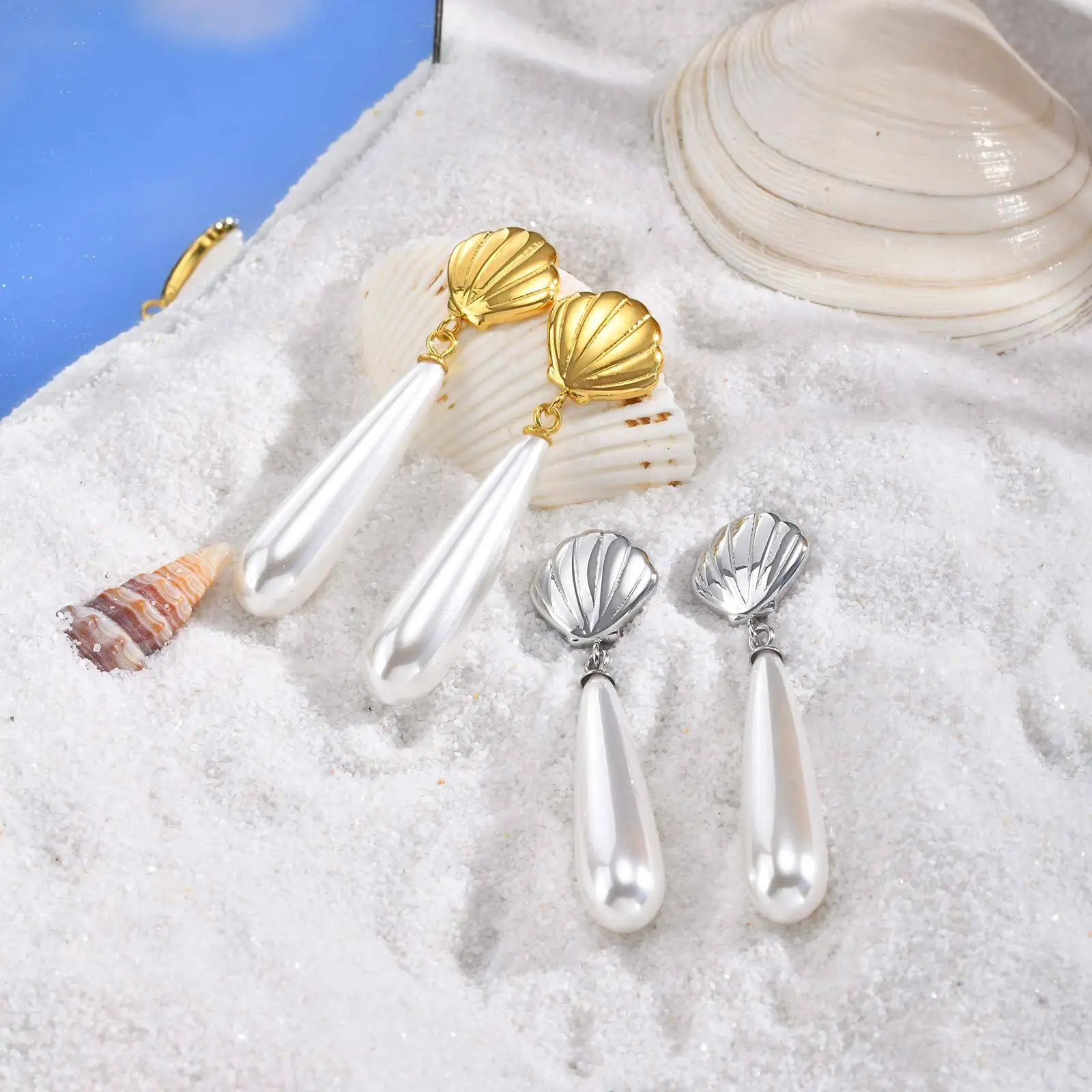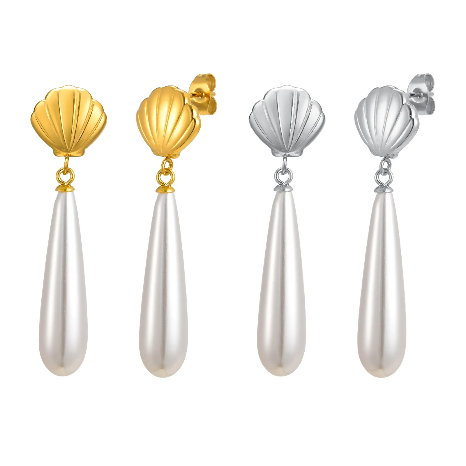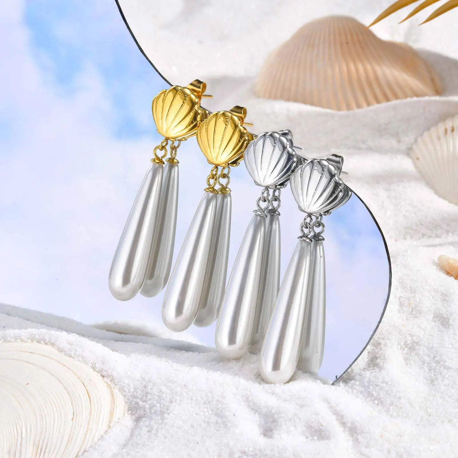 Fashion Silver Gold Plated Ocean Style Stainless Steel Shell Pearl Drop Stud Earrings Water Drop Stud Earrings for Women