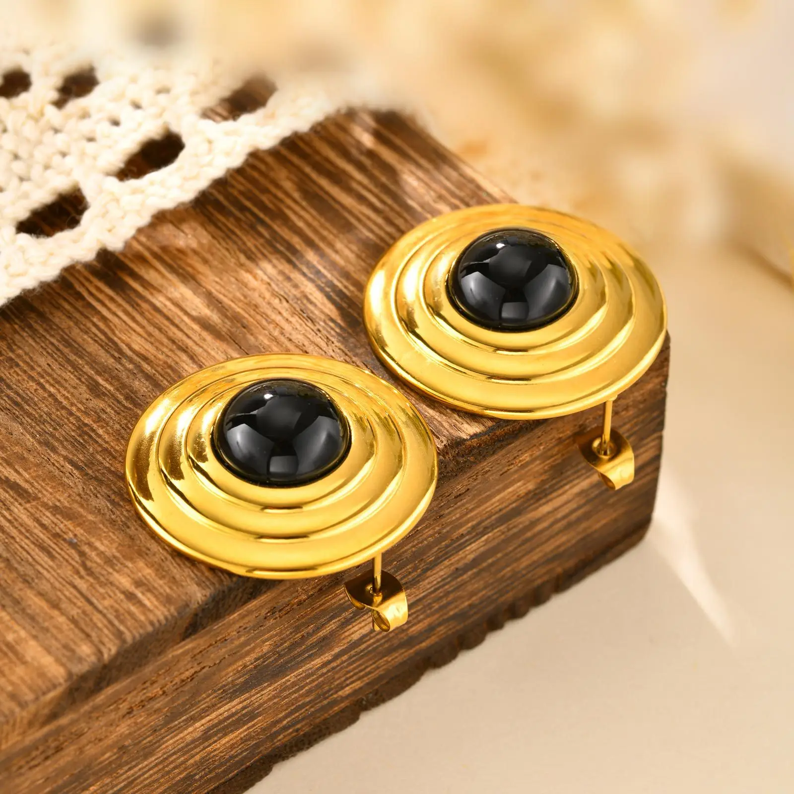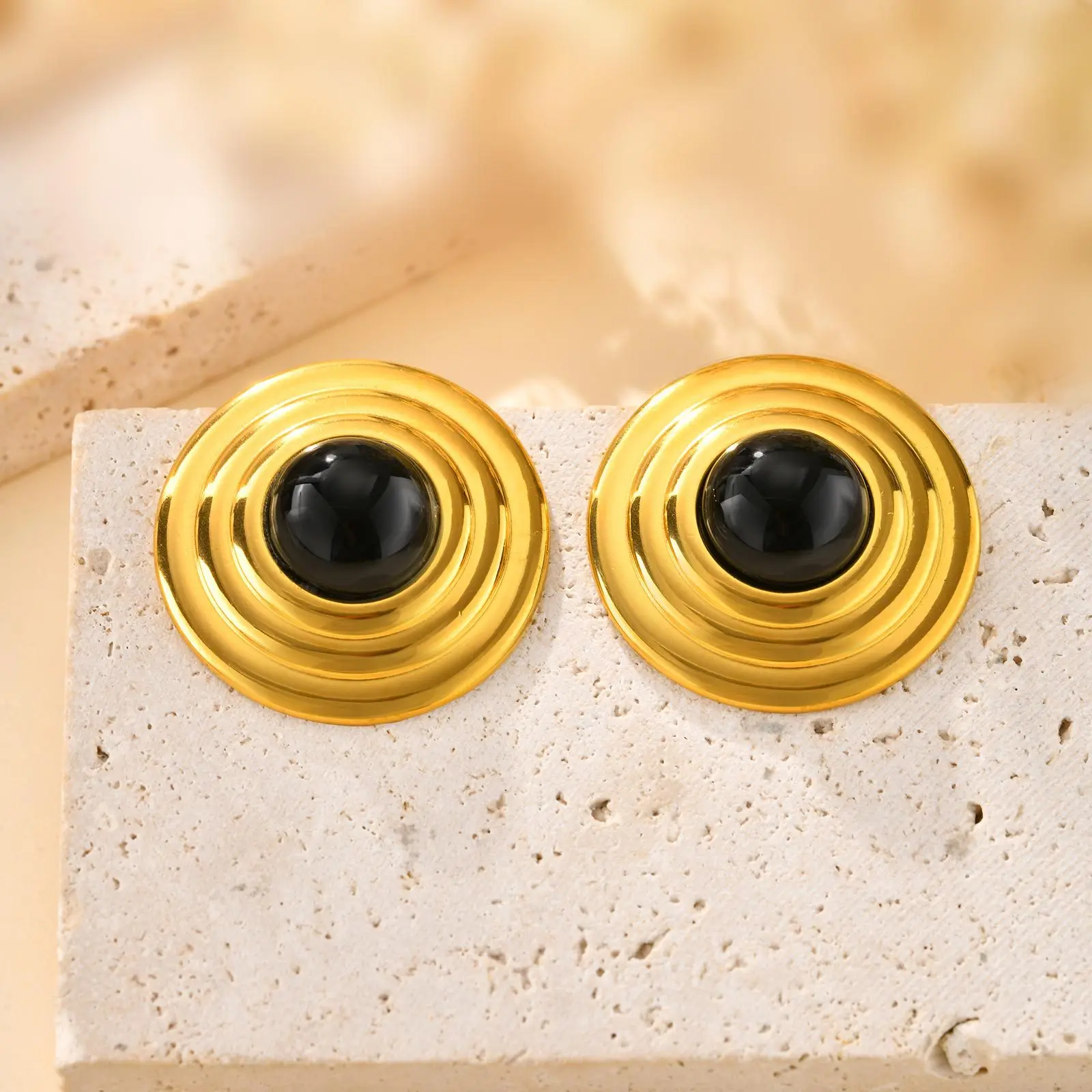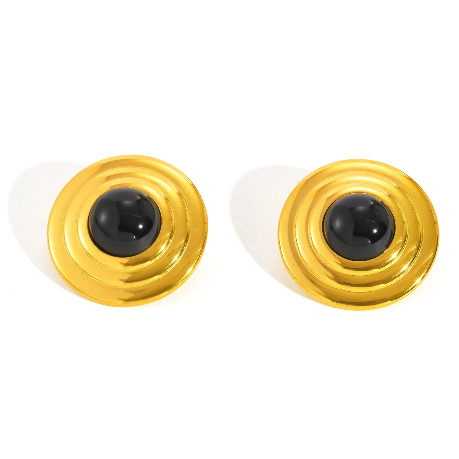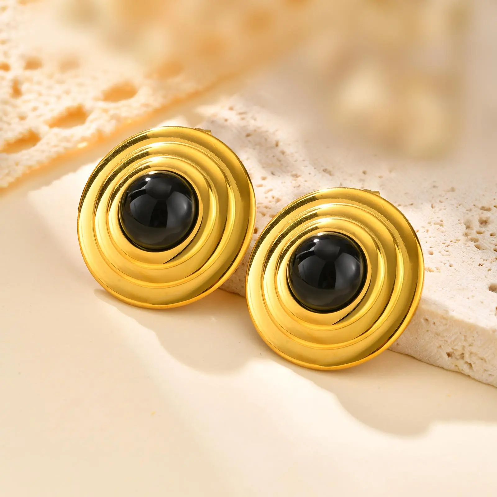 New Popular Stainless Steel Black Agate Stone Chunky Earrings Women's Retro Round Stud Earrings
