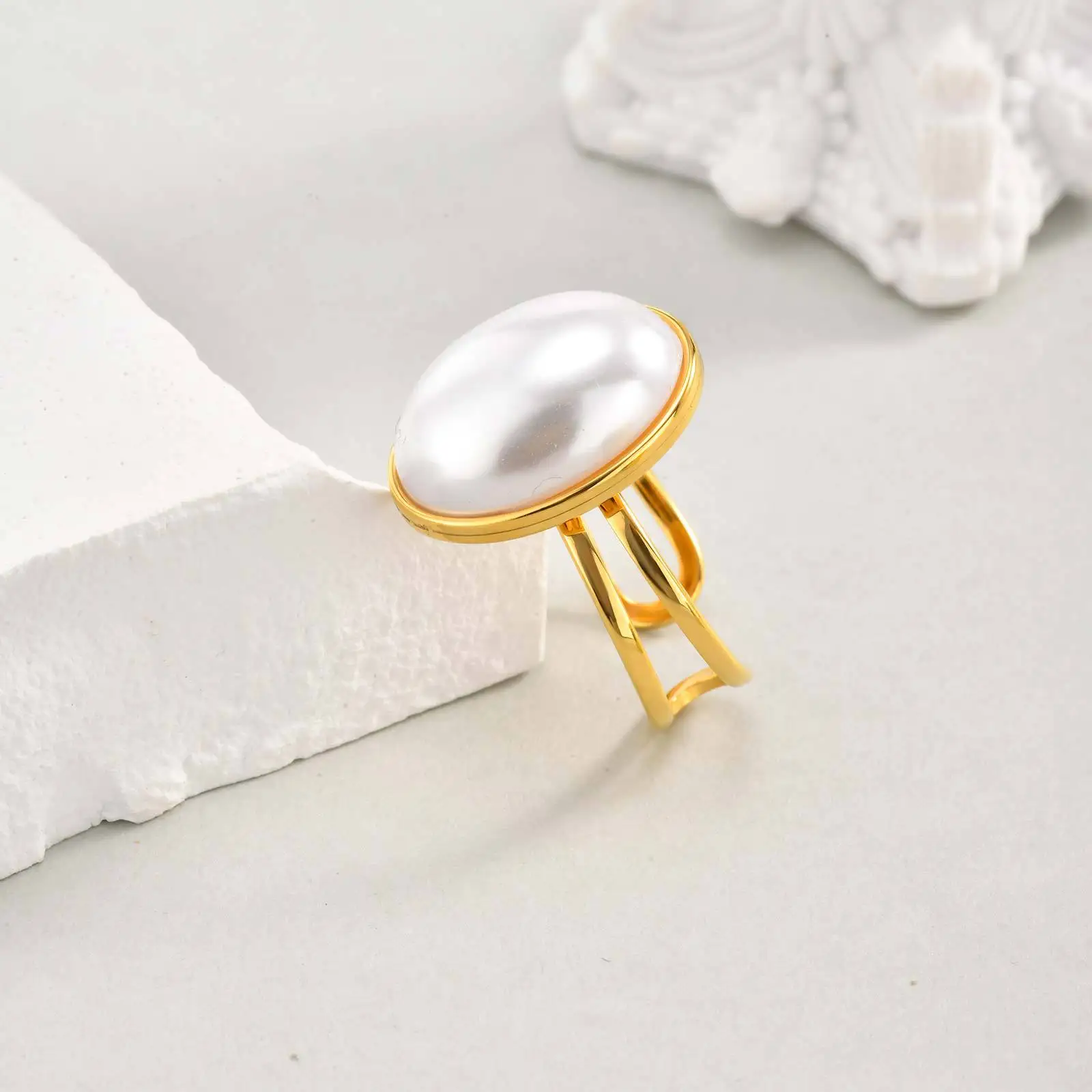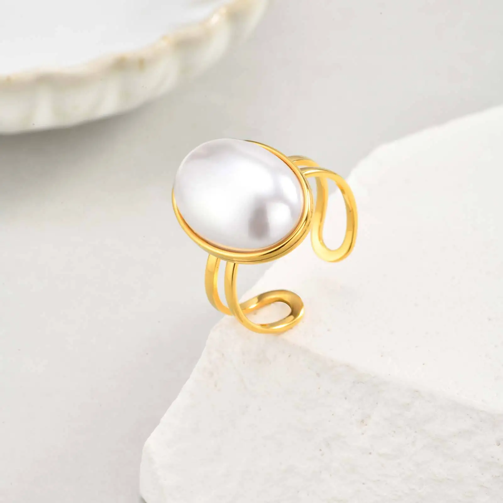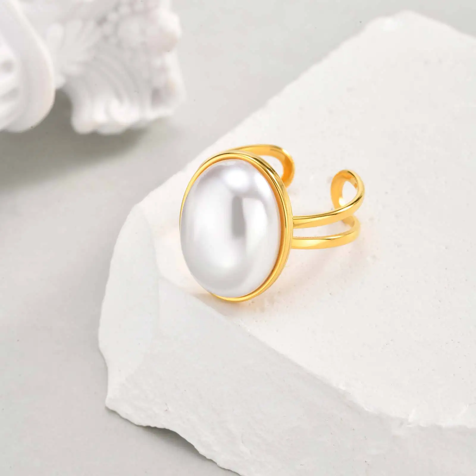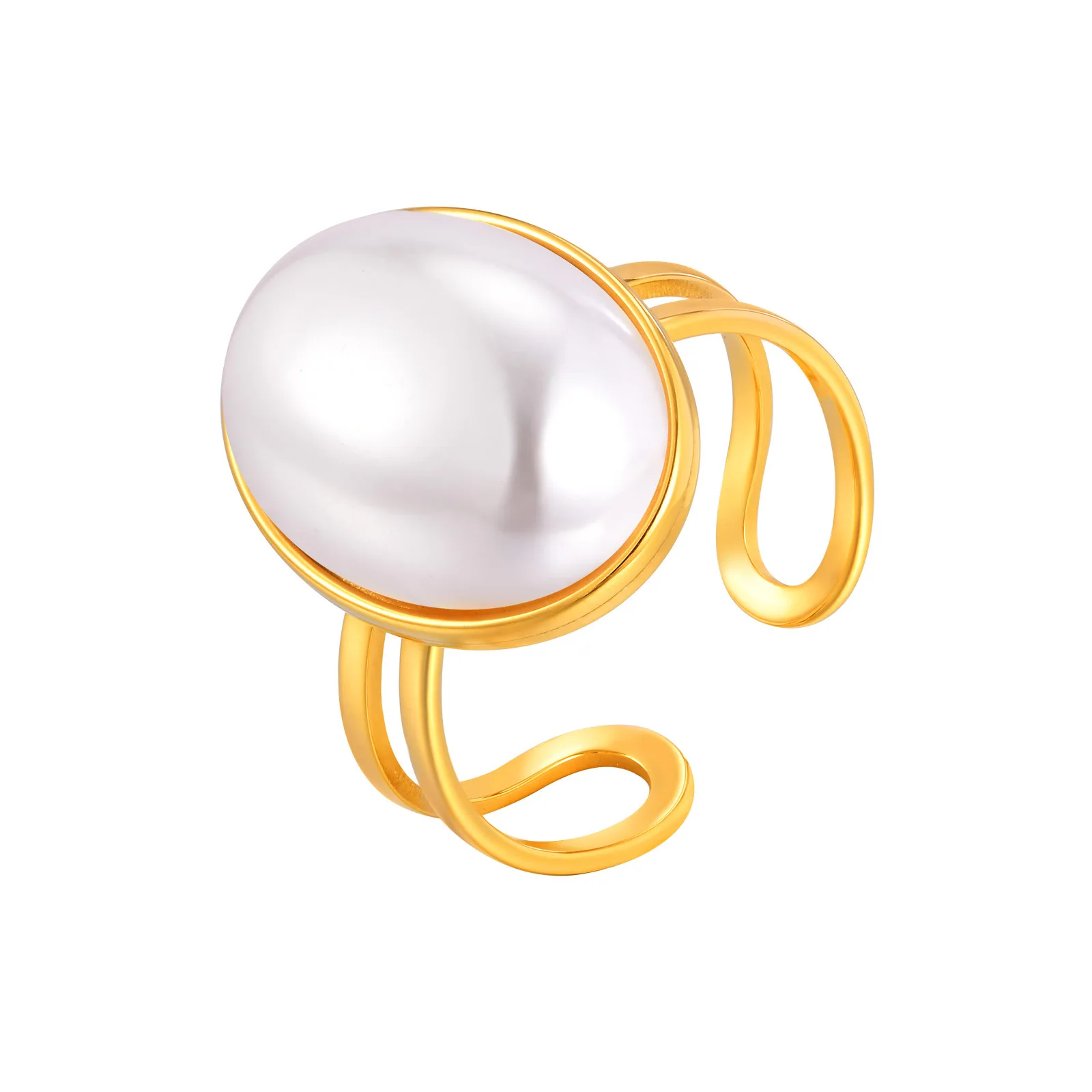 Elegant Temperament Stainless Steel Imitation Oval Pearl Opening Ring Women Temperament Rings Jewelry Women