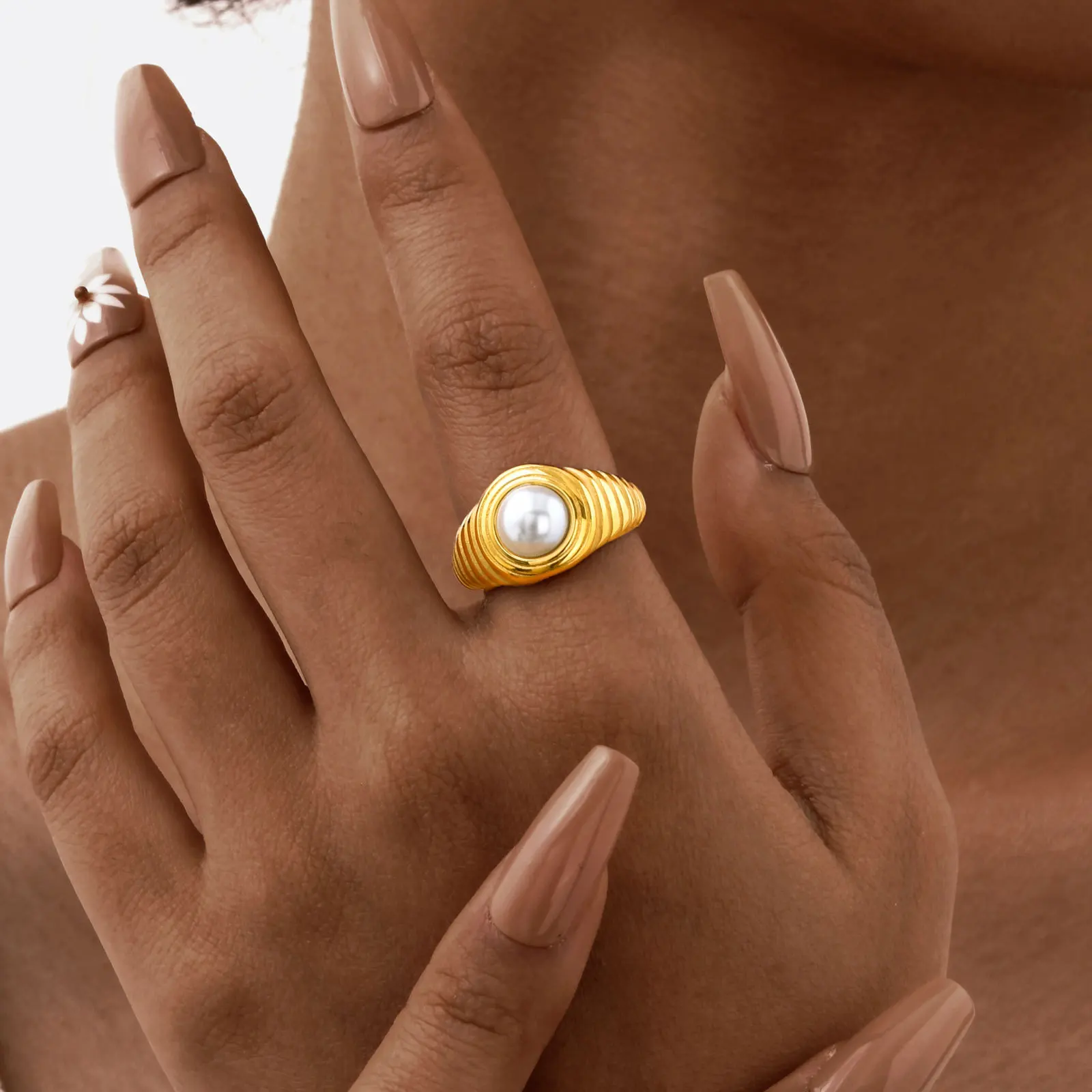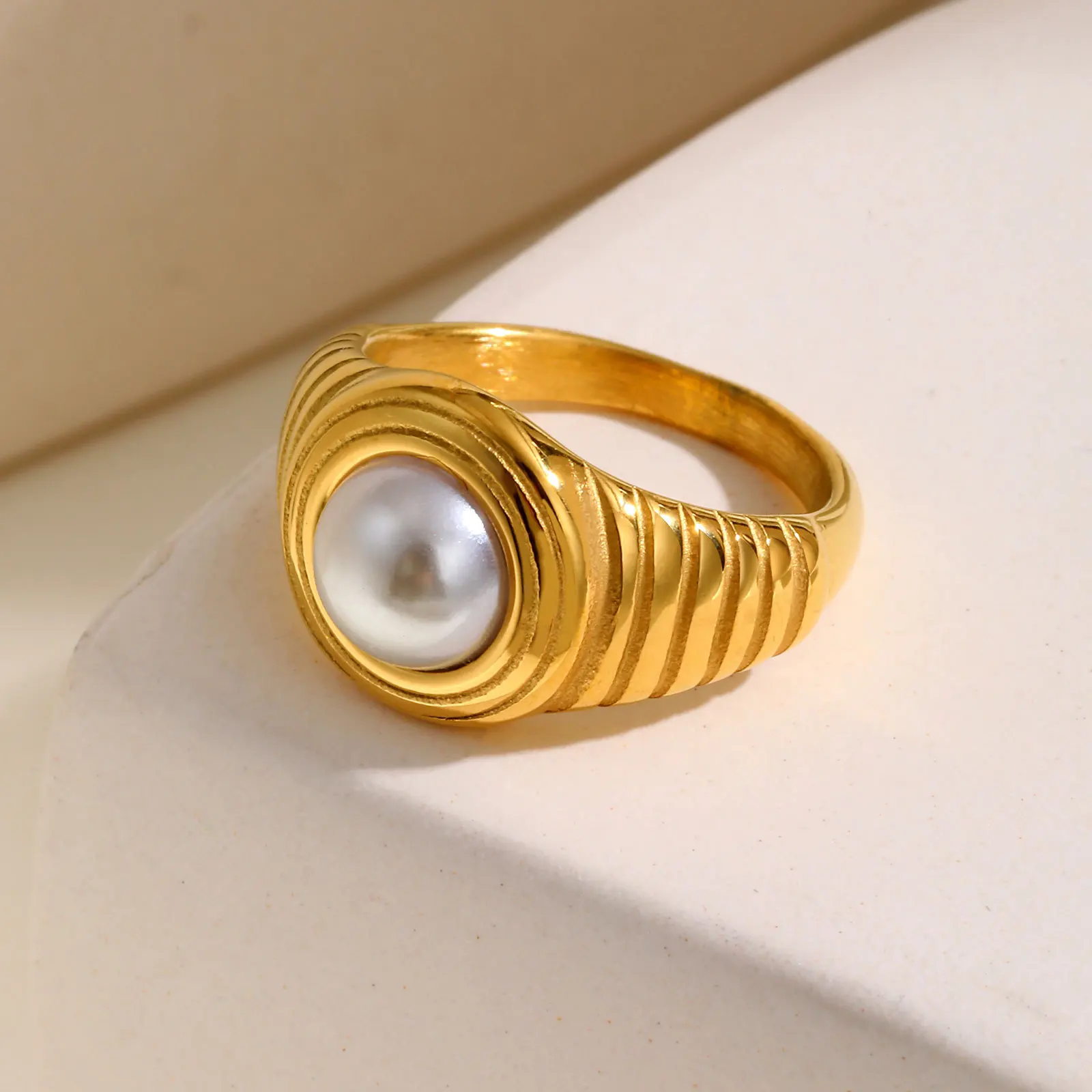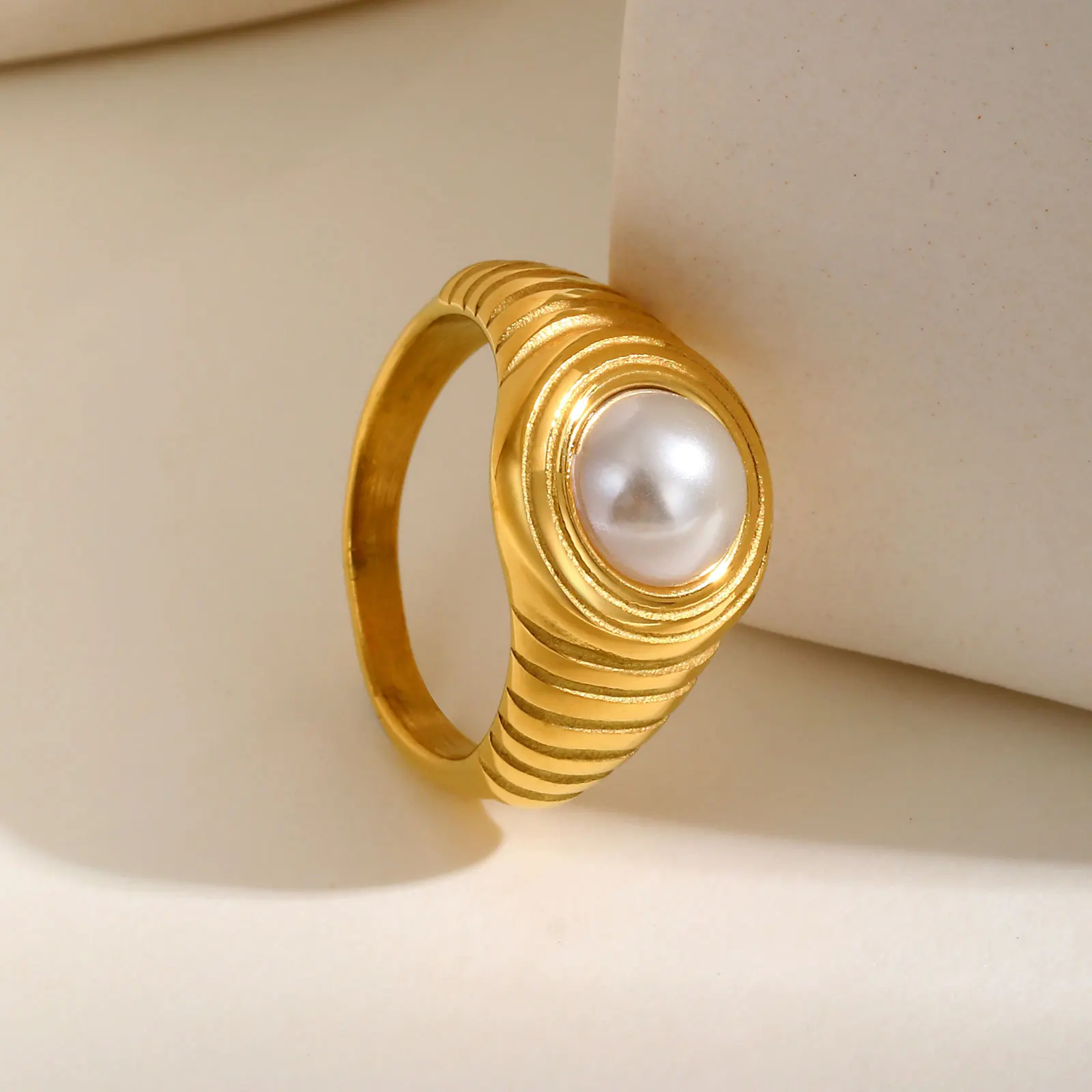 Hot Sale Minimalist Jewelry Stainless Steel Rings Gold Plated Oval Pearl Jewelry Rings for Women
