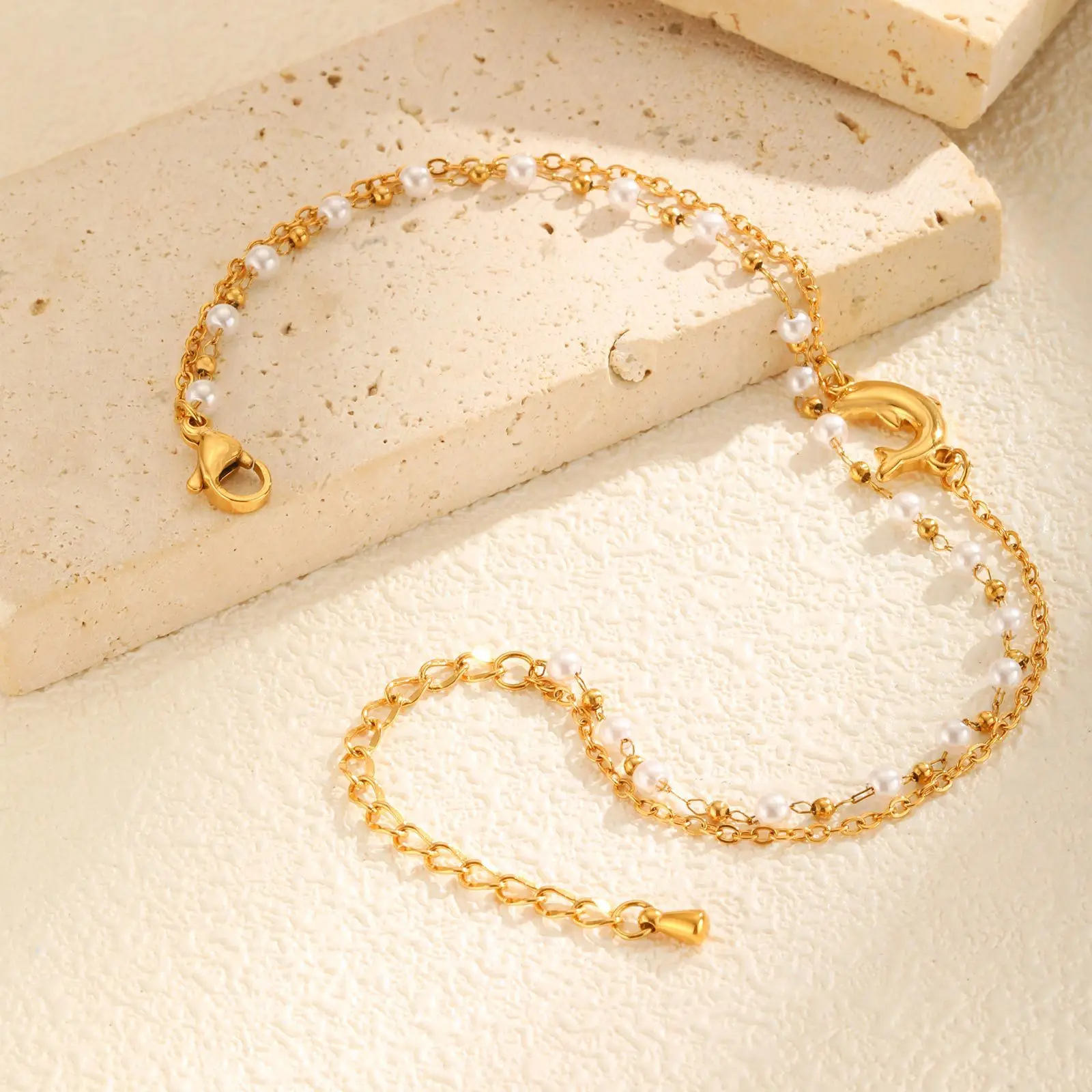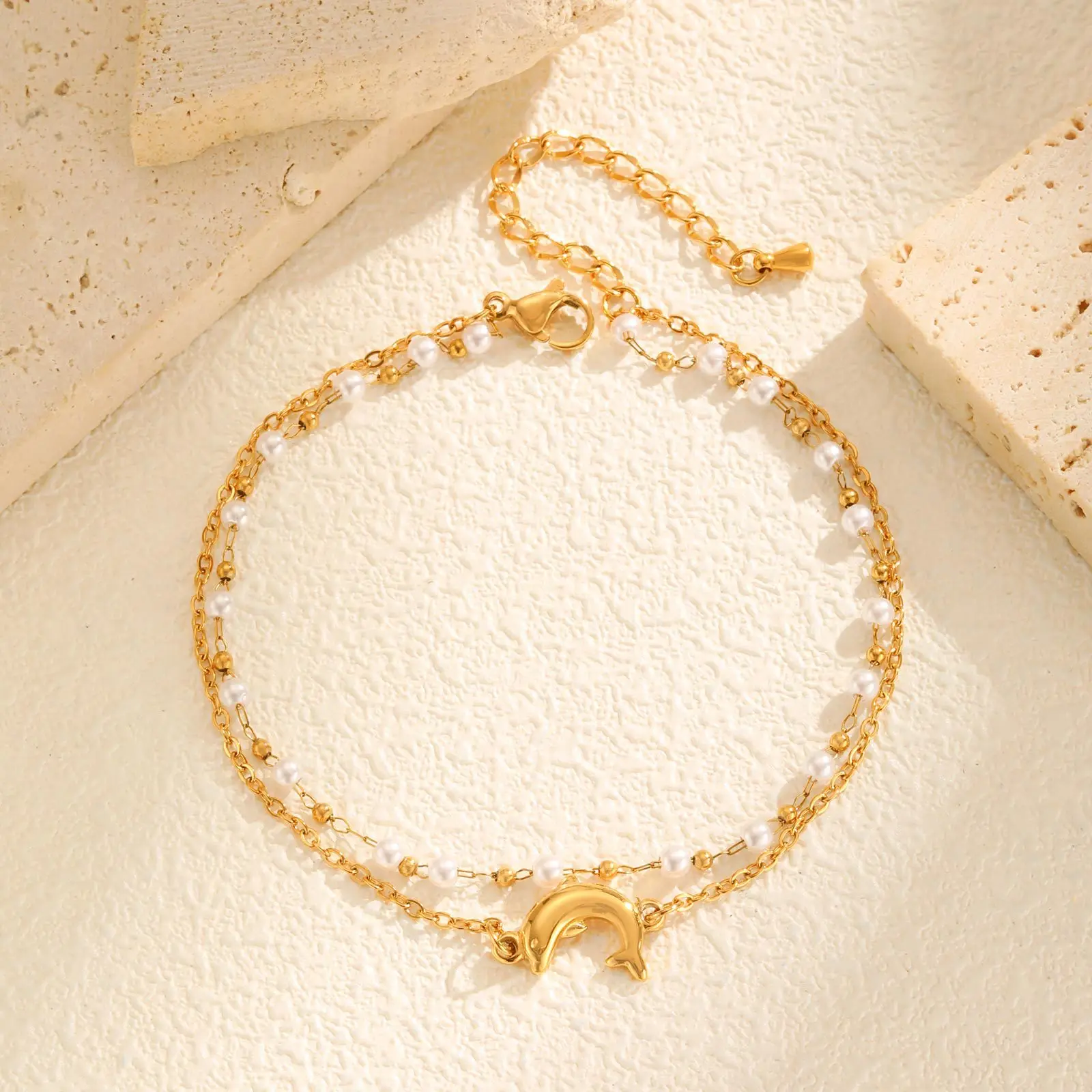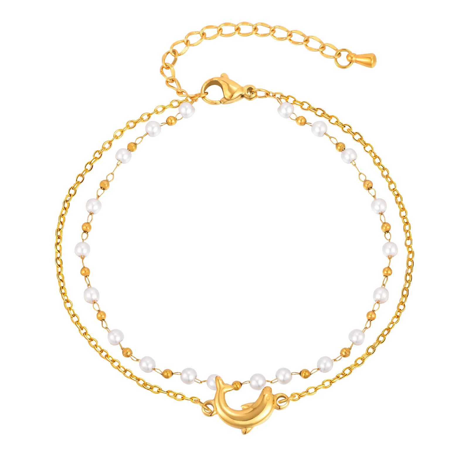 Summer Ocean Style Dolphin Shape Pendant Double Layer Chain Pearl Bracelet Stainless Steel Anklets for Women