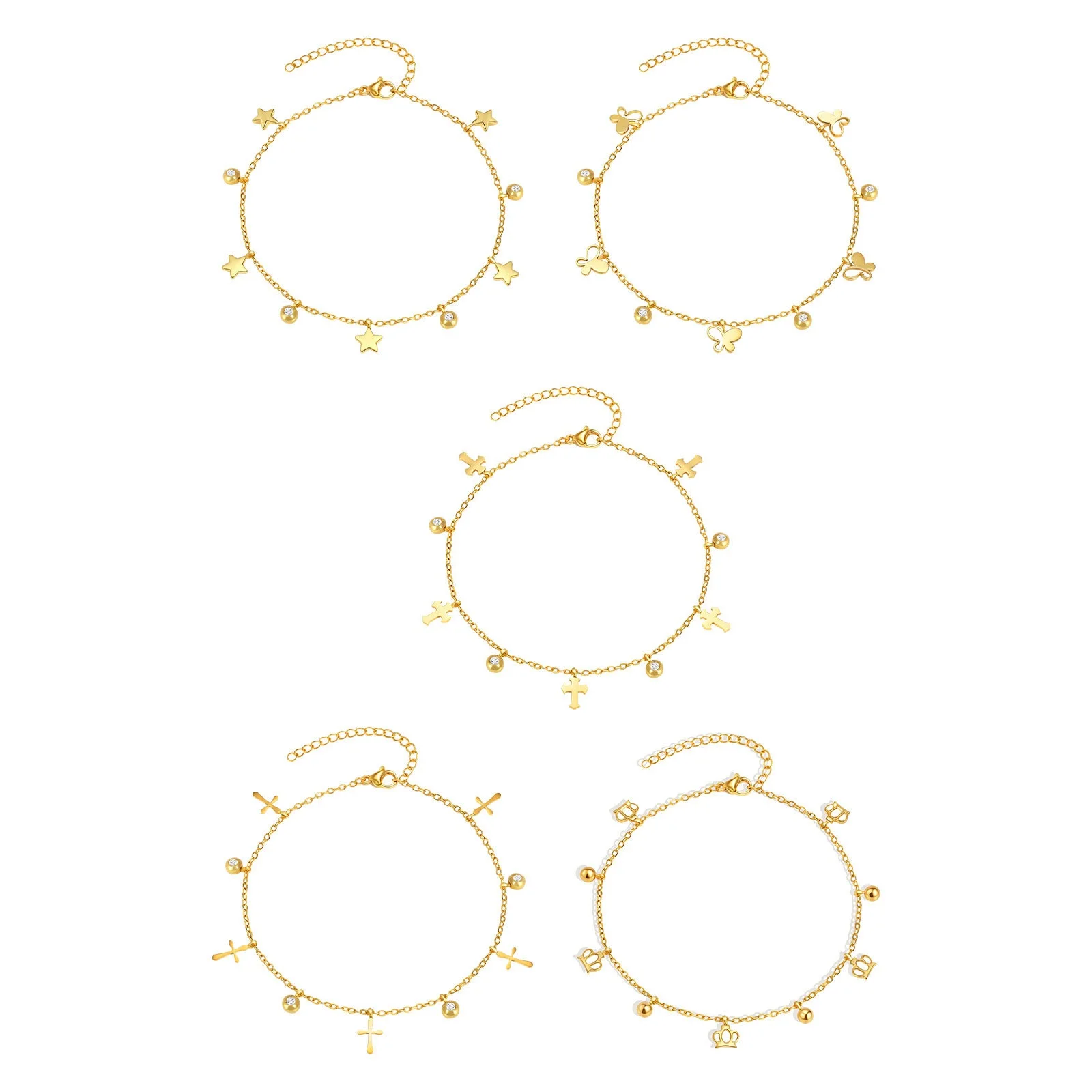 Summer Fashion Flower Cross Crown Zircon Pendant Anklet Stainless Steel Jewelry Chain Charm Anklets for Girls