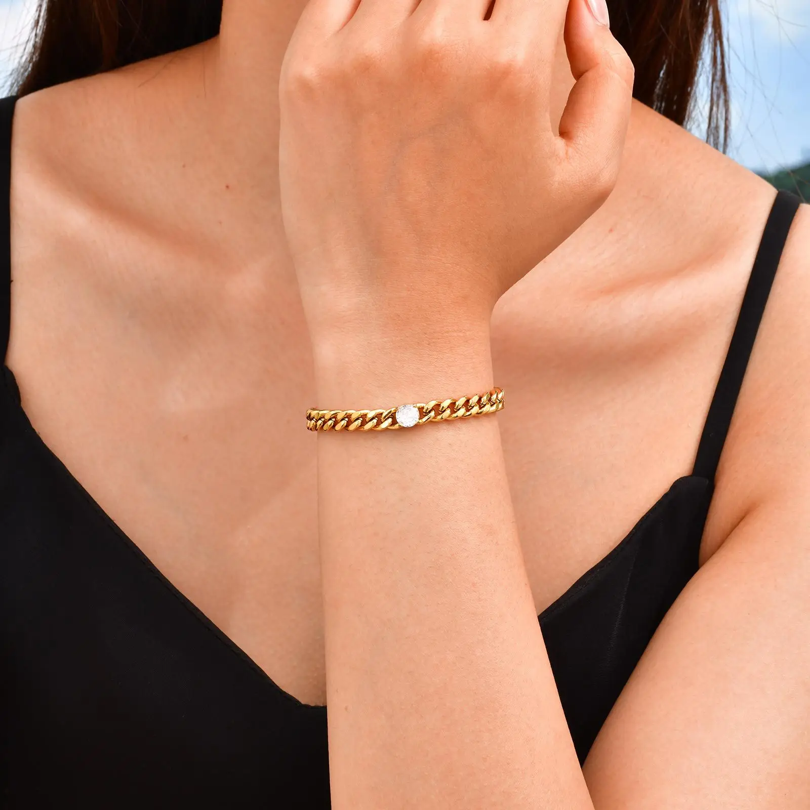 Fine Tarnish Free Dainty Jewelry Stainless Steel Waterproof Chunky Thick Cuban Chain Zircon Bracelets Gold Plated Bracelets