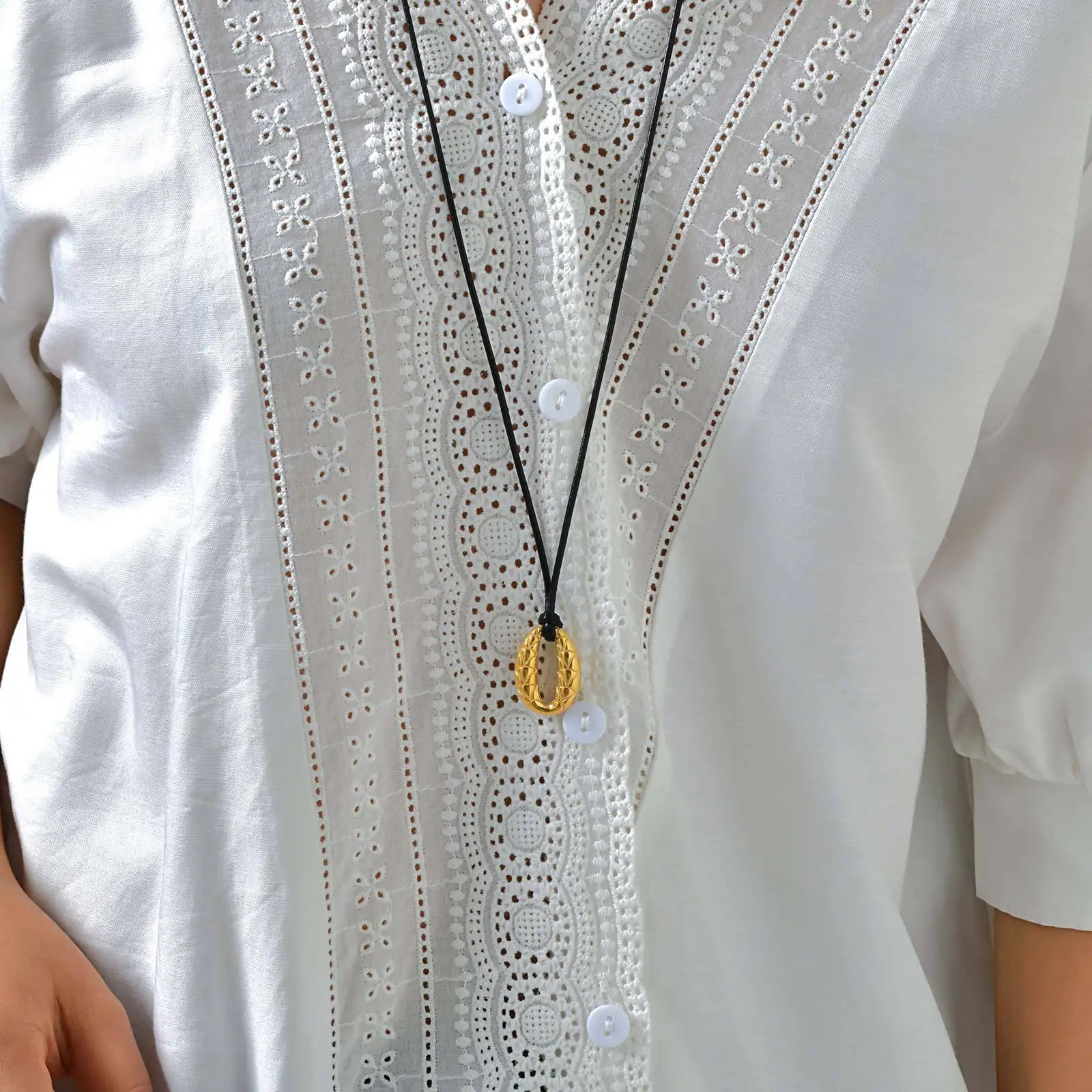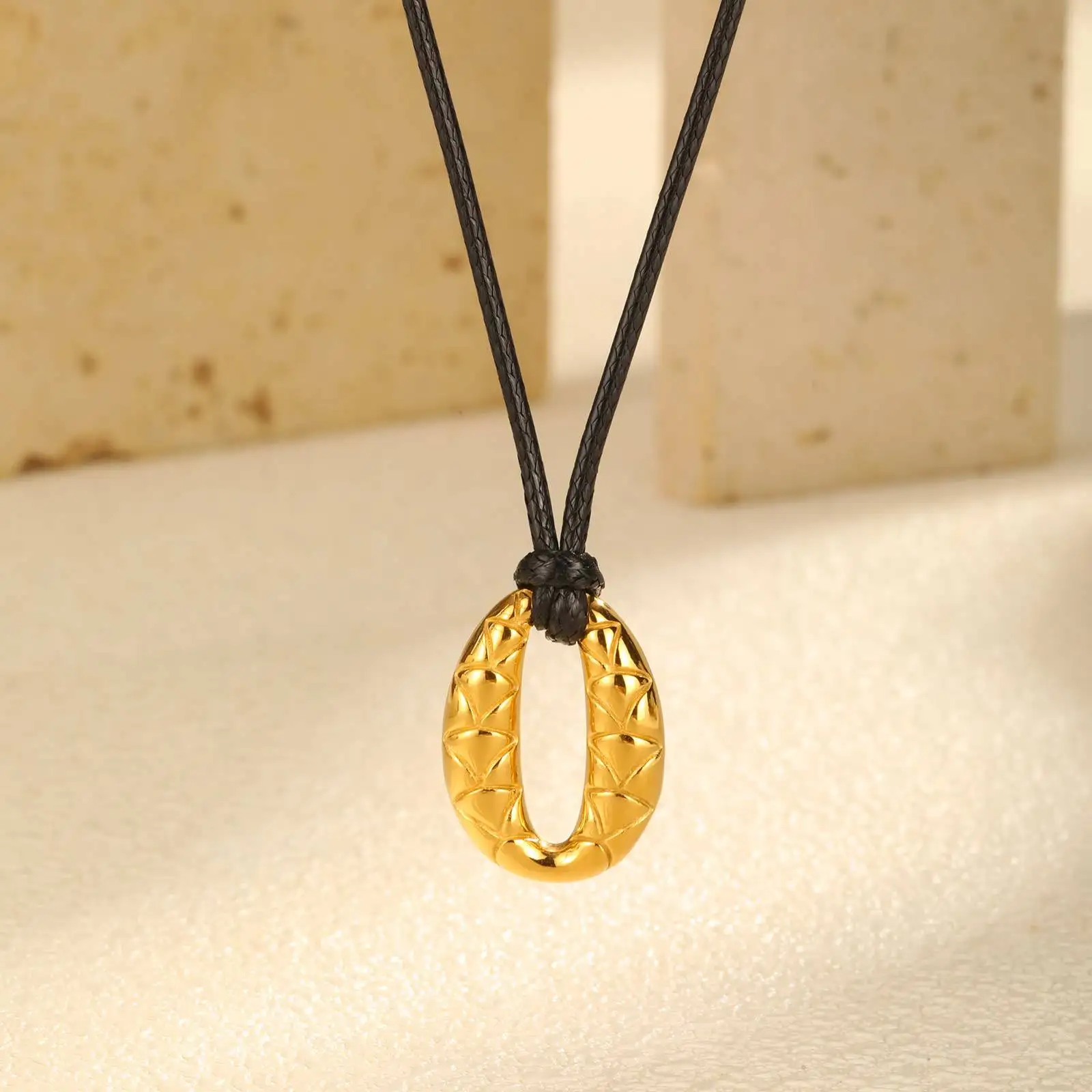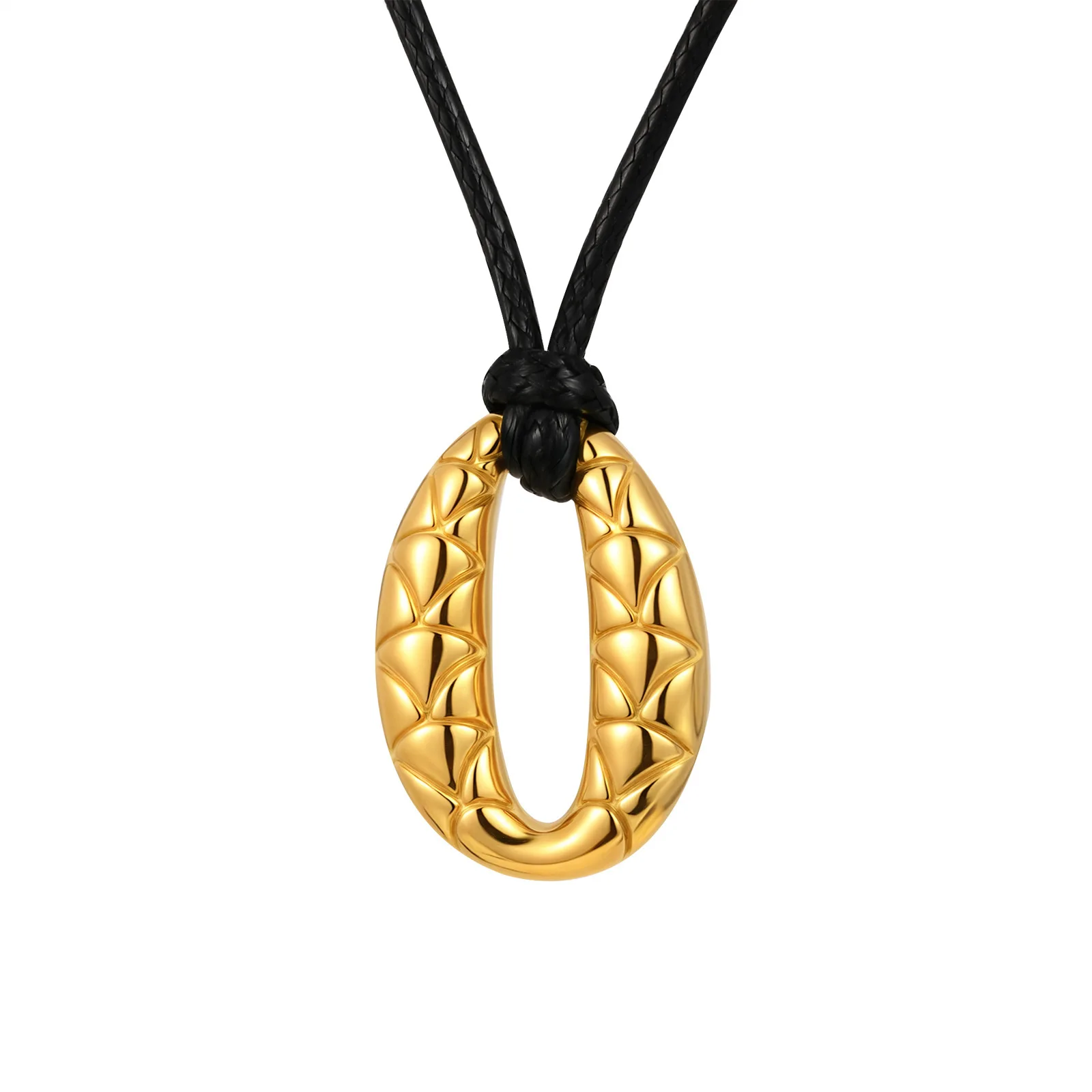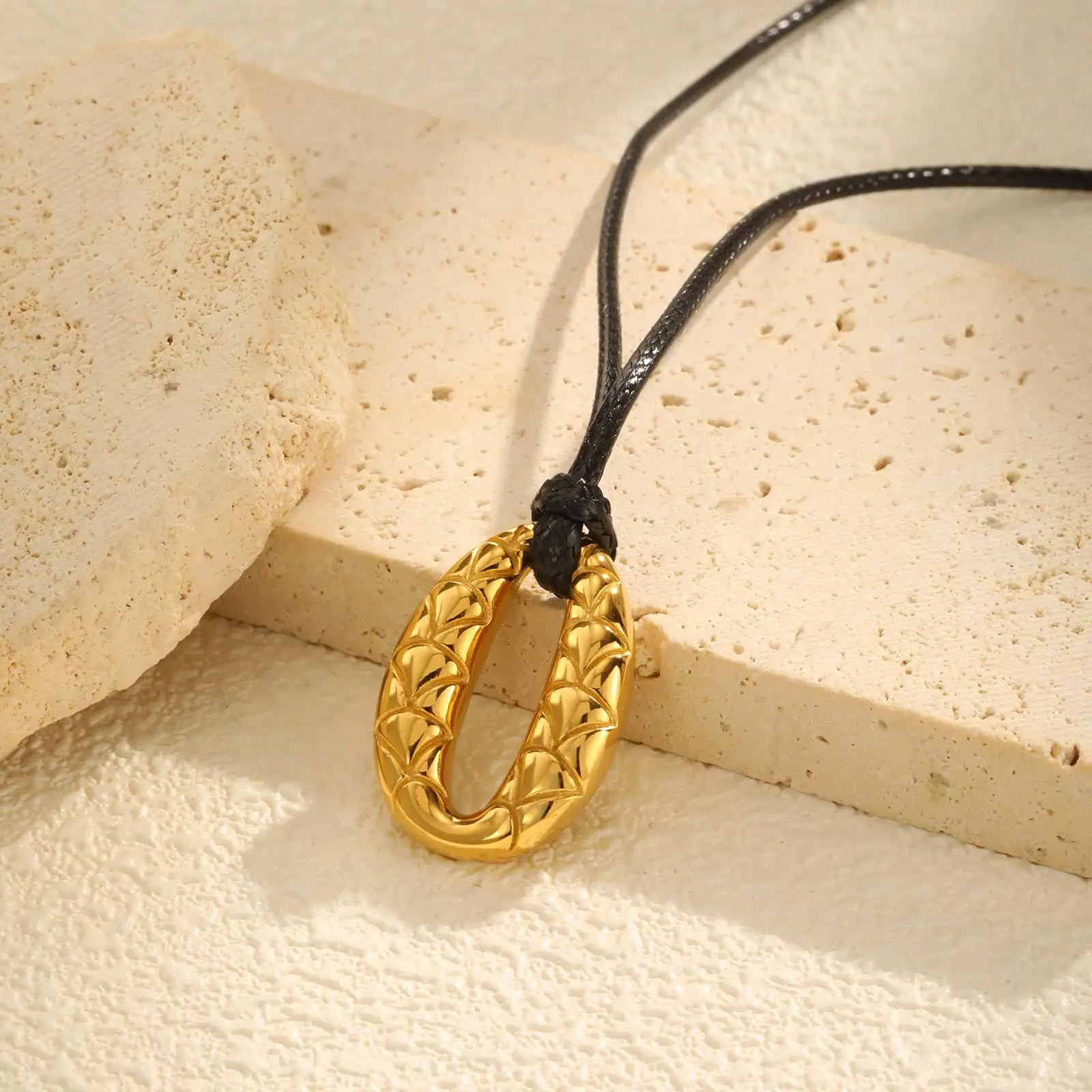 Fast Delivery Black Wax Rope Adjustable Necklace Gold Plated Stainless Steel Fish-scale Pattern Oval Pendant Necklace