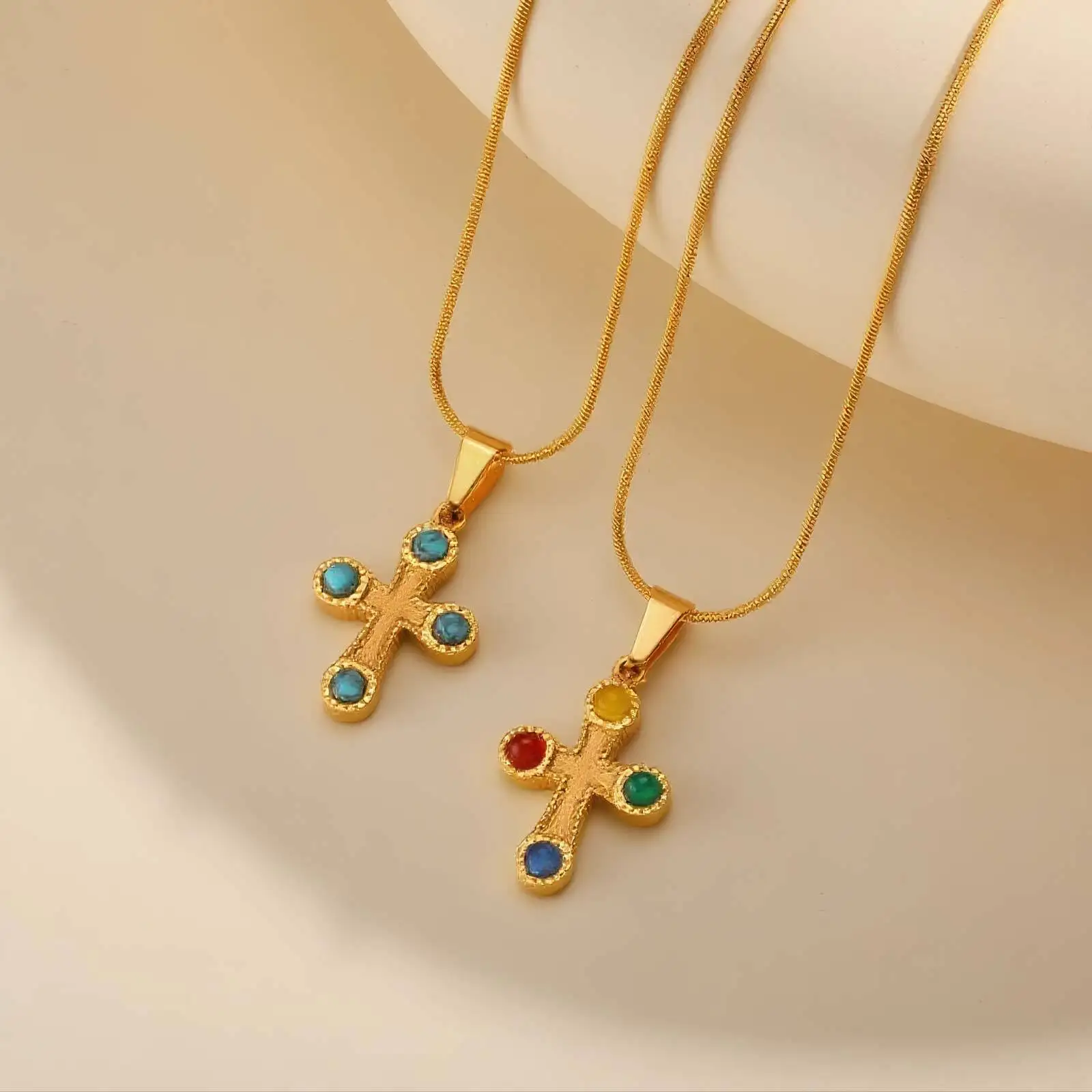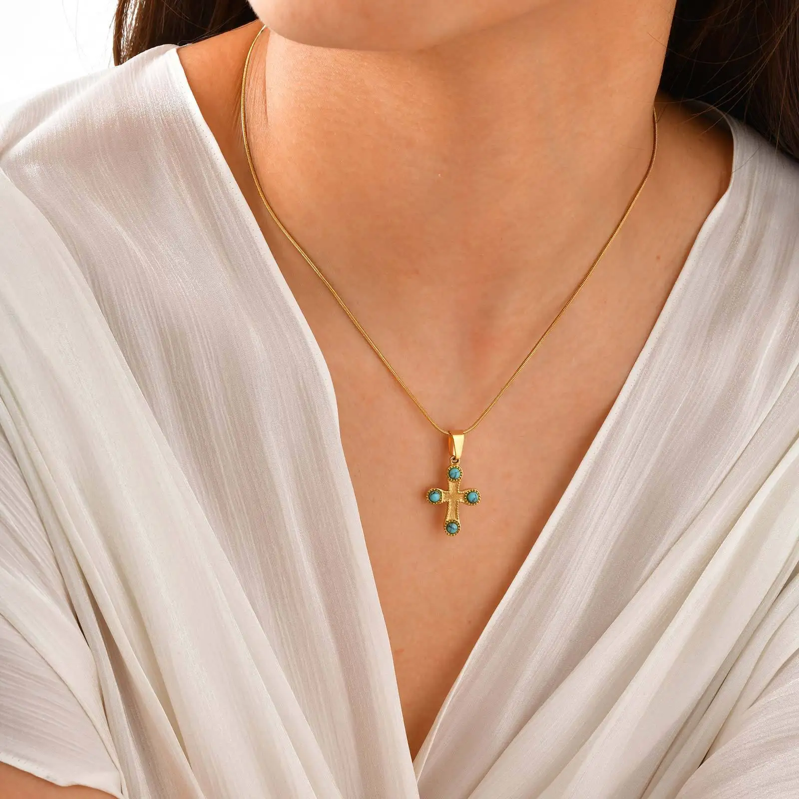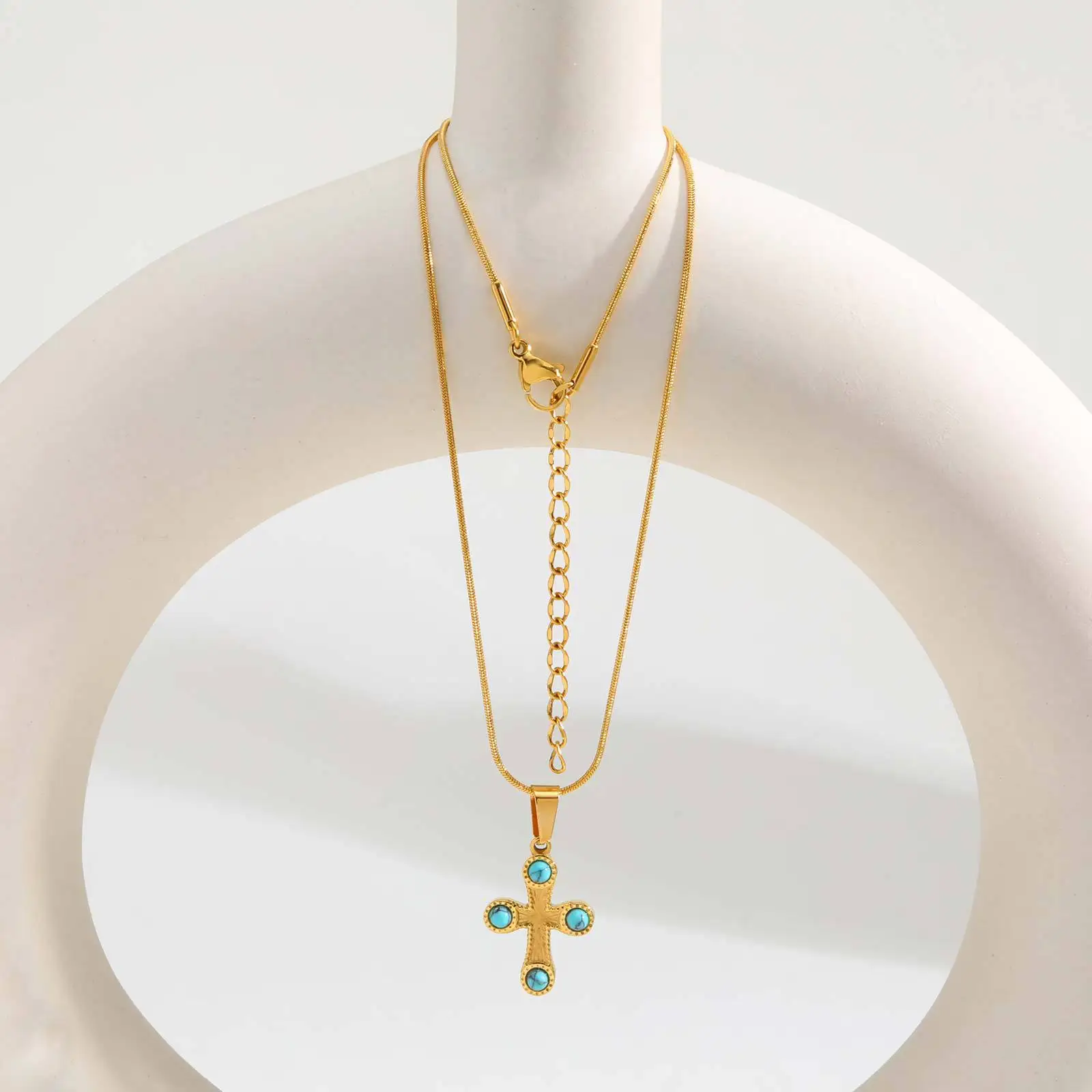 Women Versatile Daily 18k Gold Natural Blue Turquoise Cross Pendant Necklace Stainless Steel Jewelry Necklace