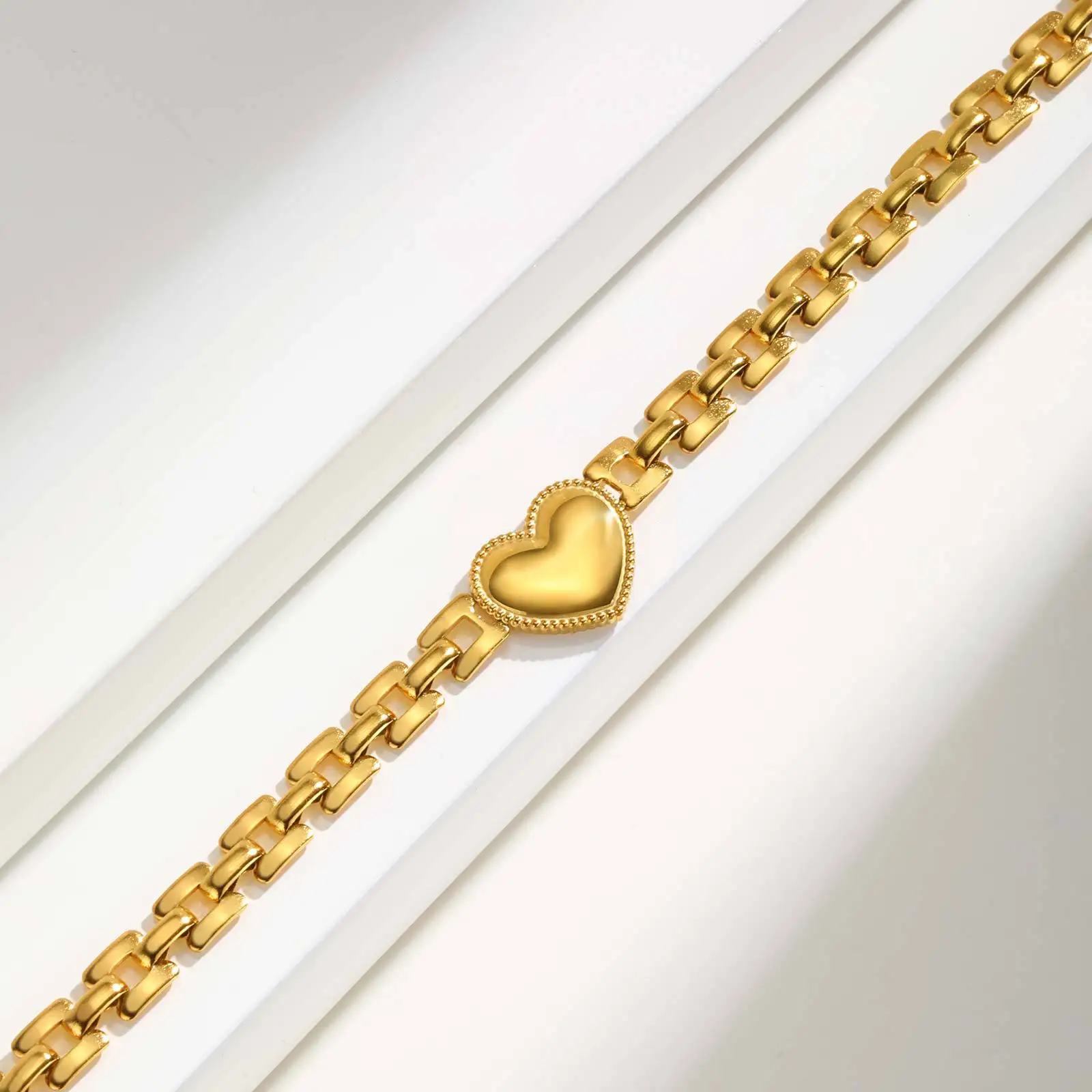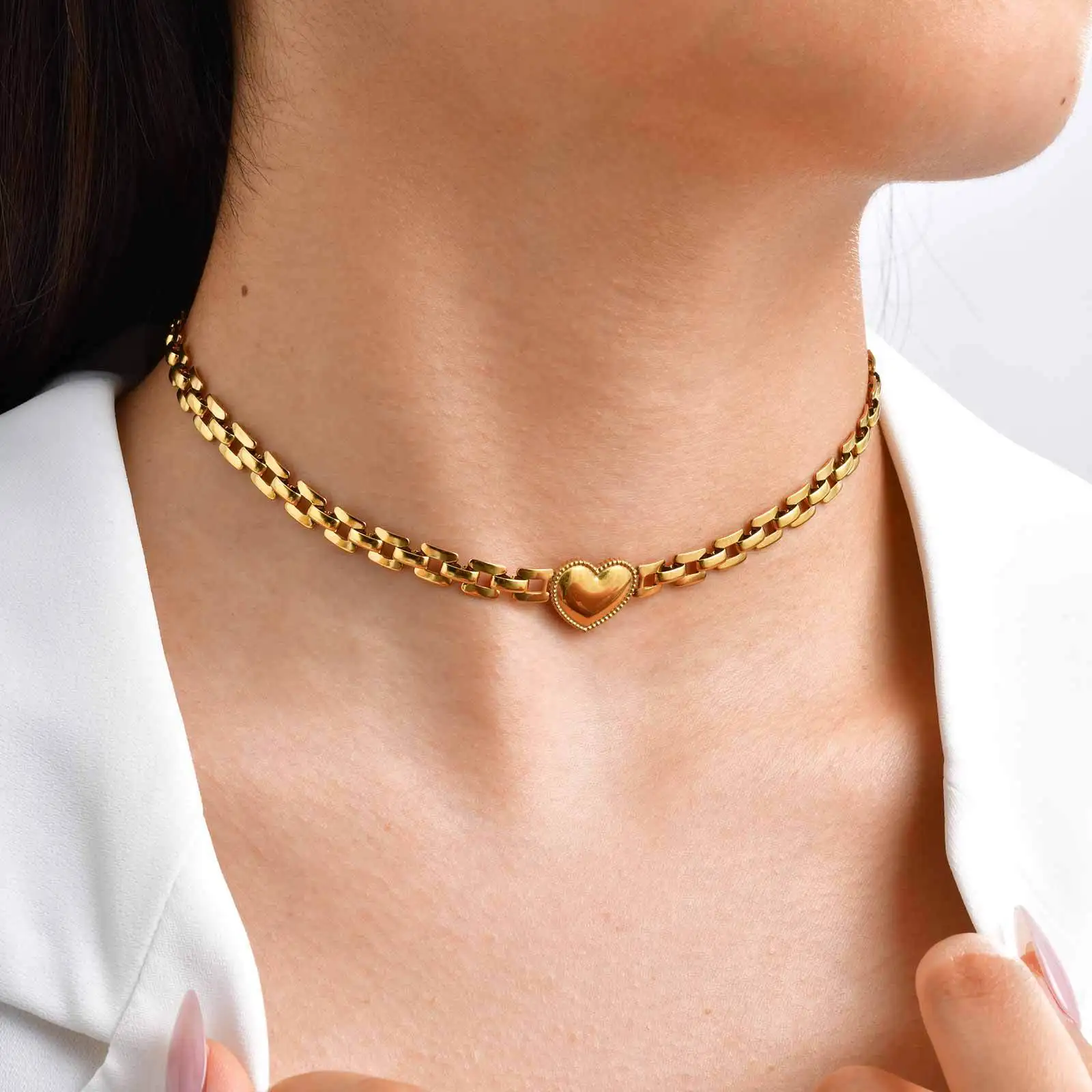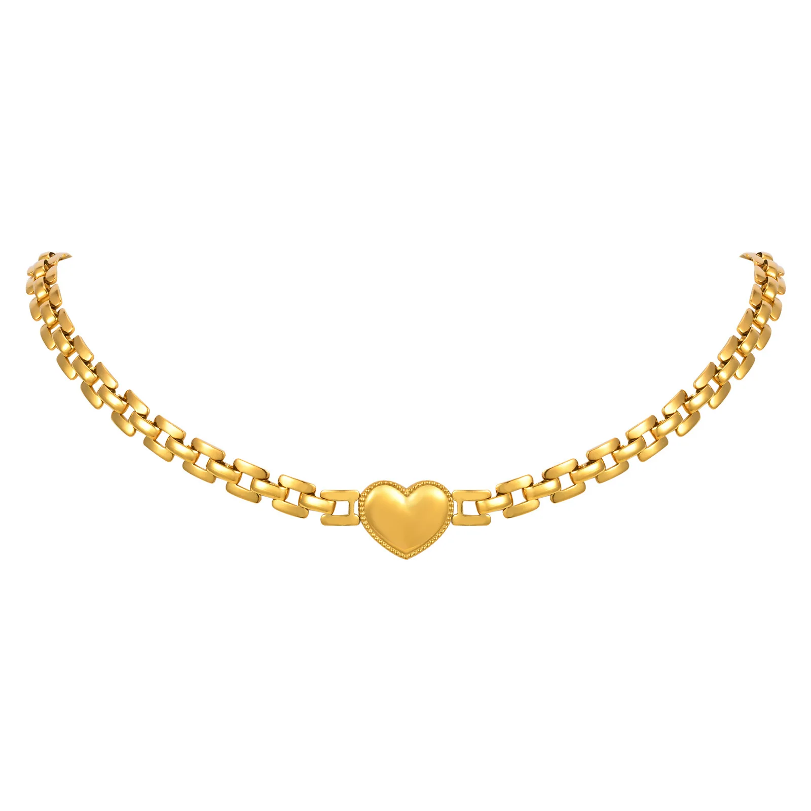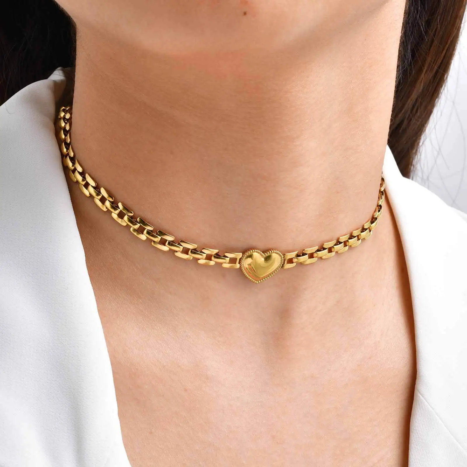 Trendy Gold Plated Heart Strap Chain Bracelet Stainless Steel Chunky Link Chain Heart Choker Necklace