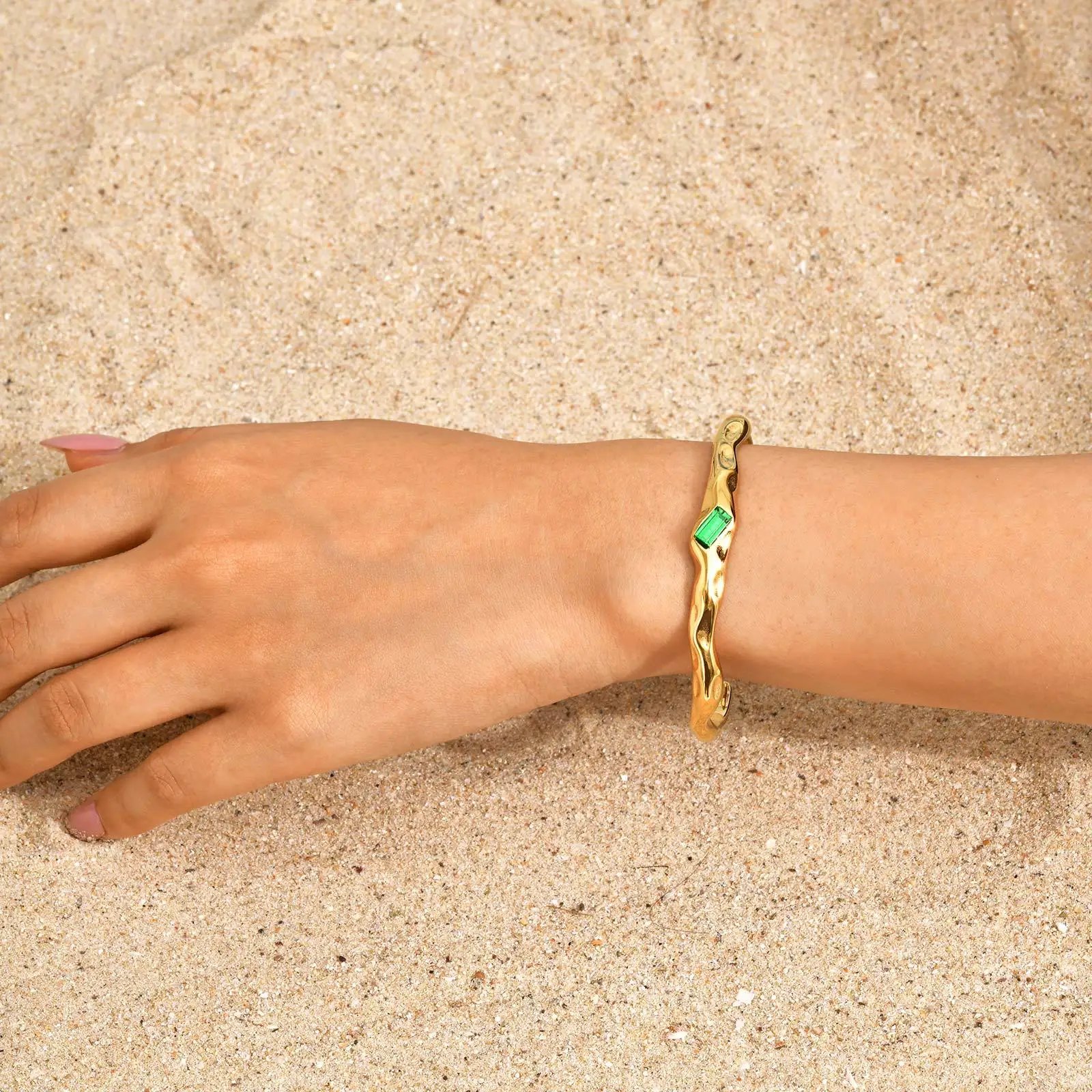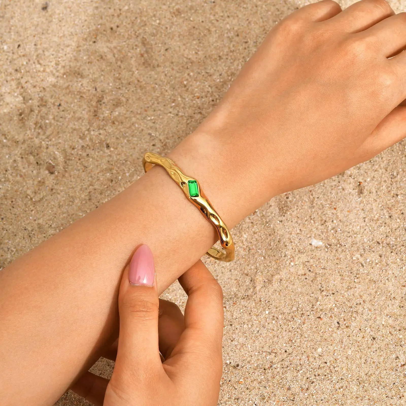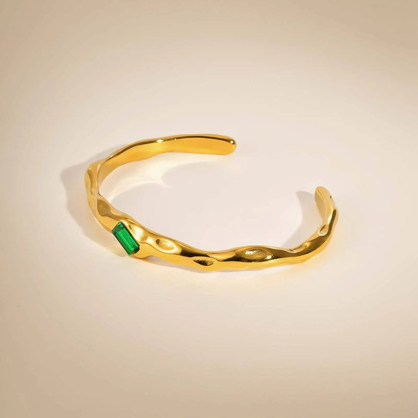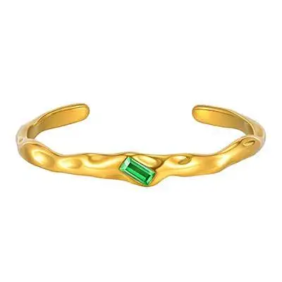 Personalized Design Adjustable Cuff Bangle Bracelet Stainless Steel Green Zircon Inlaid Gold Plated Opening Bangle for Women